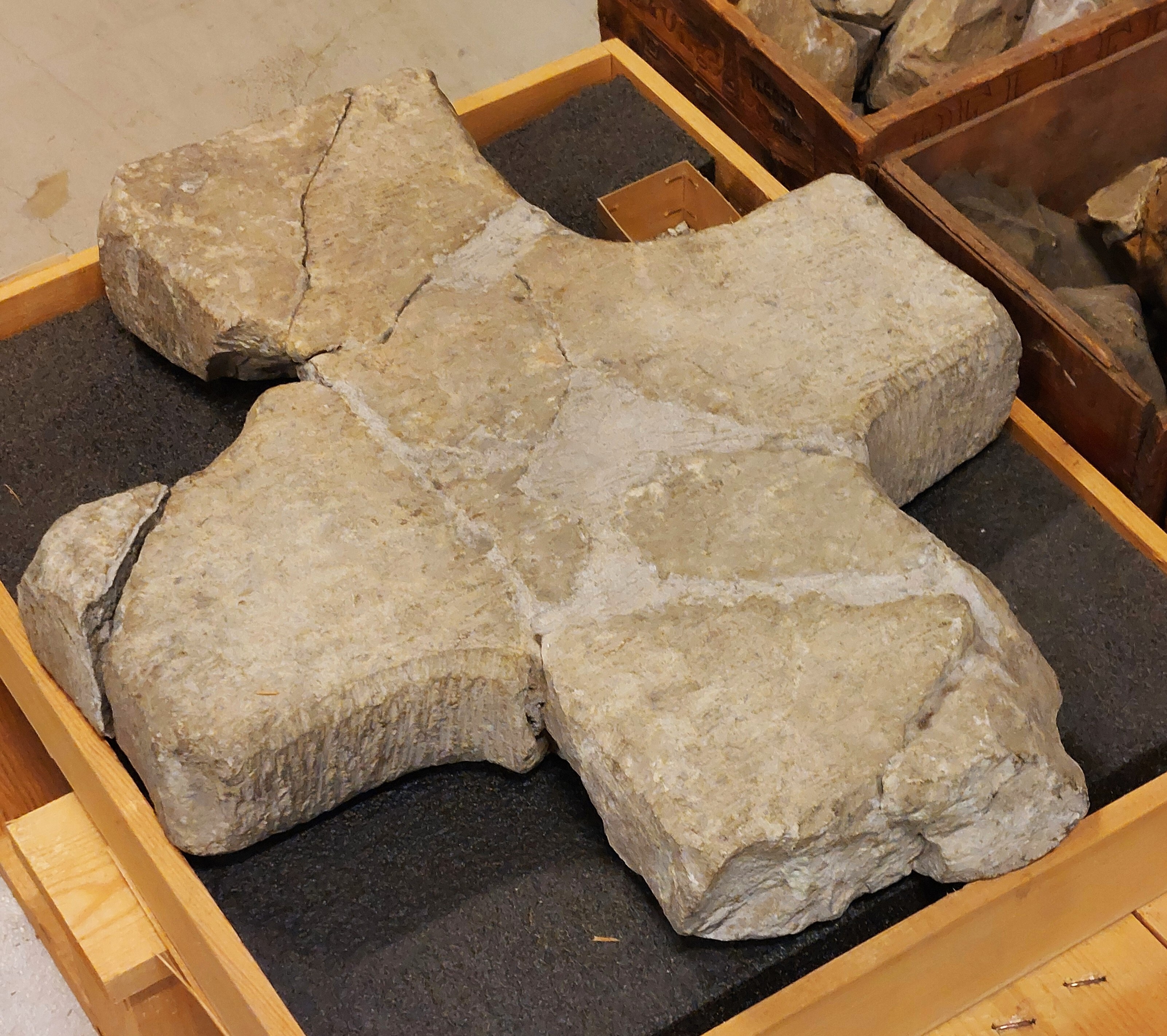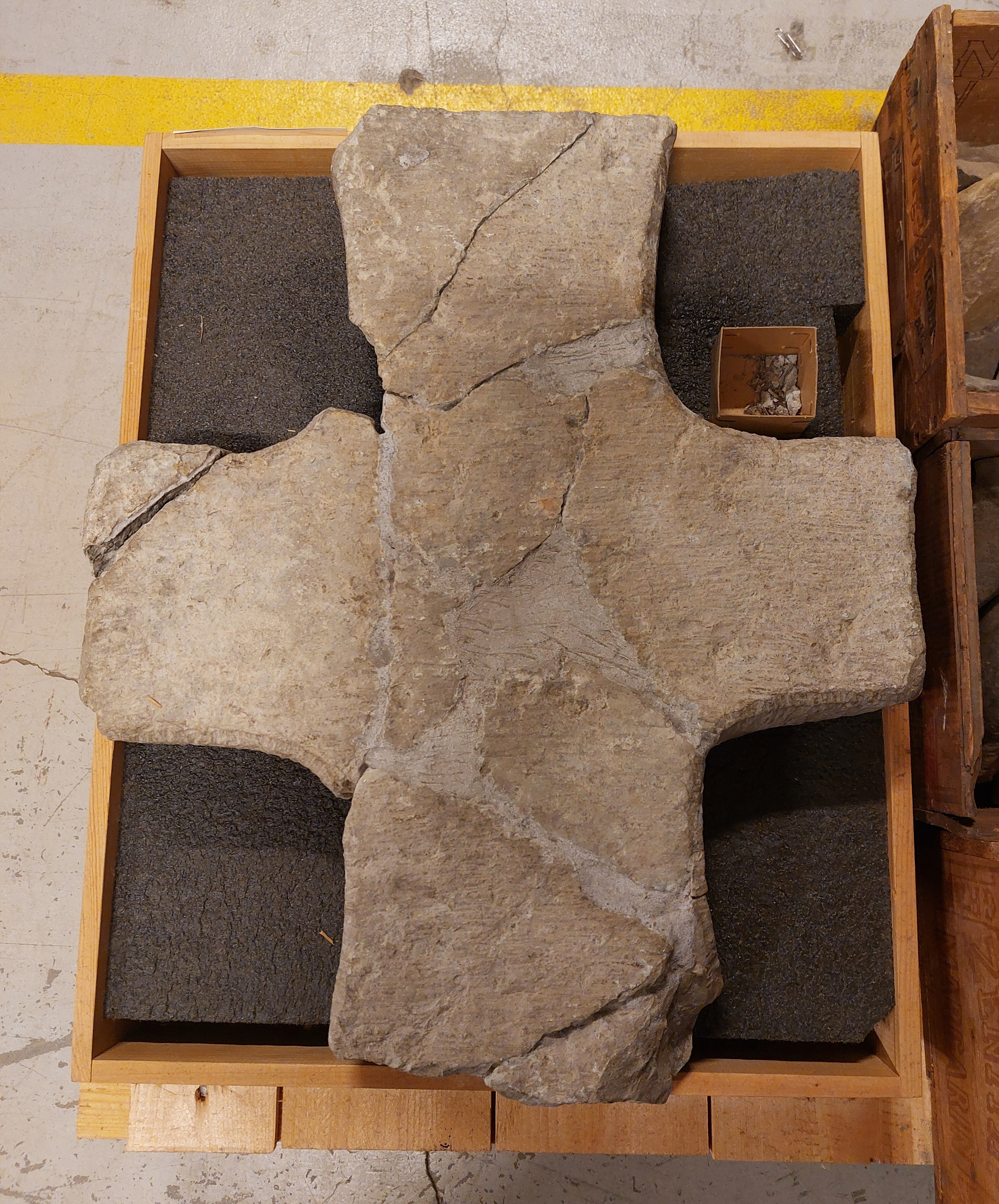 Övre delen av hugget kors där skaftet är avbrutet. Delvis ihopsatt med cement. Hugget i sandsten eller kalksten. De tre korsarmarna är lika långa men skaftet har varit längre än det är idag. Huggspår på kortsidorna. Troligen gravkors eller byggnadsdetalj till kyrkan. Ena hörnet av den lodräta korsarmen har eget fid 45407_HST men går att sätta ihop med den större delen