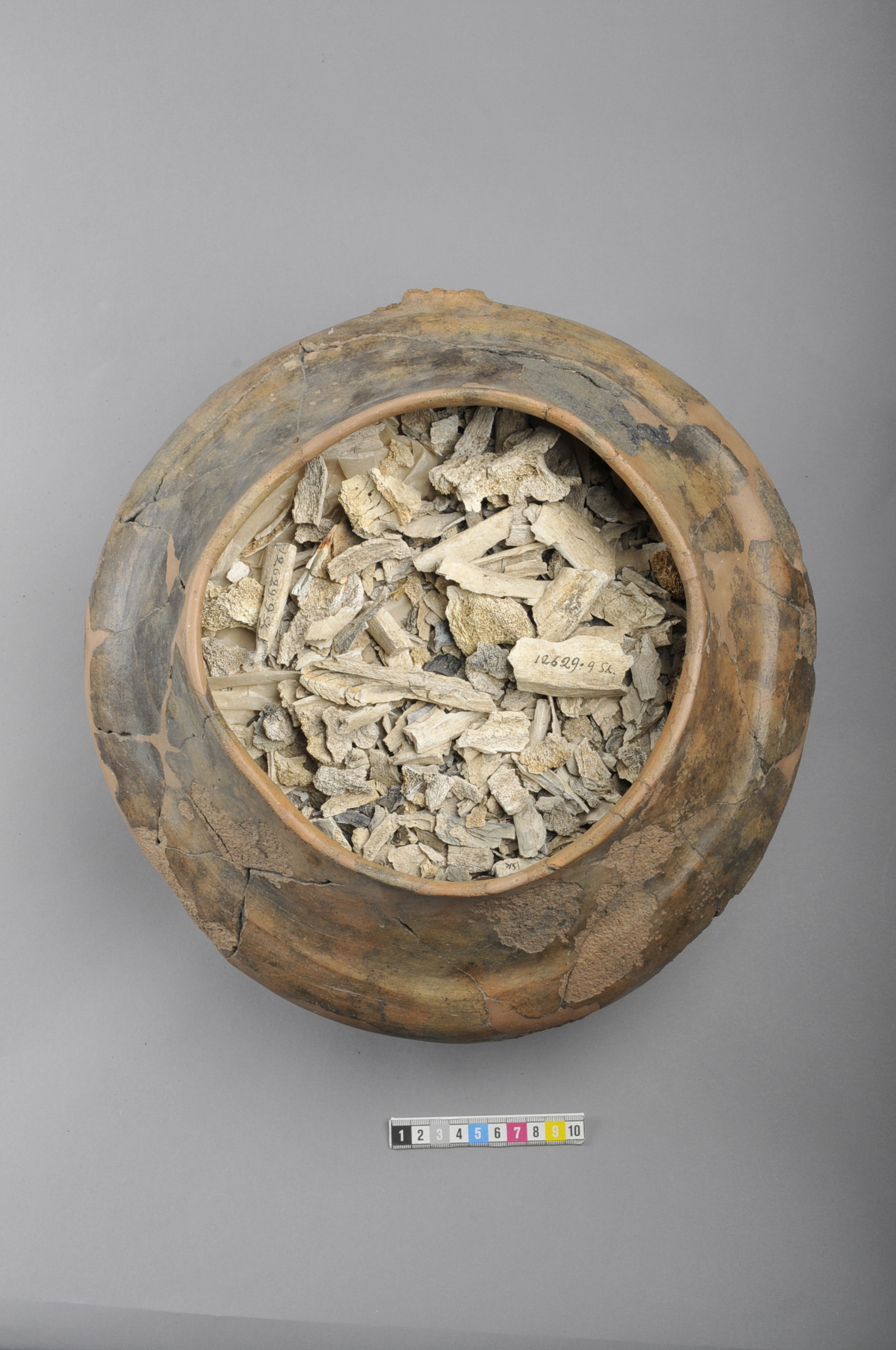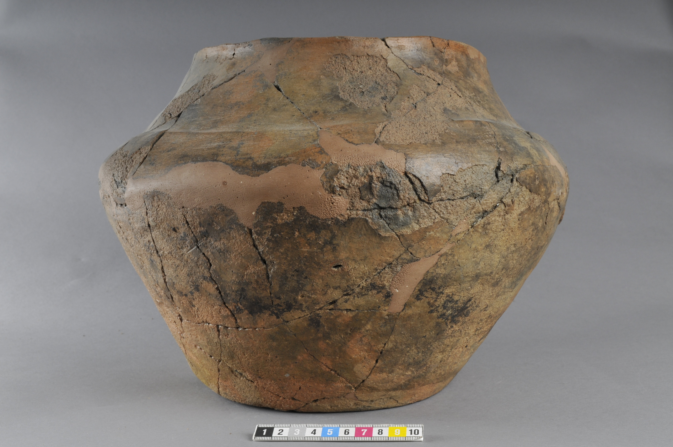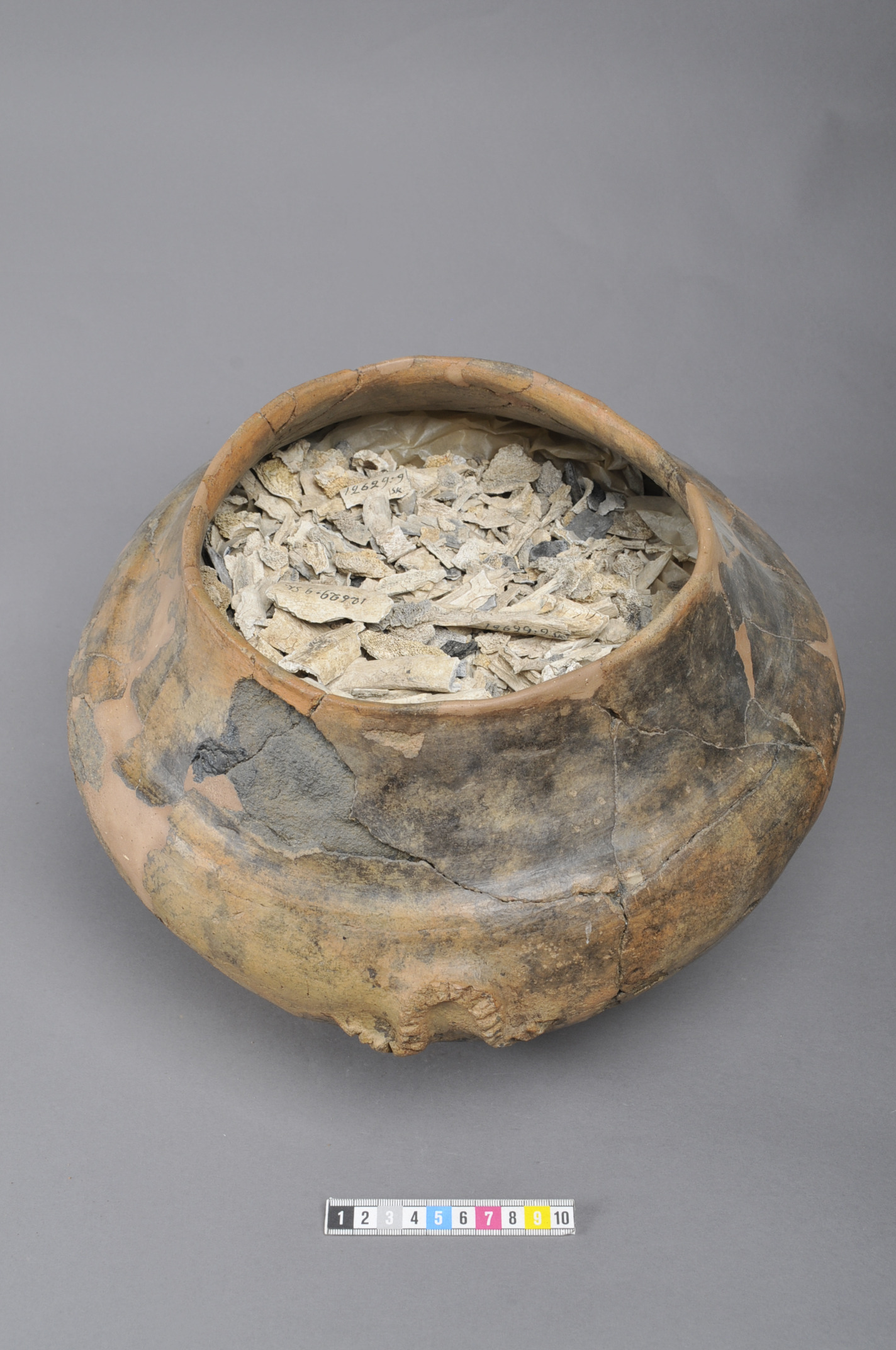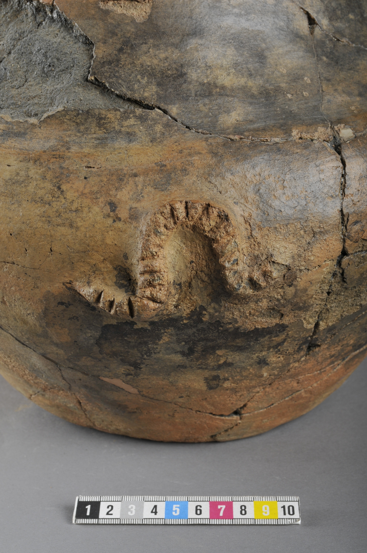 Stort lerkärl, delvis rekonstruerat. Skarpt utsvängt bukparti och inåtsluttande hals. Över skuldran har suttit fyra stycken handtag: två knappliknande med intryckt center och två vulster, ornerade med snedstreck och formade som en ohm-symbol. Endast en av dessa vulster återstår. Ytan är ljusbrun och glättad