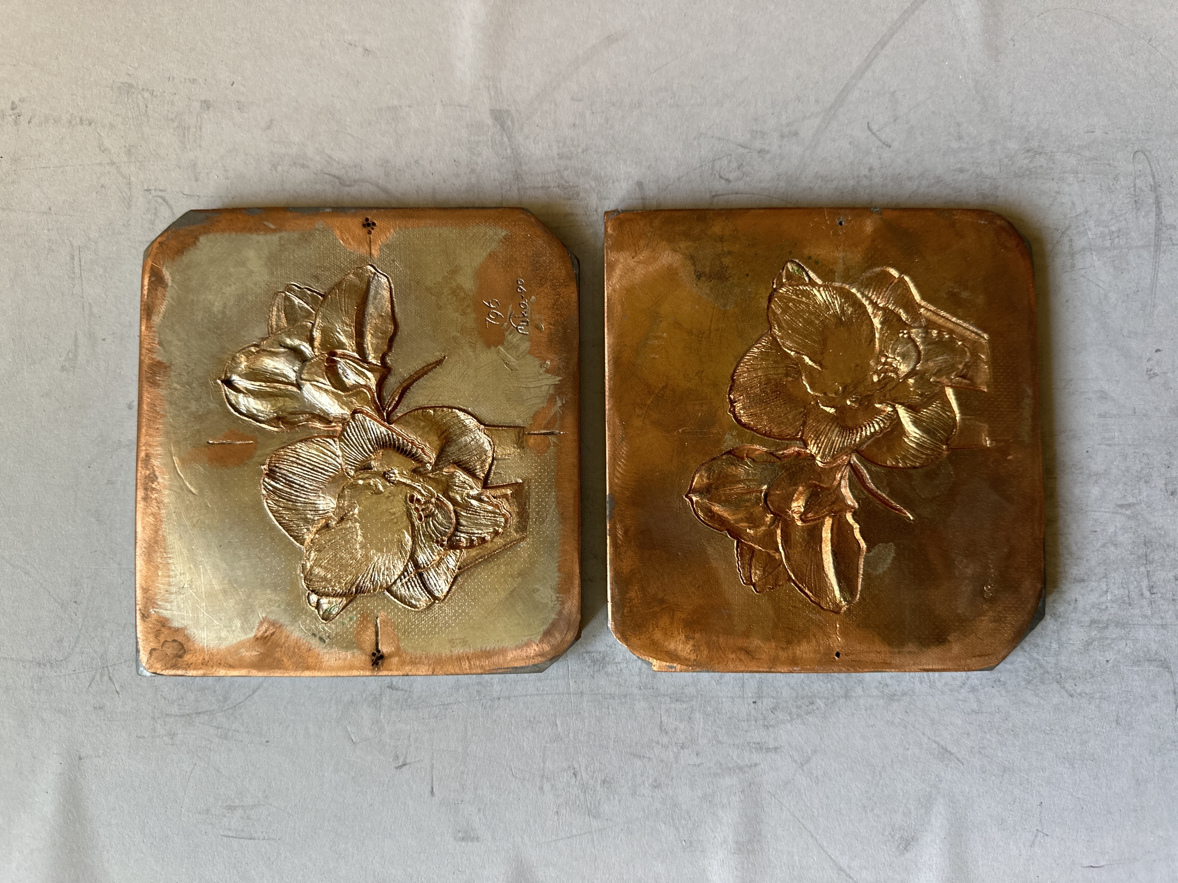 Pressplatta för vattenmärkestillverkning, med motiv av en blomma.