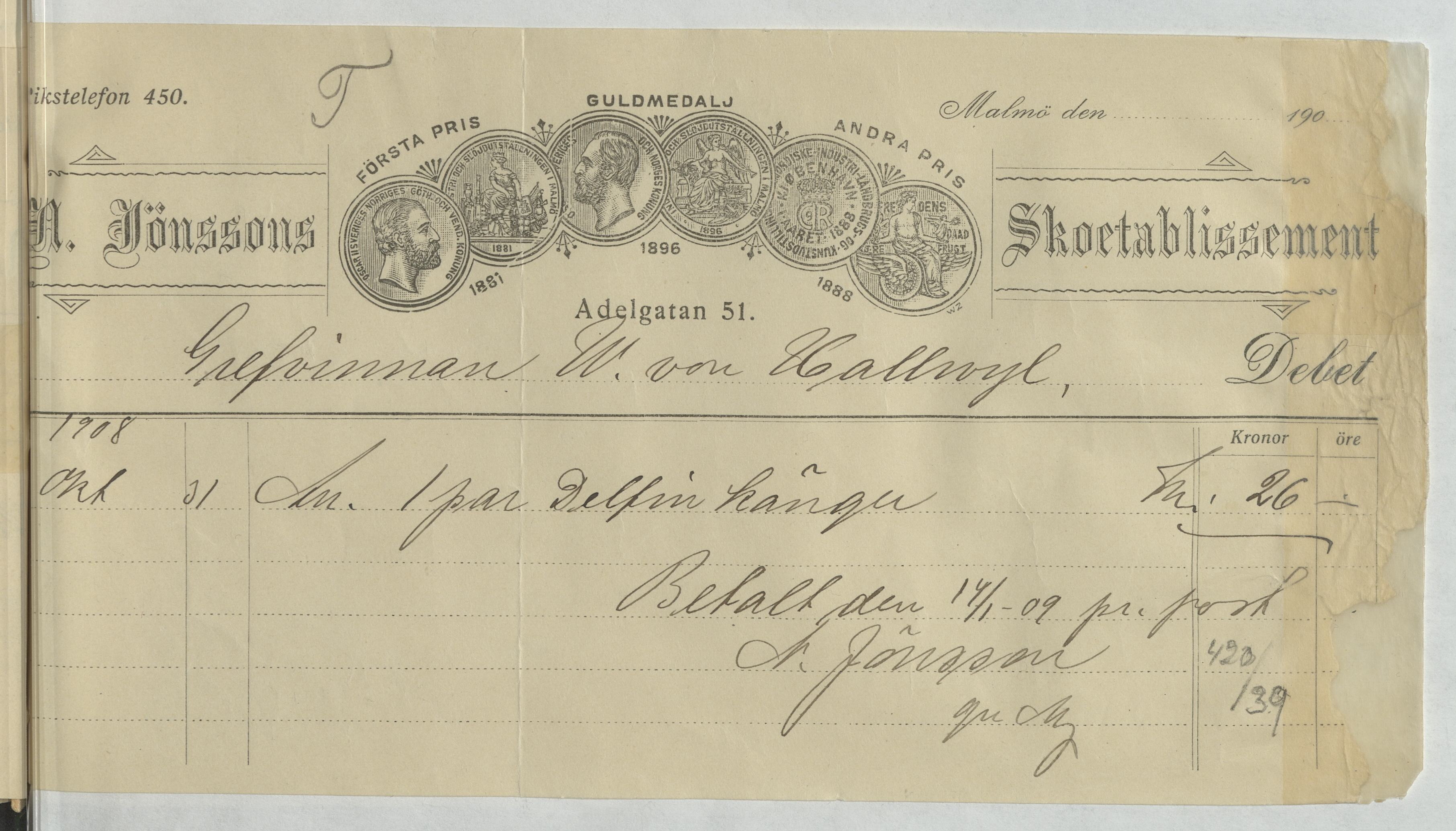 Kvitto från N. Jönssons Skoetablissement. Gällande inköp av ett par Delfin kängor. Malmö, 1908.