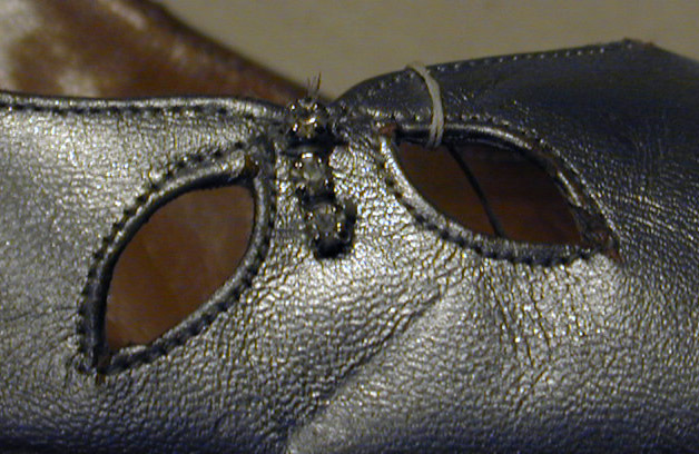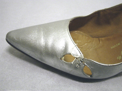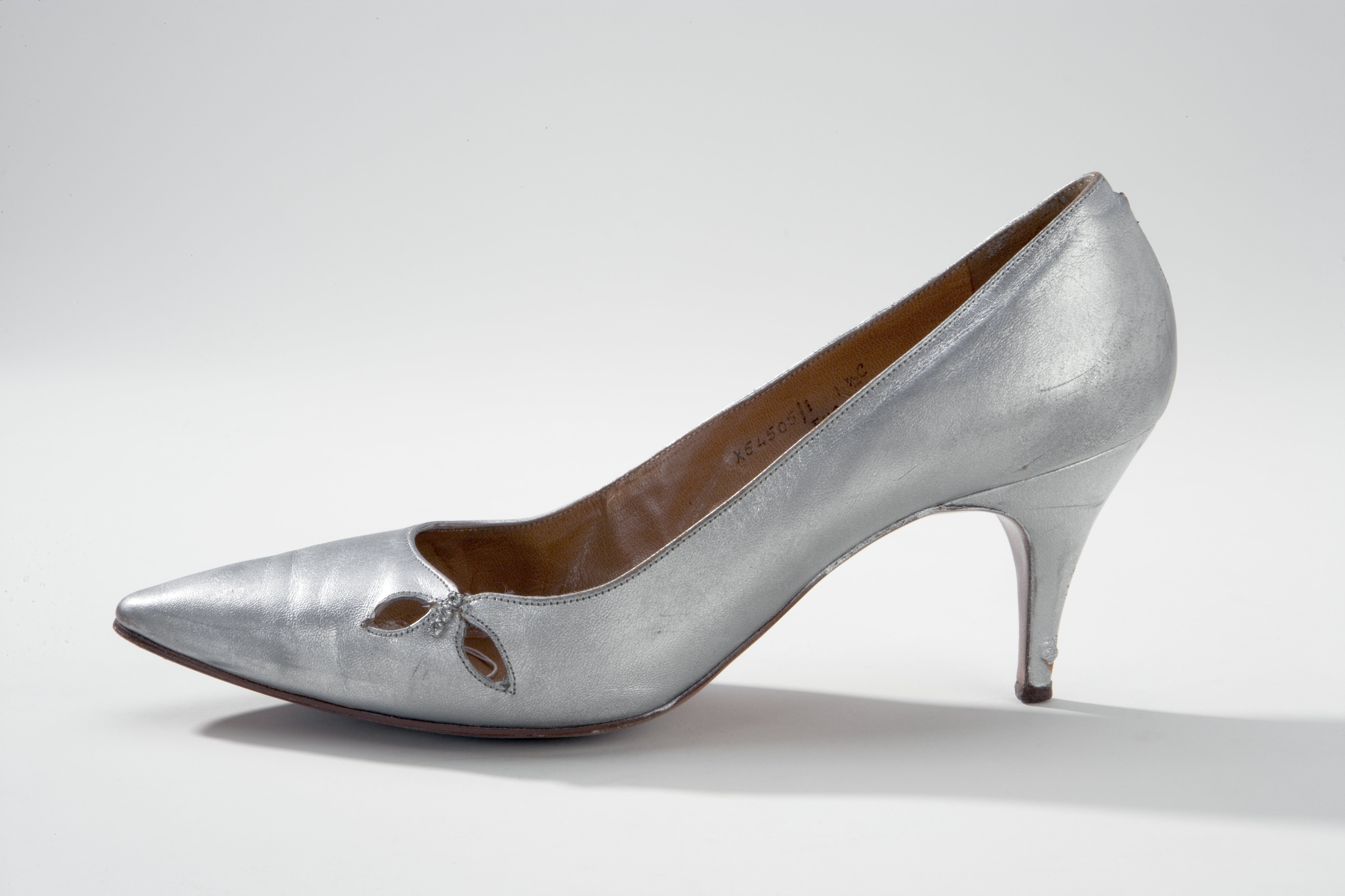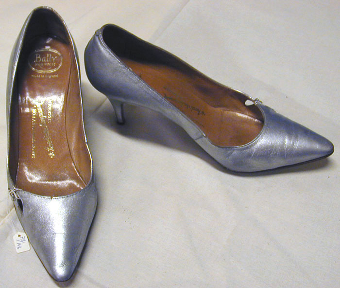 Sko av silverfärgat skinn (kalv?), med spetsig tå och söm mitt bak. Ovanlädret och bakkappan förenas med en innersöm på högra sidan. På tåpartiets vänstra sida finns två bladlika , genombrutna utskärningar. Mellan dessa är fäst ett strassmycke i form av tre infattade, slipade glasbitar. Klacken är insvängd, hög och smal samt har en brun stiftslapp fäst med en spik i vitmetall. Foder och innersula av ljusbrunt skinn (kalv?). På innersulans hälparti finns en oval guldstämpel med text inuti: "Bally // NORWICH" samt under: "made in England". På innersulans hålfot finns en guldstämpel: "MADE SPECIALLY FOR // A/B nordiska Kompaniet // STOCKHOLM". På skons högra innersida finns stämplat: "X54505/1 /...oläsligt.../ C ENG". Sulan är gjord av brunt läder med ett ristat rutmönster under tåpartiet. På sulan finns en stämpel under tåpartiet med oläslig text i en oval. Under hålfoten på sulan finns en stämpel i form av en liggande halvcirkel med text: "A // IMPORT // 5½ // C".