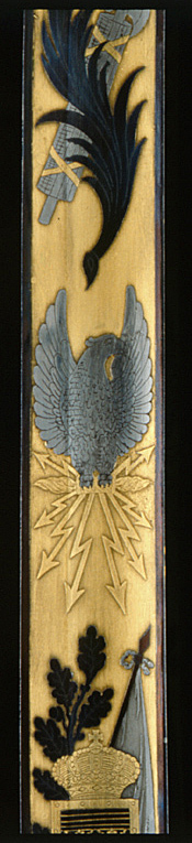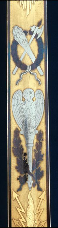 Klinga med etsad, förgylld och blånerad ornering i hela sin längd. Från basen intill 660 mm, blånerad och utsparade ornament mot förgylld botten. Vid basen på båda sidor rektangulärt fält med ekbladsliknande ornament, korslagda ek och palmkvistar, korslagda kanoner, fyra korslagda fanor och ett standar, bladornament, fasces med löst tvinnad ek och lager, blixtknippe, fågel (uggla) på utdraget postament med löst tvinnad ek och lager, därefter lagerkrans med korslagd yxa och klubba, strålande nordstjärna, därefter löst tvinnade ek och lager. Klingan i övrigt med blankpolerade, femuddiga stjärnor mot mattetsad botten. På insidan korslagda fanor och fasces framför dessa rustning, bladornament, stångvapen med löst tvinnad ek och lager, korslagd ekranka och fana, framför dessa krönt trekronorssköld. Därefter örn med blixtknippe i klorna, fasces med palmkvist, korslagda klubbor, därefter lika ornering som den på utsidan. Klingans rygg förgylld och med en etsad bladranka i enkel linjeteknik. På tången inslaget ankare.