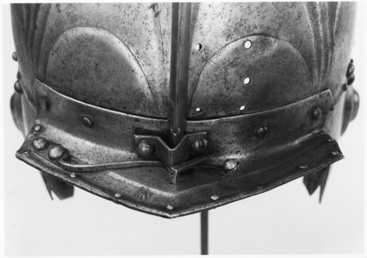 Hjälm bestående av hjälmklocka med pannskärm och näsbärja, öron- och nackskydd. Hjälmklocka med ovalt tvärsnitt, uppdriven i en spets, avslutad med en ekollon (turban)-liknande kula, h: 23 mm. Klockan driven i 8 dekorfält med åsar, i varje nertill en markerad båge och därovanför en uppåtriktad spets. Nertill en filad kantlinje 8 mm från kanten. Ovanför linjen nitar med större skallar av koppar, stål och mässing, på h sida framifrån en mässing, två stål och en koppar, på v sida mässing, två stål och en mässing. Nedanför linjen nitar med mindre mässingshuvuden, på h sida tomt hål, mässingsnit, två hål och en mässingsnit, på v tre mässingshuvuden, ett tomt hål, en mässing och ett hål. Även inanför nackskärmen fyra mässingsnitar och tre hål. De två nitarna med stålhuvuden i mitten fäster stålplattor på insidan (fästen för öronlapparna?), mellan plattorna och klockan rester av röd sammet(?). Pannskärm framdragen i trubbig spets, omvikt kant och därinnanför en försänkt bård, b ca 15 mm. I bården något till vänster om mitten Nürnbergs stadsstämpel. Skärmen baktill uppdragen i vinkel, b: 25 mm coh fäst i klockan med sex nitar, fyra har mässingsskållan kvar. Längs framkanten ursprungligen 8 smånitar, en saknas på vardera halvan. I bården till v fäst med två stora mässingsnitar en fjäder till näsbärjan. Näsbärjan fäst med bygel och de två fästnitarna i mitten. Näsbärja med skaft med triangulärt tvärsnitt, upptill avslutad med en stor, svagt konturerad, rund, slät platta, 75x85 mm. 12 mm från nederänden ett fästhak för fjädern. Oregelbundna öronlappar med klippta kanter, på mitten uppdrivna i två droppformiga, koncentriska plattor med snedfasade sidor. Plattorna flankerade med två stora nitar med välvda mässingshuvuden upptill och två mindre nitar nertill (saknas på den ena), nertill ytterligare en nit (borta på den ena lappen). Nackskydd nerdraget i en trubbig spets, omvikt kant längs över- och nederkanten. Därinnanför ca 15 mm breda, försänkta bårder. Längs överkanten 10 smånitar, längs nederkanten ursprungligen 11 (2 saknas), i sidorna ytterligare två (en saknas på h sida. I nederbården fem nitar med större mässingsskallar. Nackskyddet fäst vid klockan med tre gångjärn, det i mitten med konturerade kanter. Gångjärnen fästade i nackskyddet med nitade byglar och i klockan med i öglor lagda ståltrådar, dragna genom hål i klockan. Längs nackskyddets överkant på insidan rester av klädsel.