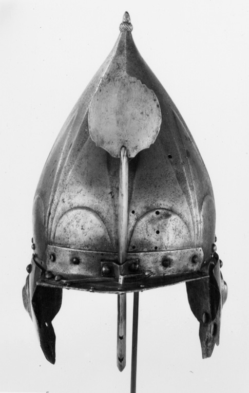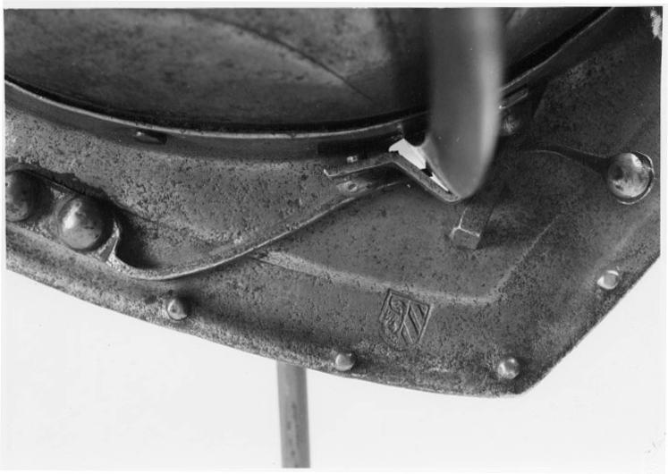 Hjälm bestående av hjälmklocka med pannskärm och näsbärja, öron- och nackskydd. Hjälmklocka med ovalt tvärsnitt, uppdriven i en spets, avslutad med en ekollon (turban)-liknande kula, h: 23 mm. Klockan driven i 8 dekorfält med åsar, i varje nertill en markerad båge och därovanför en uppåtriktad spets. Nertill en filad kantlinje 8 mm från kanten. Ovanför linjen nitar med större skallar av koppar, stål och mässing, på h sida framifrån en mässing, två stål och en koppar, på v sida mässing, två stål och en mässing. Nedanför linjen nitar med mindre mässingshuvuden, på h sida tomt hål, mässingsnit, två hål och en mässingsnit, på v tre mässingshuvuden, ett tomt hål, en mässing och ett hål. Även inanför nackskärmen fyra mässingsnitar och tre hål. De två nitarna med stålhuvuden i mitten fäster stålplattor på insidan (fästen för öronlapparna?), mellan plattorna och klockan rester av röd sammet(?). Pannskärm framdragen i trubbig spets, omvikt kant och därinnanför en försänkt bård, b ca 15 mm. I bården något till vänster om mitten Nürnbergs stadsstämpel. Skärmen baktill uppdragen i vinkel, b: 25 mm coh fäst i klockan med sex nitar, fyra har mässingsskållan kvar. Längs framkanten ursprungligen 8 smånitar, en saknas på vardera halvan. I bården till v fäst med två stora mässingsnitar en fjäder till näsbärjan. Näsbärjan fäst med bygel och de två fästnitarna i mitten. Näsbärja med skaft med triangulärt tvärsnitt, upptill avslutad med en stor, svagt konturerad, rund, slät platta, 75x85 mm. 12 mm från nederänden ett fästhak för fjädern. Oregelbundna öronlappar med klippta kanter, på mitten uppdrivna i två droppformiga, koncentriska plattor med snedfasade sidor. Plattorna flankerade med två stora nitar med välvda mässingshuvuden upptill och två mindre nitar nertill (saknas på den ena), nertill ytterligare en nit (borta på den ena lappen). Nackskydd nerdraget i en trubbig spets, omvikt kant längs över- och nederkanten. Därinnanför ca 15 mm breda, försänkta bårder. Längs överkanten 10 smånitar, längs nederkanten ursprungligen 11 (2 saknas), i sidorna ytterligare två (en saknas på h sida. I nederbården fem nitar med större mässingsskallar. Nackskyddet fäst vid klockan med tre gångjärn, det i mitten med konturerade kanter. Gångjärnen fästade i nackskyddet med nitade byglar och i klockan med i öglor lagda ståltrådar, dragna genom hål i klockan. Längs nackskyddets överkant på insidan rester av klädsel.