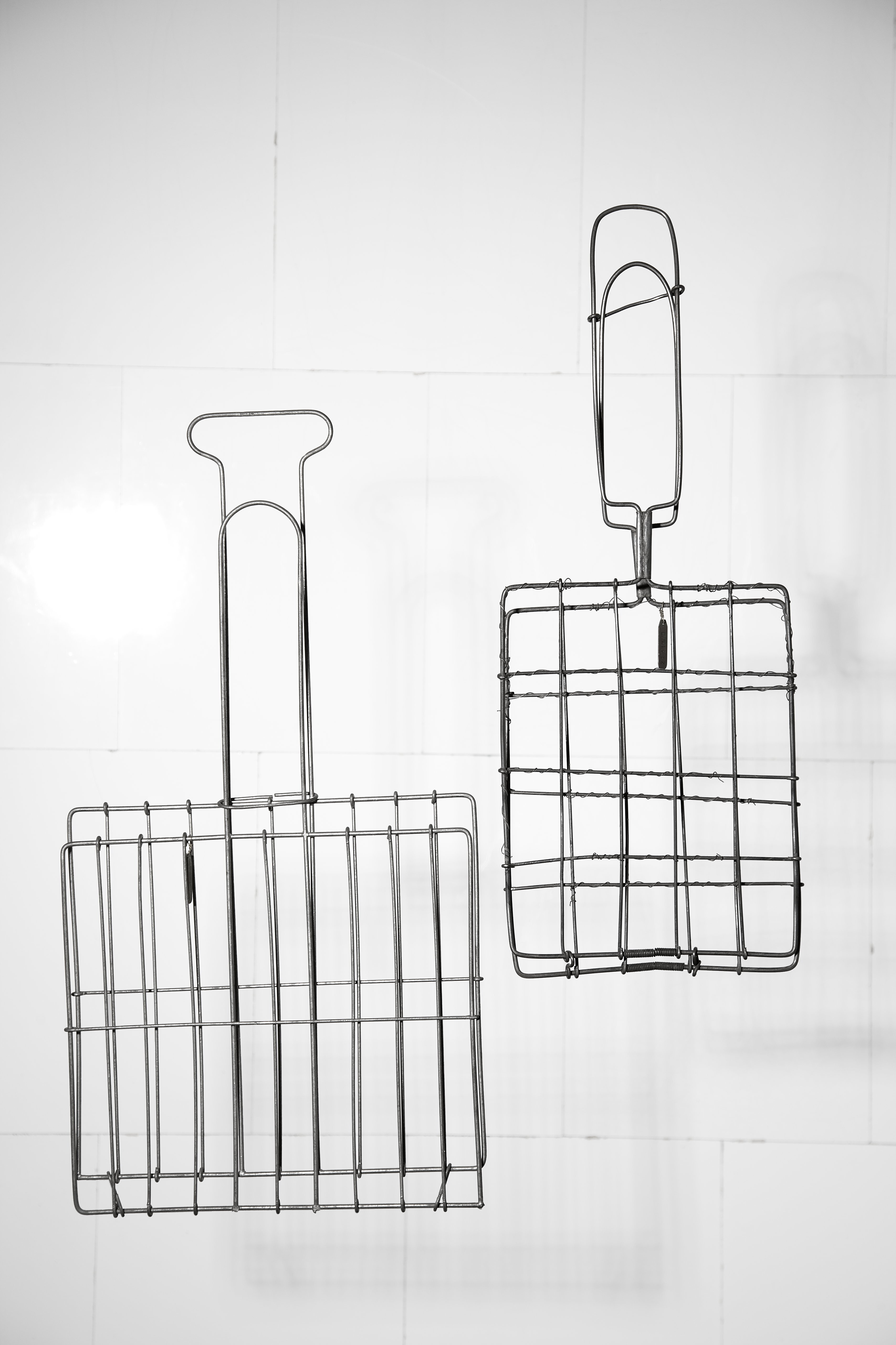 BRÖDROST Av förtent järntråd. Nästan kvadratisk. Bestående av två mot varandra fällbara hälfter, vardera utgörande ett galler med korsande längd- och tvärgående trådar med ändarna omböjda kring en ytterram med nio längdgående och en tvärgående tråd, två av de mellersta av de längdgående fortsättande utåt till ett långt skaft, det ena något kortare och med bågformig ytterände, det andra med utvidgad ytterände, innanför denna en lös skjutlänk, vilken sammanhåller skaften vid rostningen; hälfterna vid ytteränden sammanhållna av två S-formade hakar. Längd: 47,5 cm. Galler, längd: 23 cm.; bredd: 25,5 cm.
