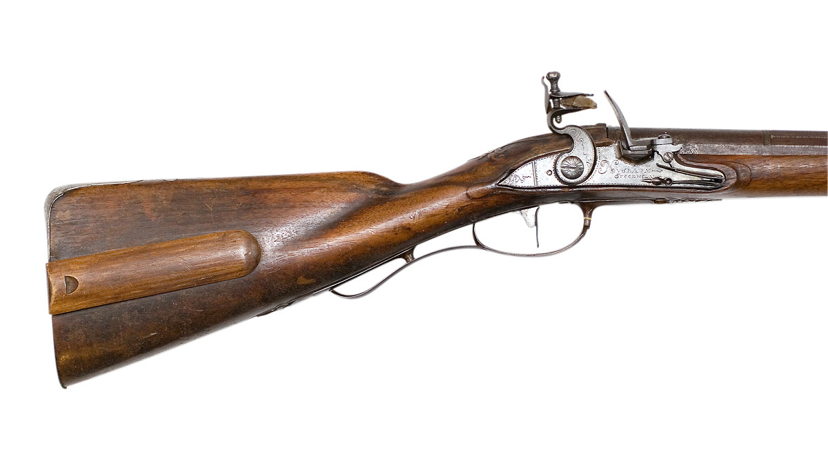 Rund, slätborrad, damaskerad, brunerad pipa av stål. På kammarens ovansida 110 mm från pipbasen ett 295 mm långt, kantigt parti, flankerat av baktill ett silverband med sicksackdekor, framtill av en profilerad ring. Vid pipbasen ett slätt silverband, på den runda delen därframför ett flätmönster av silver. Baktill på pipans kantiga del en silverplåt med graverat namnchiffer, spegelmonogram: C I AT(?). På pipans ovansida 62 mm från mynningen ett slät, välvt silverband. Svansskruven utbytt (lös), svansskruvblad med rundat ändblad med graverad bladdekor. Riktmedel: På svansskruvbladet vid pipbasen en siktklack. Spolformigt korn av silver. Fästning: Tre häften. Pipan fäst med krysskruv samt två pipstift av stål. Flintlås av gråanlöpt stål, plant låsbleck med fasade kanter och försänkt bakspets, graverad kantbård, blad på bakspetsen samt signatur: "NVSBAVM // STOCKHOLM". S-formig, platt hane med fasade kanter, graverade bladrankor, stort, flackt välvt nötskruvhuvud med graverad sol. Spetsovala käkar,käkskruv med päronformigt huvud. Kantig fängpanna med skålad fals. Batteri med åsat omvändningseldstål, batterifjäder med fasade kanter, urneformigt fjäderlöv. Fästning: Två låsskruvar. Rak avtryckare med skiva. Konturerat avtryckarbleck. Helstock av valnöt, kolv med kindstöd och kolvlåda, snidad bladdekor vid kindstöd, svansskruvblad och spetsrörka. Beslag av stål. Kolvkappa med lång flik på kolvryggen, avslutning med bardisanliknande spets. Plant sidbleck med försänkt bakspets, fasade kanter, graverad kantdekor samt trofégrupp med trumma, fanor, kanon, pilkoger och örn, en sidblecksskruv. En + två runda rörkor. Varbygel med 8-formiga armar, främre armen avslutad med urna och bladknippe. Delvis fri och dubbel bakre arm, avslutad med urna med droppformigt, platt blad. Tillbehör: Laddstock av trä, l: 995 mm.