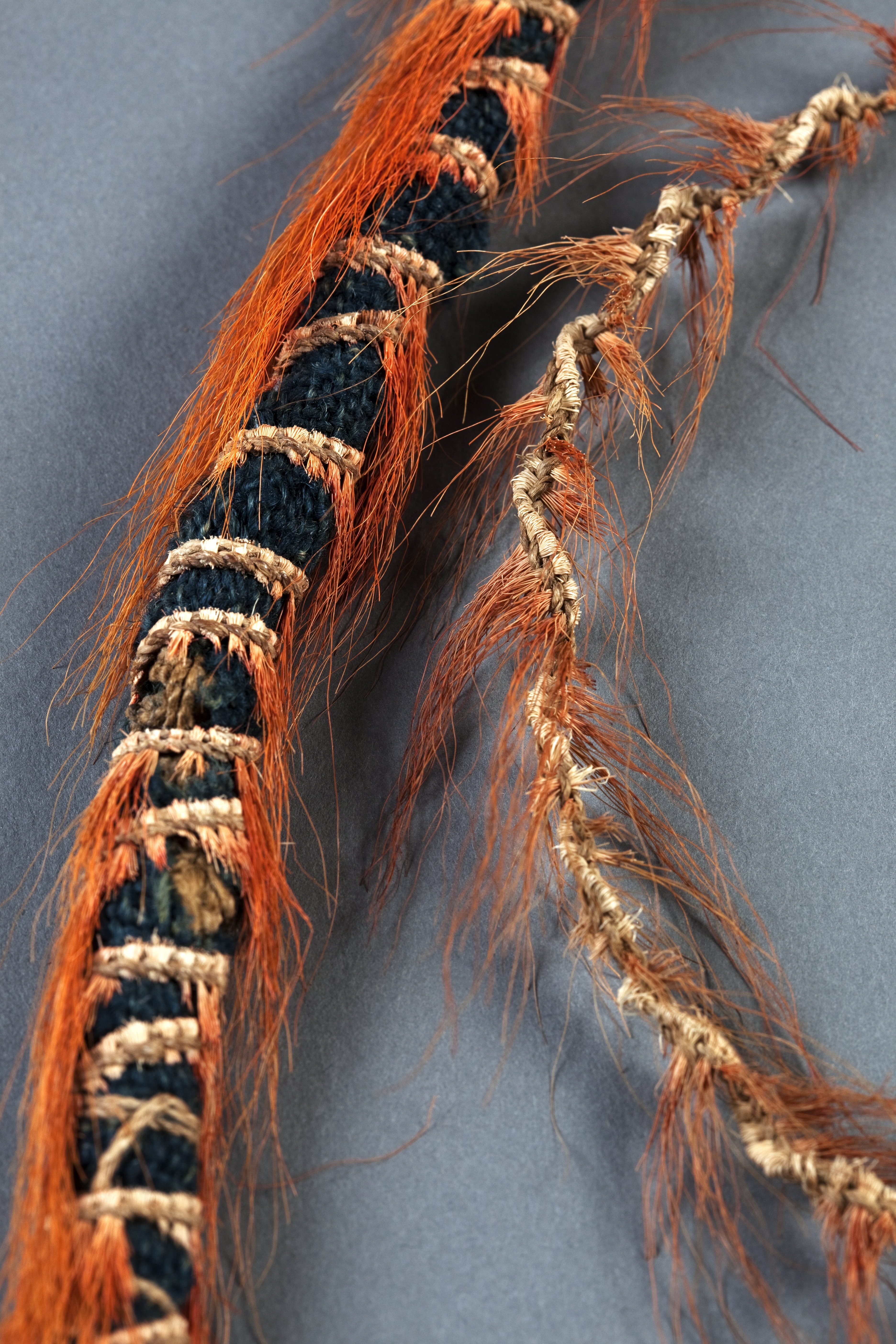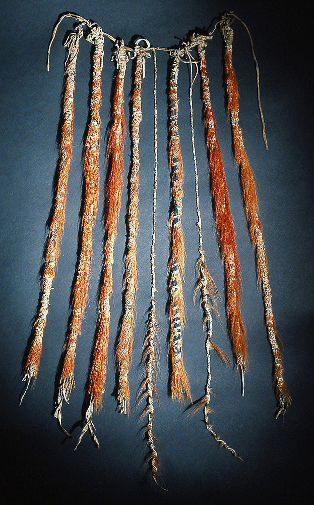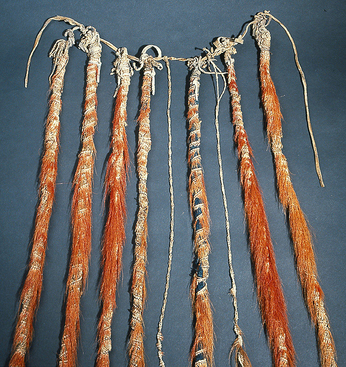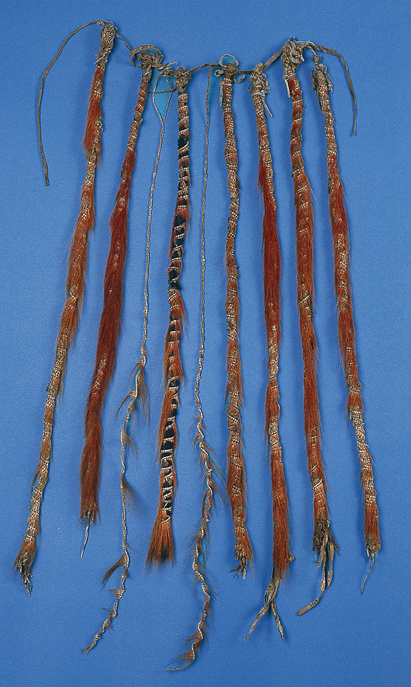 Möjligen en gåva från guvenören Johan Printz (1642-1653) till Carl Gustaf Wrangel eller Per Brahe d.y. 7 st. svansar, konstgjort bundna av snören - delvis blåfärgade - samt i snörena inflätat rött hjorthår. Svansarna fastknutna vid tunn läderrem med ca 50 mm mellanrum.