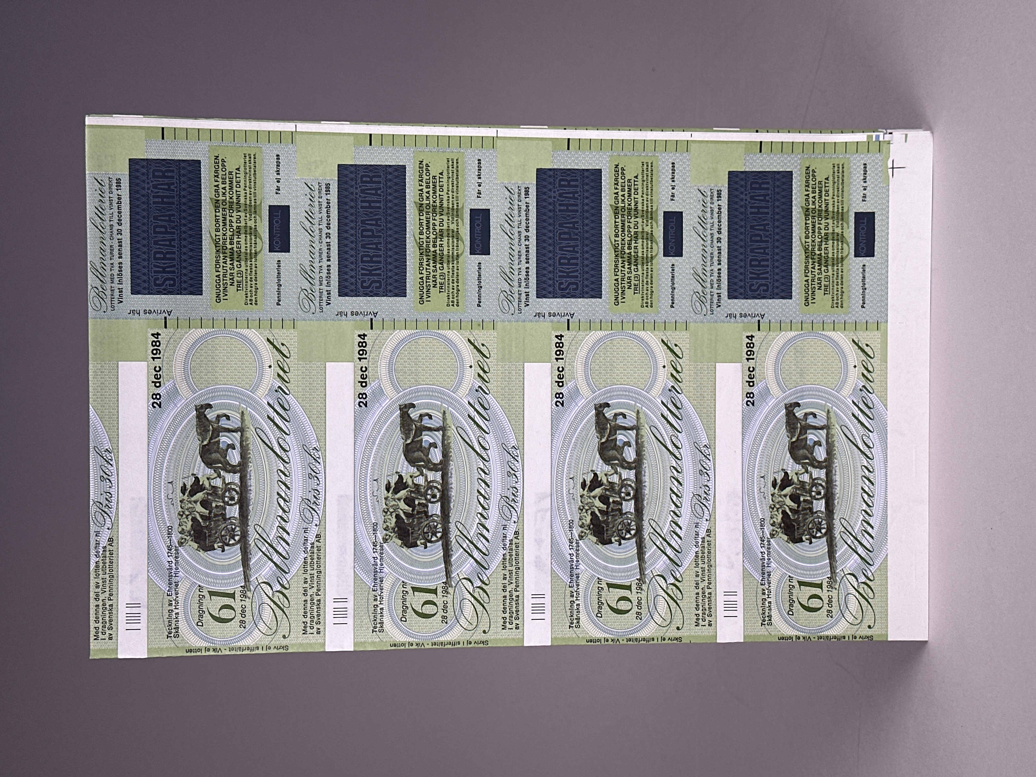 Provark med plats för 28 lotter, vikt. Pris 30 kronor. 61:a dragning, 28:e december 1984. Motiv: "Skånska Hofveriet Hjemreser", teckning av Ehrensvärd Färger: grön, blå, svart Märkning: området i det övre högra hörnet är överstruket och markerat med ordet "specimen", även märkt "Z2".