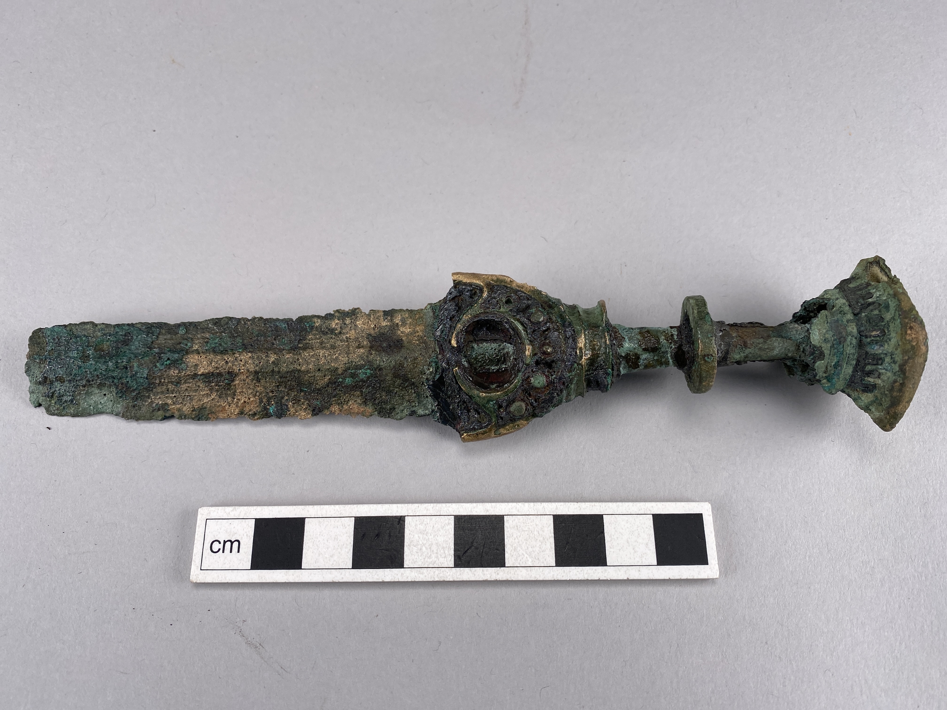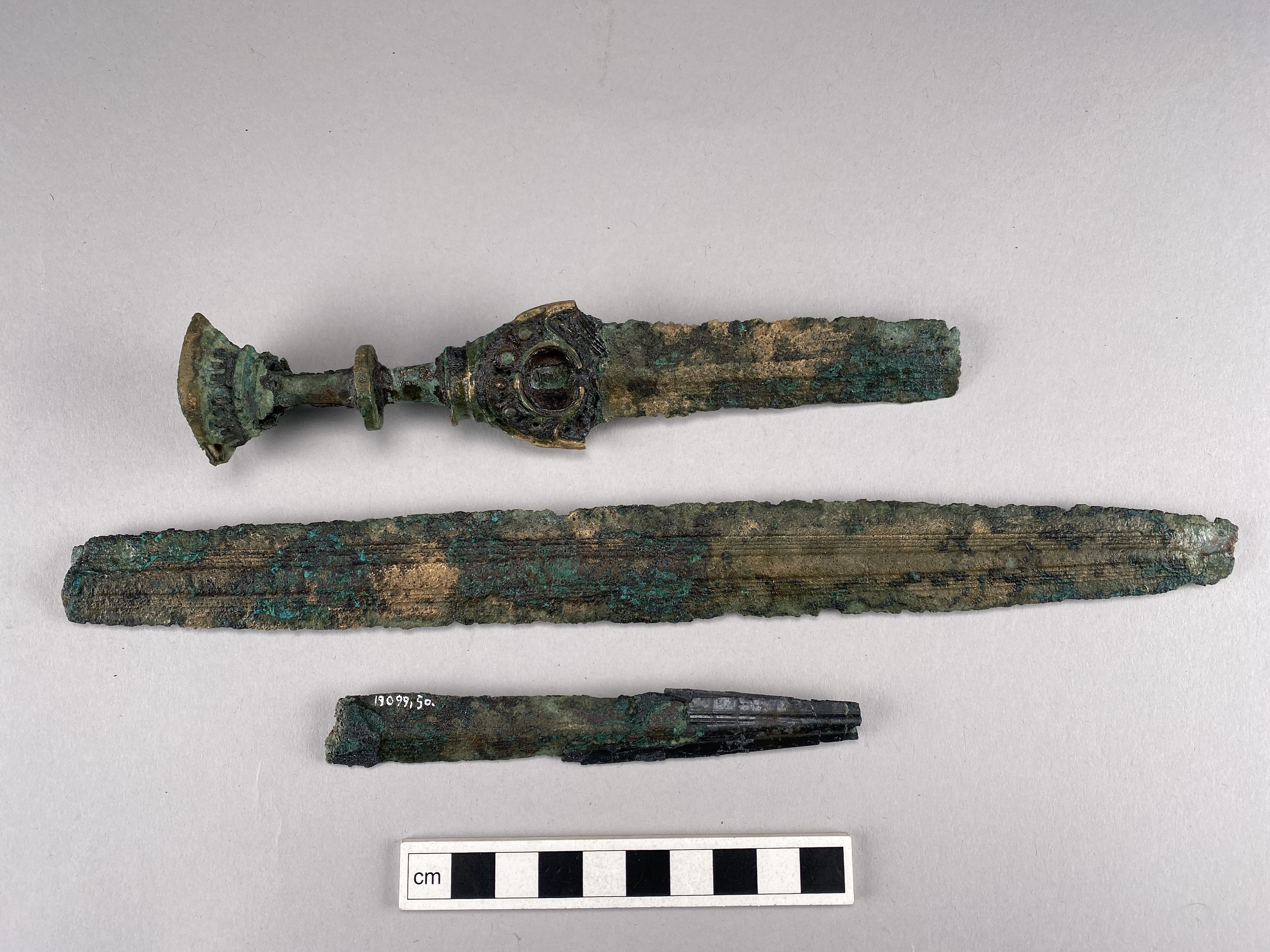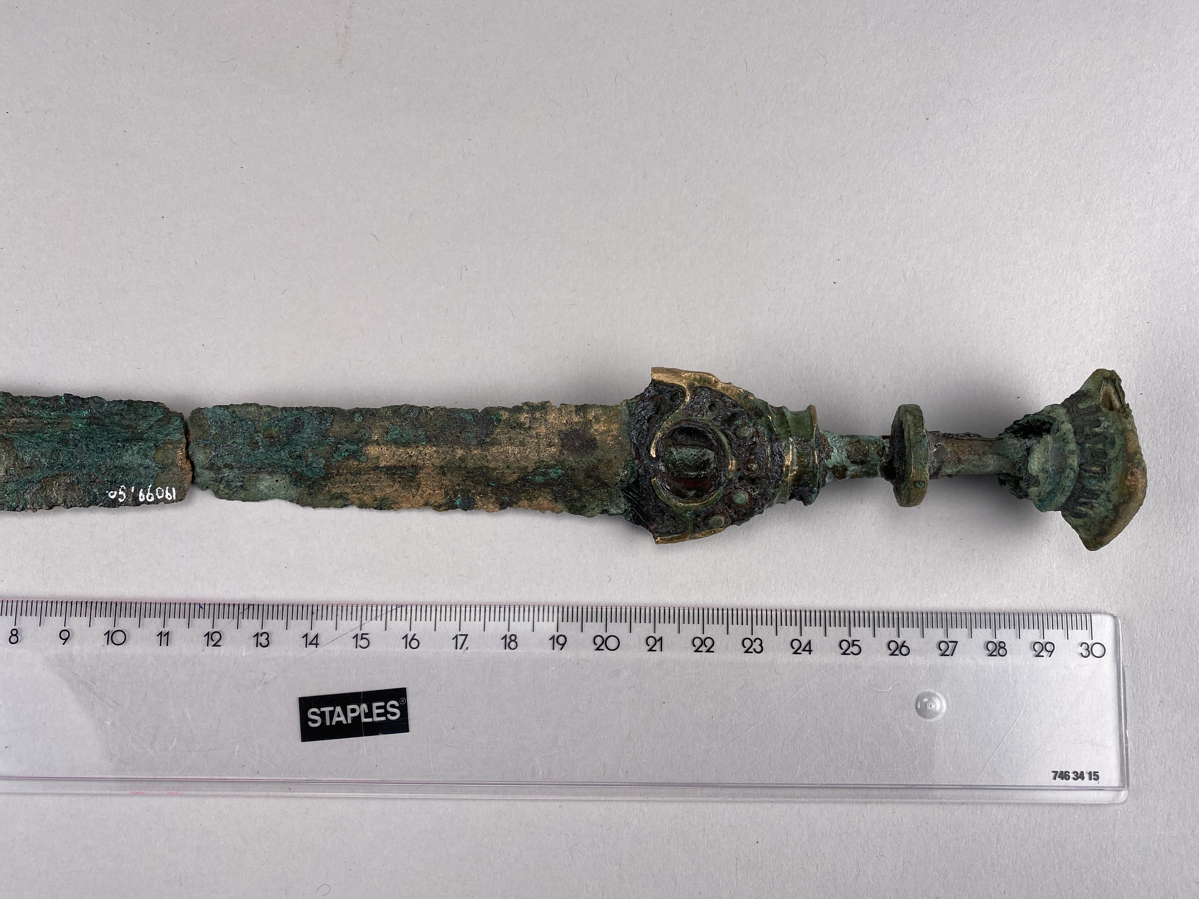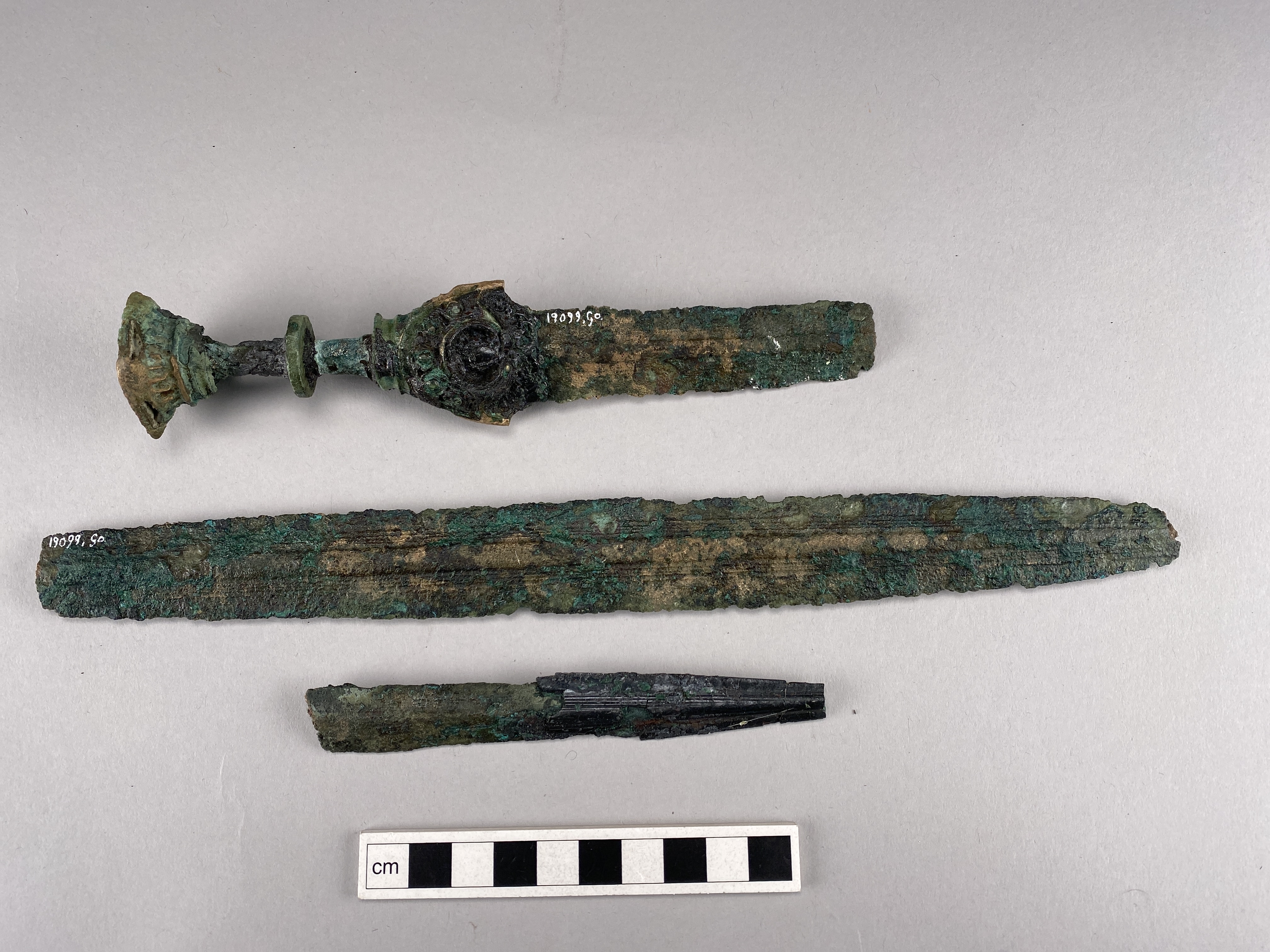 Skivgreppssvärd i tre fragment. Bladet har längsgående rännor och mittvulst. Originalpatina bevarad i spetsen. Kavle med en bevarad lamell. Romboid knopp med dekor av cirklar. Starkt ärgad