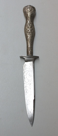 Balusterformat fäste av stål, klätt med silverplåt med ciselerad blomdekor. Intill klingan siffran 12. Klinga av stål, rak eneggad med ett 39 mm lång tvåeggad spets. Vid basen är klingan utvidgad så att den bildar en rak parerstång. Ornerad med högetsad bladranka.