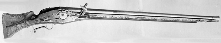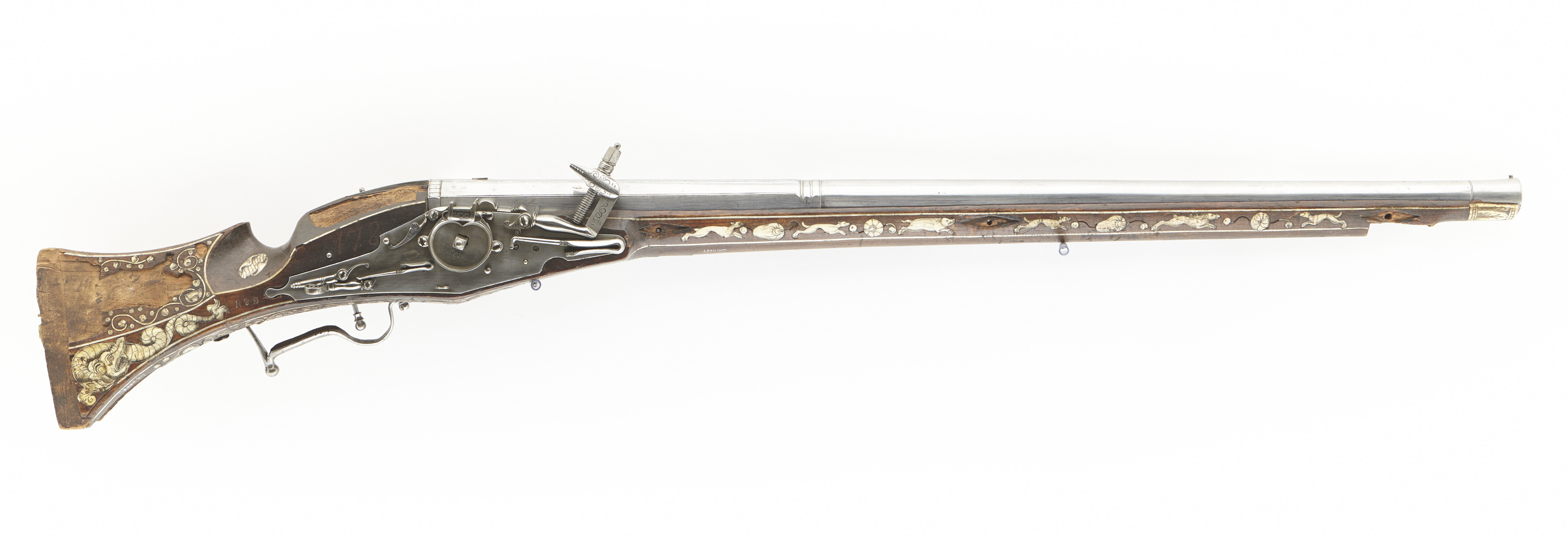 Rund, slätborrad pipa med åttsidig kammare, avsmalnande mot mynningen där den åter vidgas. Övergången till kammaren markerad med två band, kammarens kanter med hålkälar. Bakom siktet stämplat: 7. Strax bakom mynningen två graverade linjer löpande runtom pipan. Svansskruvplatta med vulst med tvärställda skåror. Rakt, rektangulärt svansskruvblad med sidorna markerade med linjer. På kammarens ovansida stämplar, på överfältet en oval stämpel R R ovanför sköld med bokstäverna I N och otydlig figur (LRK vägl.1921:409), krönt stämpel (Amsterdams kontroll, LRK vägl.1921:296). Dessutom på vardera av de två omgivande fälten stämpel i form av en pistol (LRK vägl.1921:264). Riktmedel: Sikte och korn av stål. Fästning: Tre häften. Pipan fäst med krysskruv underifrån samt tre pipstift. Hjullås av tysk typ med plant låsbleck. Utvändigt hjul fäst med ring och skruvar kl. 3 och 9. Fängpanna med låg, rak skärm, lock med rörlig arm avslutad med ett ekollon. Fängpanneskruven liksom virvelsäkringsskruven med lövformigt bleck. Virvelsäkringens tumgrepp upprullat i spiral. Hane med rektangulära käkar, lös underkäke, balusterformig kropp, fyrsidigt käkskruvhuvud och hanhals. Hanfjädern som alla fjädrar med fasningar och voluter. Låset utvändigt och invändigt polerat, spridd dekor gjord med snett hållen rörstämpel, på hjulet i form av kors, på hanhalsen som paragraftecken. Fästning: Två låsskruvar. Rak avtryckare med band och kula. Helstock av valnöt, muskötkolv med utskuret tumgrepp, framstock med sluten laddstocksränna. Inläggningar av benlister och graverade benplattor. Inläggningar på stockens h. sida, övre fältet: rankdekor, nedre fältet: drake som biter sig över kroppen, två ggr omslagen kropp. Vänster sida, övre fältet: tron (Fides) hållande korset och kalken, i nedre v.delen av plattan text: "FIDES". Nedre fältet: bakåtblickande drake som på andra sidan. Bakplåten fragmentarisk liksom sidblecket, jagande hundar samt förmodligen en ryttare. Vid sidan om svansskruvbladet en manlig "sjöjungfru" med skägg men med kvinnobröst. Bakom låsblecket stämplat i träet: 172.