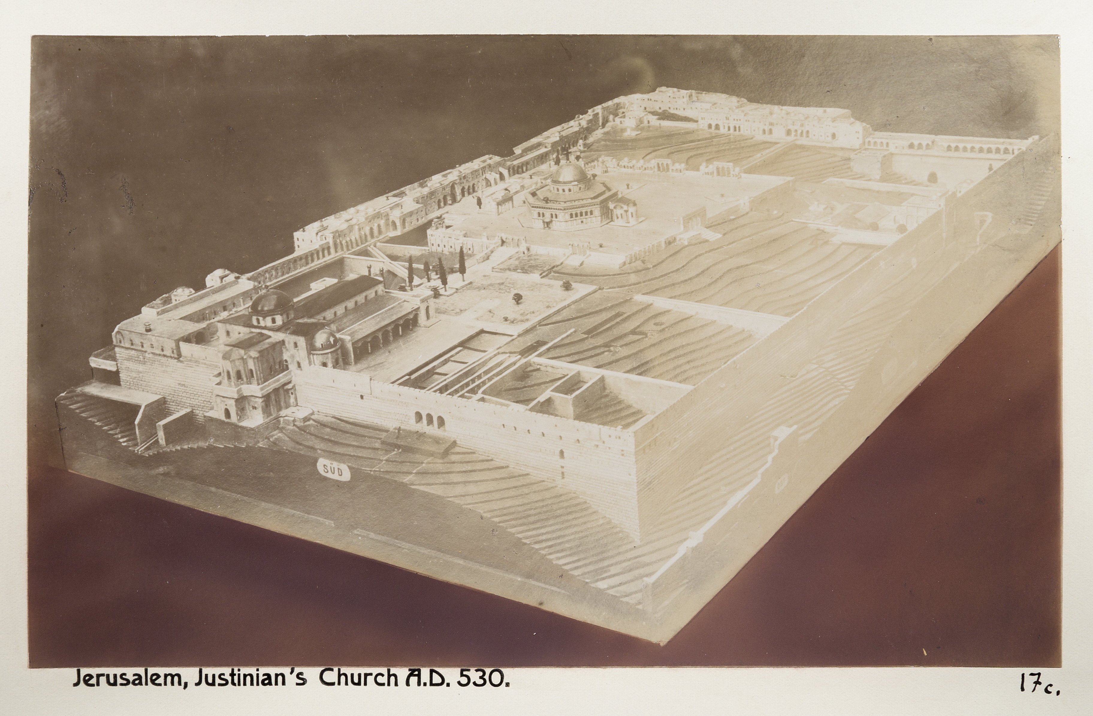 Modell av Justinianus kyrka i Jerusalem, som den såg ut år 530. Text på originalet: "Jerusalem, Justinian's Church A.D. 530." Fotografierna LXVI:N.01.-180. kommer från resan till Palestina och Syrien som Wilhelmina och Walther von Hallwyl gjorde den 30 mars-27 april 1901. De lämnade Sverige den 5 november 1900 för Egypten, där de stannade till den 28 mars 1901, då de fortsatte till Palestina. Med på resan var Wilhelminas sällskapsdam, fröken Ida Uhse. Den 27 april fortsatte de till Turkiet och Mindre Asien. De mindre fotografierna (utom de från Samos) LXVI:N.90.-100. är tagna av Wilhelmina själv, under en resa till häst från Jerusalem till Damaskus 8-20 april 1901. Övriga fotografier är inköpta av Wilhelmina i Jerusalem, Damaskus och Beirut. Alla uppgifter kommer från Ida Uhses reseanteckningar.