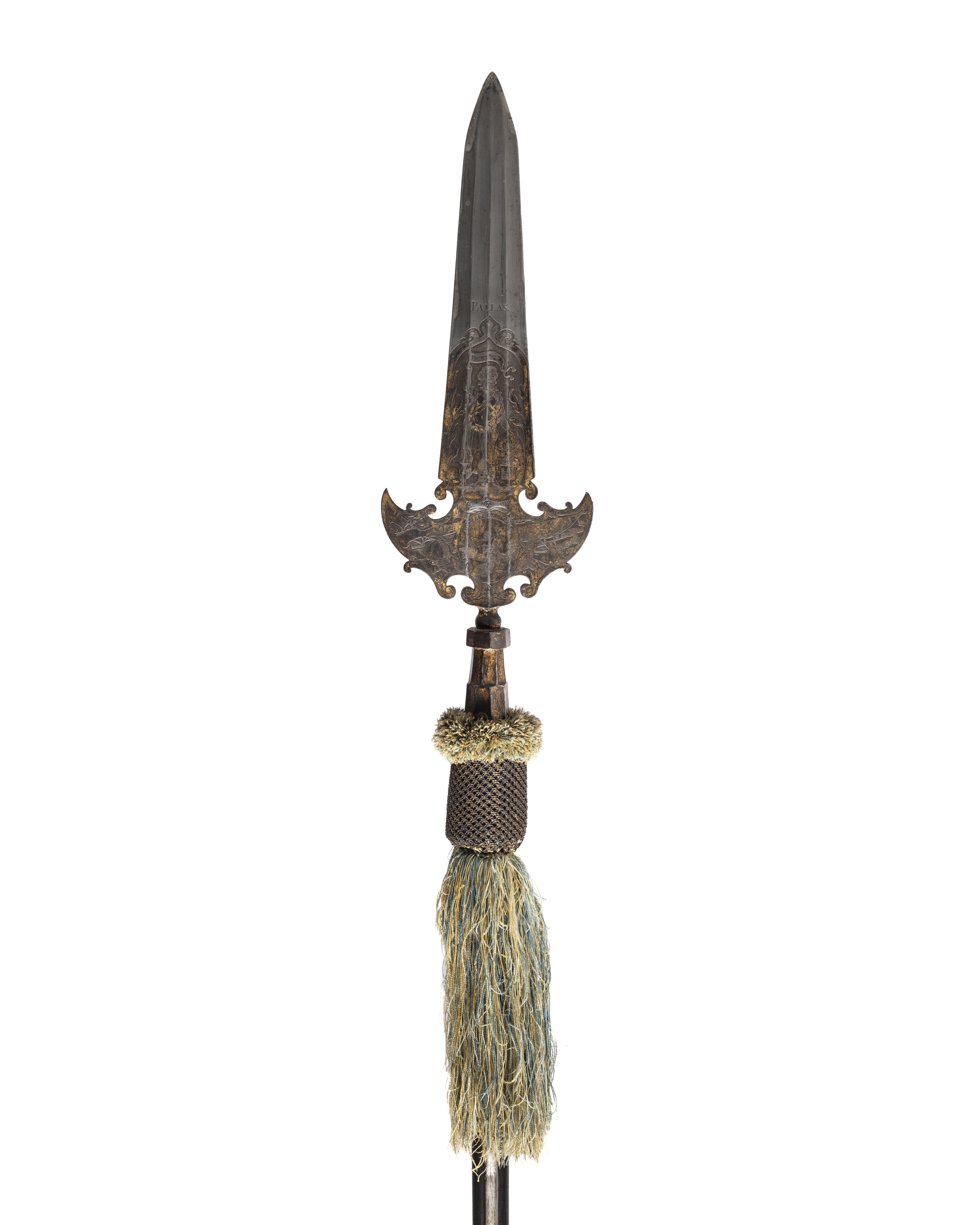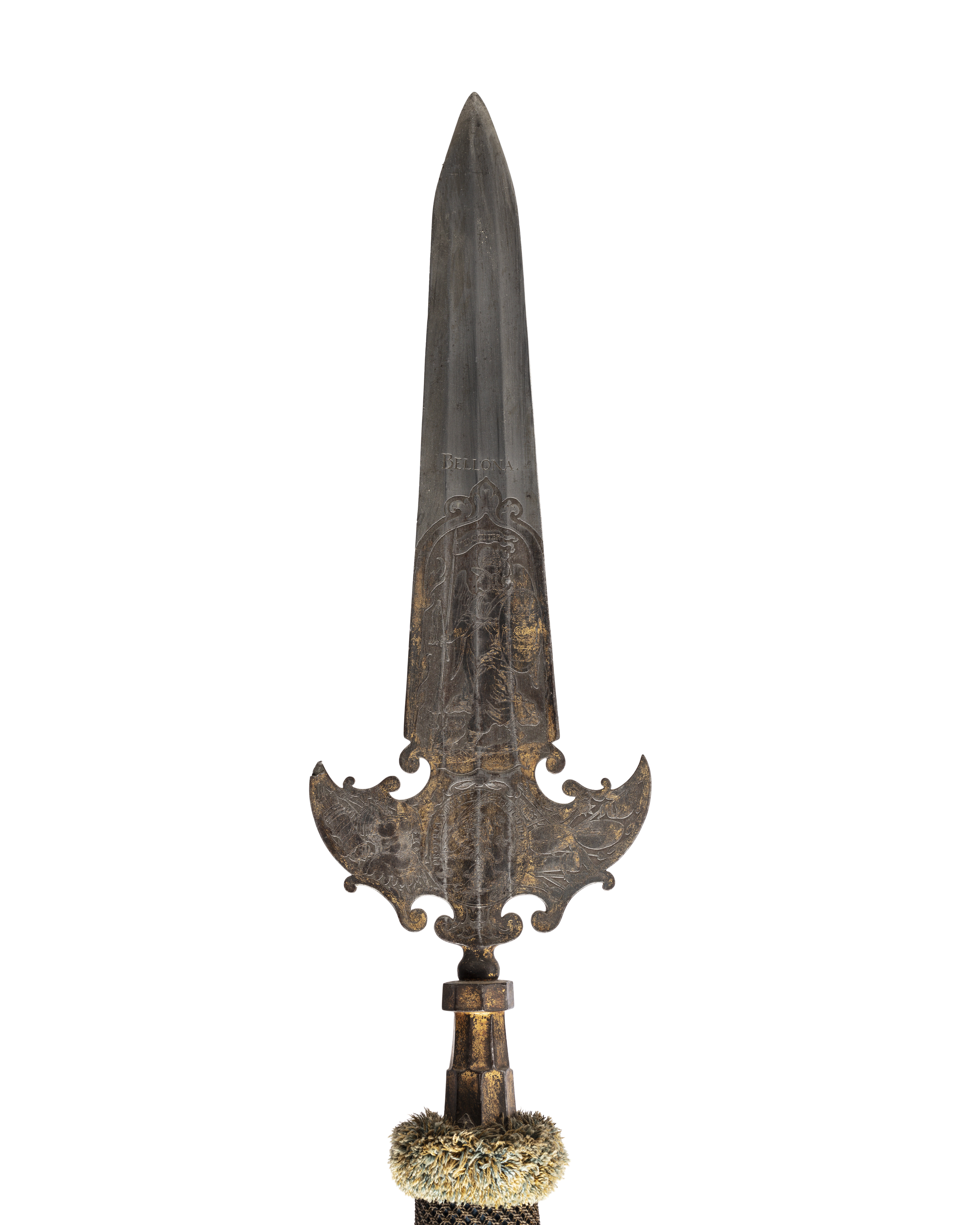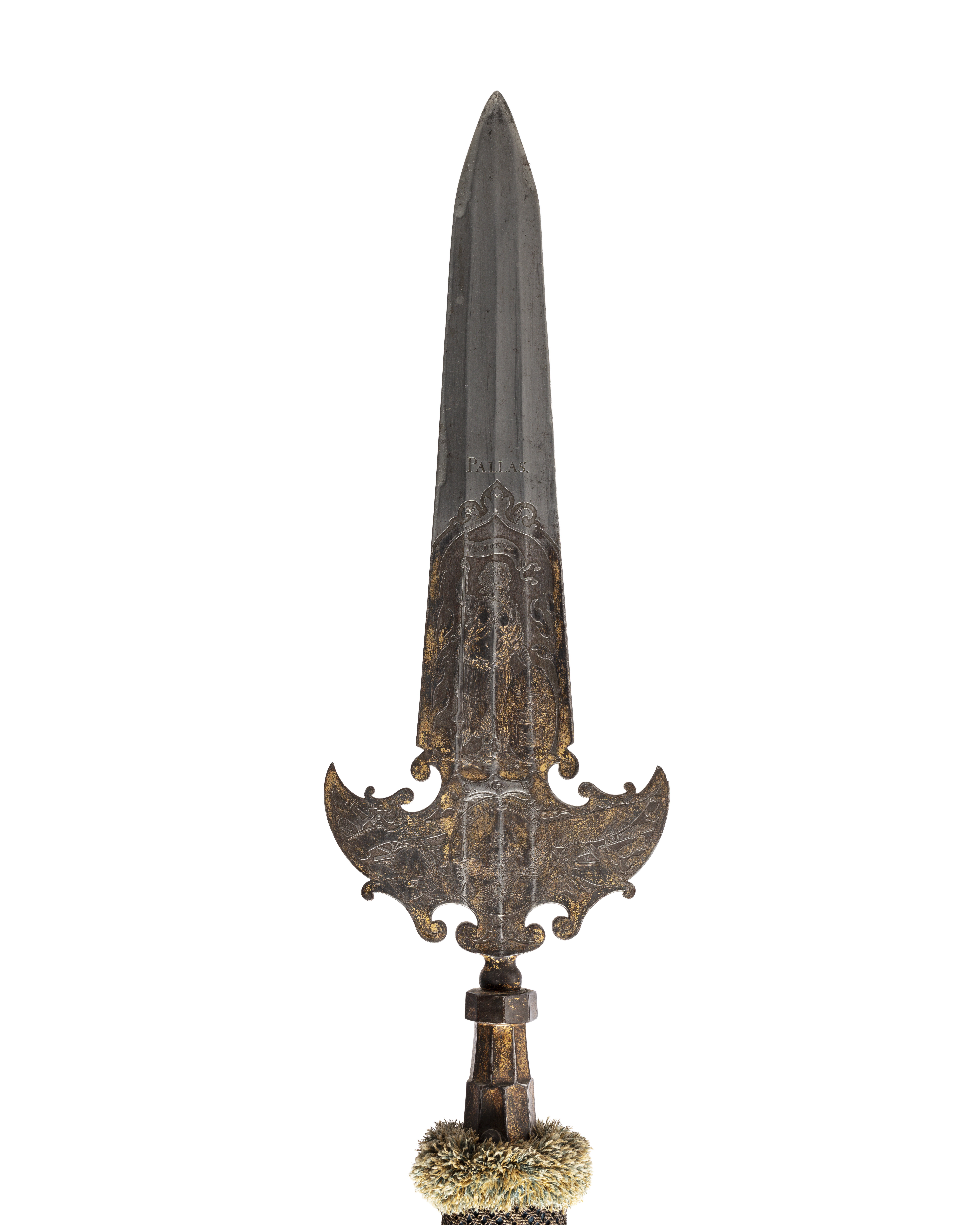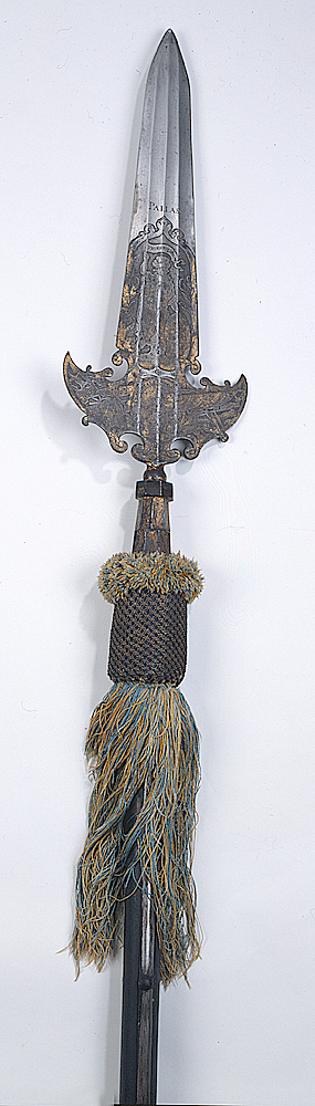 Klinga med tämligen brett blad och symmetriskt konturerade vingar. Bladet har fyra längsgående, grunda hålkälar och en trekantigt utdragen spets. Vingarnas form är av nederlänsk-tysk typ. Bladets nedre hälft och vingarna har en sammanhängande etsad och förgylld komposition. På ena sidan, över kompositionen, finns etsat: "BELLONA", därunder avbildas gudinnan med på vänster arm en oval sköld med ätten Wrangels stamvapen, varöver "CGW", och i höger hand en lans med lansflagga, varpå inskriptionen: "VELOCITER". Vid Bellonas fötter finns vishetens symbol - en uggla. Vingarna har trofégrupper; i mitten ett lejon med palmkvist inskrivet i en oval med omgivande text: "PROPRIA VIRTUTE TRIUMPHE". På klingans andra sida står: "PALLAS", därunder gudinnan med på vänster sida en oval sköld med ätten Wrangels stamvapen, och i höger hand en lans med lansflagga, den senare med inskriptionen: "PRUDENTER". Vid Pallas fot finns en uggla. Under Pallas finns etsat "CGW". I mitten av vingarnas trofégrupper finns Jupiters örn och Ganymedes, inskrivna i en oval med omgivande text: "NON EST MORTALE QUOD OPTO". Det finns en holk av förgyllt stål, 82 mm hög. Skaftet är av svartmålat trä med på vardera sidan 550 mm långa stålskenor, fästade med fem stift. Det finns en kvast av blått och gult silke (260 mm) samt en knopp överklädd med blått ylle, varöver ett virkat nät av silvertråd trätts. Över knoppen finns en blå-gul silke krans. Doppskon är av stål, 145 mm hög. Jämför med inventarienummer 6968-6970, 7315 samt 7317-7318.