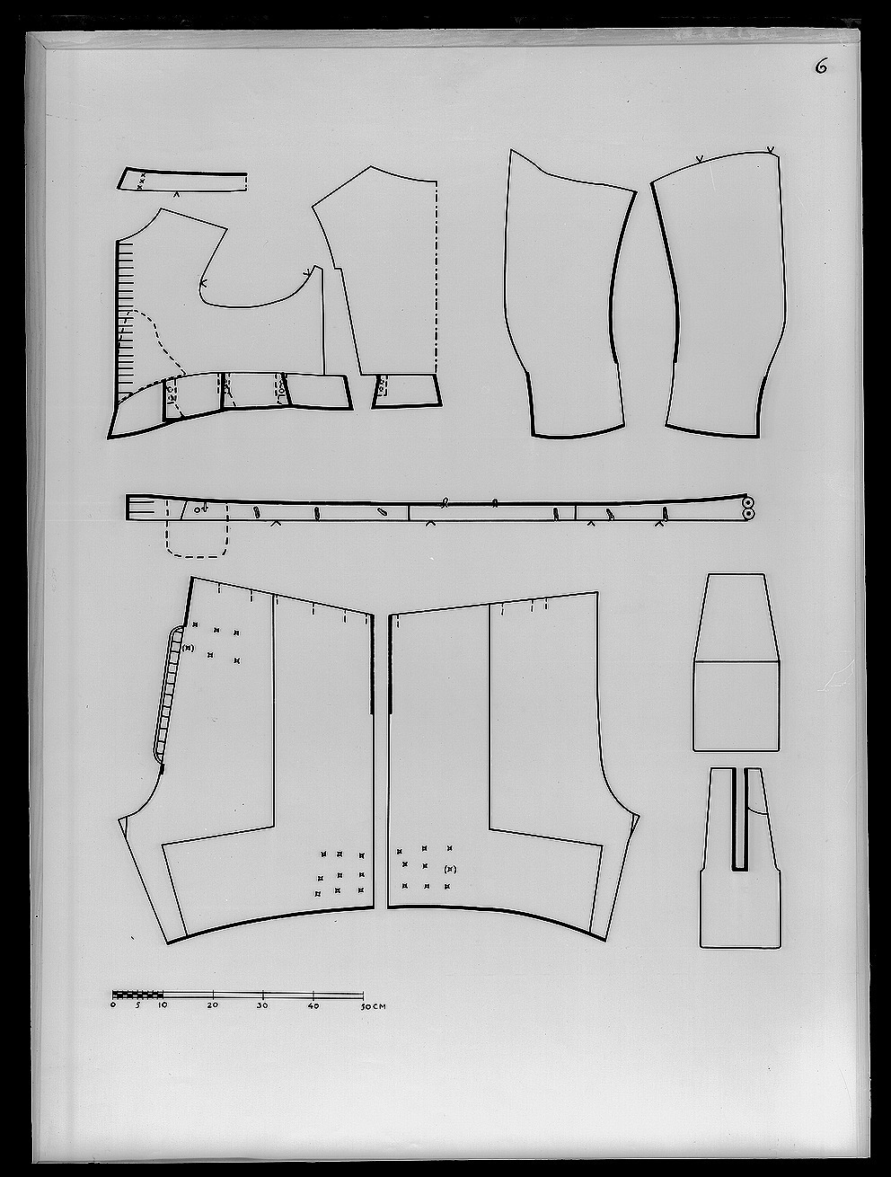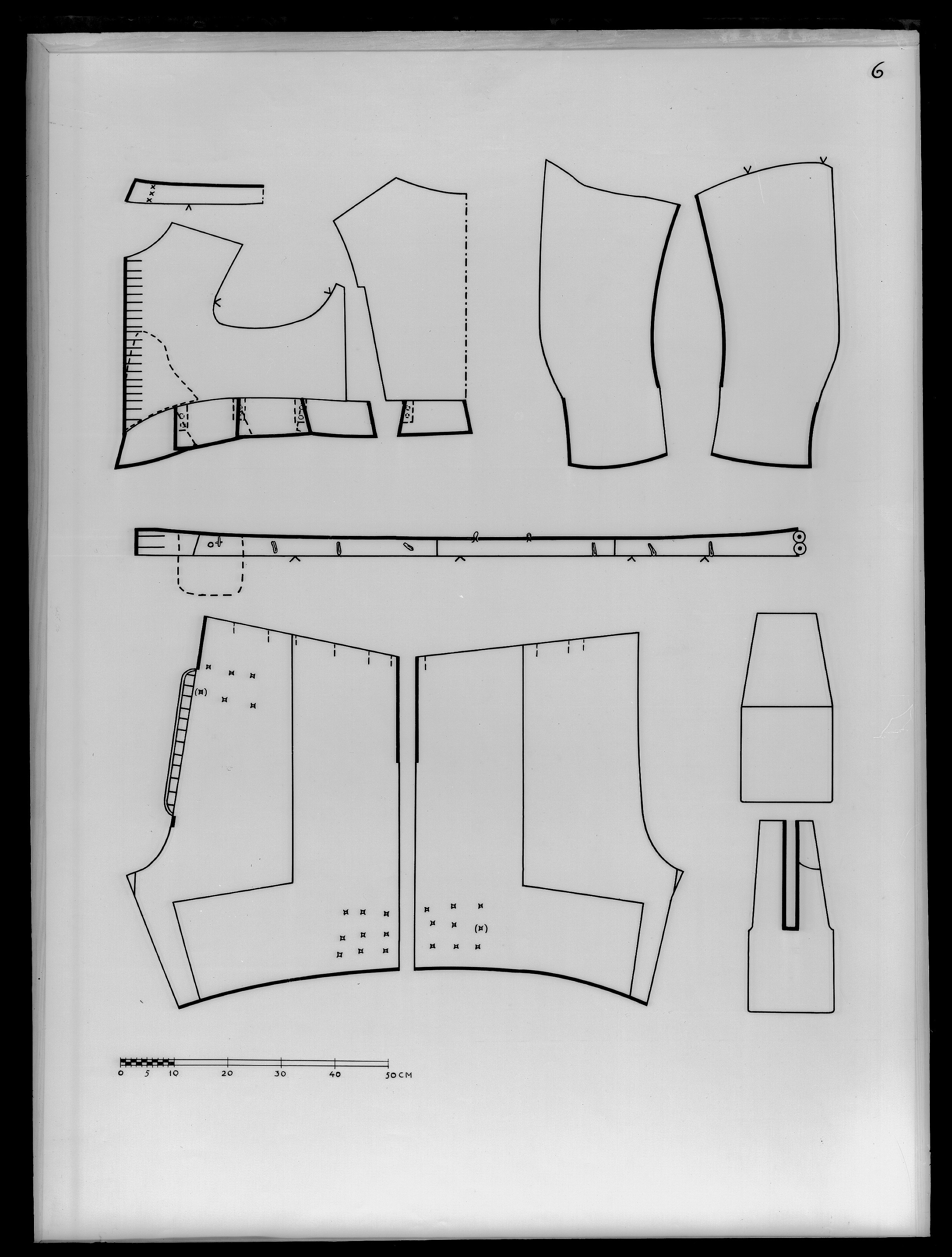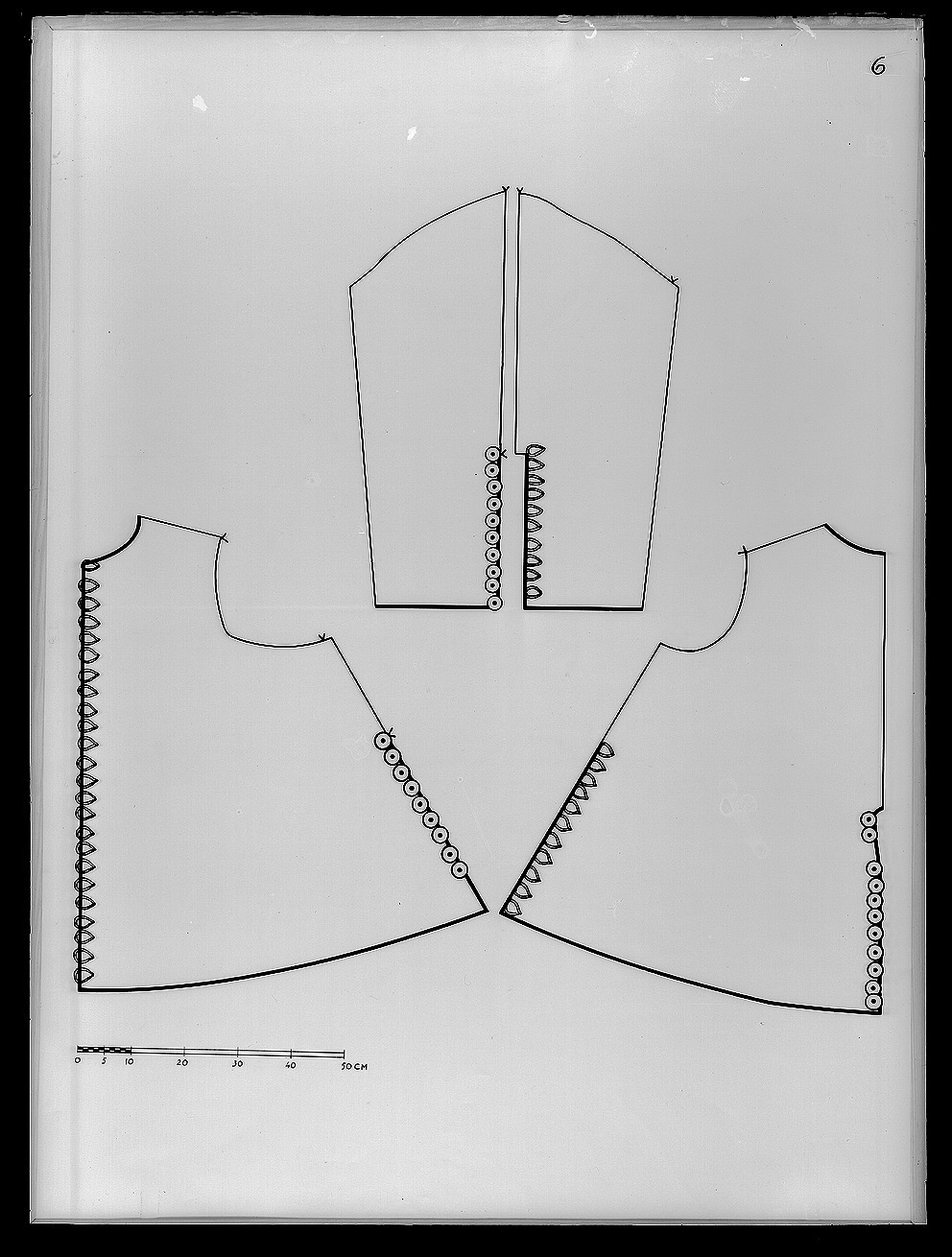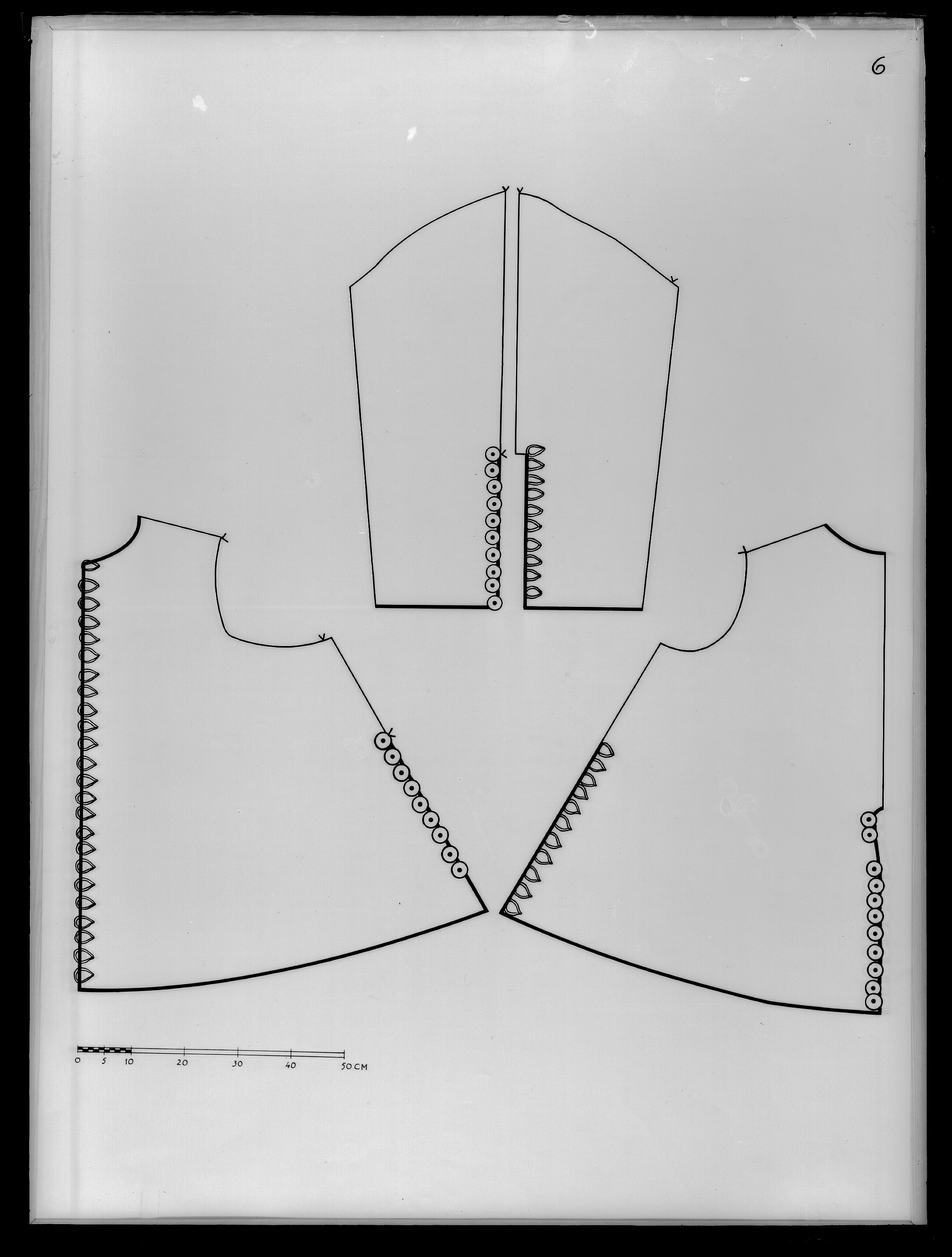 Tröja. Livplagg av innocenttyp. Skuren i 2 lika stora framstycken, vars framkanter följer staden, 1 helt bakstycke, 1 ståndkrage, 10 små skört samt 2 svängda stycken för varje ärm. Plagget är sytt av rik silverbrokad och har även foder av silverbrokad i annat mönster. Tröjan är försedd med mellanfoder av linnelärft (20x19 tr/cm2) och planschetter, triangelformade styvnader nedtill i de spetsiga framkanterna. Kragen är på insidan fodrad med vitt mönstrat siden av samma sort som återkommer i tröjan till dräkt nr 3401 och har mellanfoder av linnelärft (25x21 tr/cm2) med inlagd styvnad, troligen fiskben. Vänsterframstycke har 21 knapphål för de bevarade 21 knapparna i höger framstycke. Knapphålen är sydda med vitt högertvinnat silke, 8 stygn/cm över 1 tråd. Knapparna, d: 1,3 cm, är med silverlansomspunnet vitt, högertvinnat silke, trind kantilj och silverlan. Tre stycken likadana knappar sitter i kragen, men motsvarande tränsar saknas. Silverbrokaden som utgör tröjans övertyg benämnes rik silverduk. Den kan beskrivas på följande sätt: Vådbredd minst 50 cm (72x18 tr/cm2). Varp av tunt, vitt otvinnat silke. De grövre otvinnade vita inslagstrådarna bildar dels botten med silverlan i varje inslag, dels blommönster av flotterade trådar med högertvinnade silverlan i varje sådant inslag. Stad: 1 cm (10 gröna, 4 orange, 12 gröna, 1 vit tråd). Mönsterrapport: 8,8 x 8,8 cm. Mönstret är symmetriskt uppbyggt med halvnaturalistiska blommor sammanhållna i rosettlika arrangemang. Ärmarna är avsedda att ha den främre sömmen öppen. På de motsatta, bakre, sömmarna har ärmarna sprund nedtill vid handleden. Man har avsett att vika upp ärmensnederkant till uppslag. Förutom de 10 trapetsformade skörten sitta i midjan, på tröjansinsida 7 st stroppar (klädda med foderbrokaden) vardera med 2 hål för de 7 silverhakarna ibyxlinningen. 4 sitter på den vänstra sidan och 3 på den högra. Silverbrokaden som utgörtröjans foder benämnes också i de äldre inventarierna silverduk. Denna har en vådbredd av minst 51 cm (c:a 70 x 18 á 19 tr/cm2). Mycket tunn och tät varp avvita, otvinnade silkestrådar, där dessa bildar botteninslag ha de försetts med silverlan pårätan. De flotterande mönstertrådarna är däremot endast av vitt silke. (Ripsvävnad). Stad:0,8 cm (12 gröna, 4 gulorange, 10 gröna, 1 tjockare vit tråd - vävnad i tuskaft).Mönsterrapport: h 7,7 cm, b 6,6 cm. Det är ett halvnaturalistiskt blomstermönster med enkarakteristisk figur som erinrar om en fjäder. Samma silverbrokad återkommer som foder itröjan nr 3389. All garnering och dekor av spetsar har sprättats bort och tröjans foder harskadats upptill. Kragen har även brännskada vilket tyder på att den lämnats till"utbrännning". På kragens insida har man med bläck märkt plagget N 43, en åtgärd somstammar från 1789.