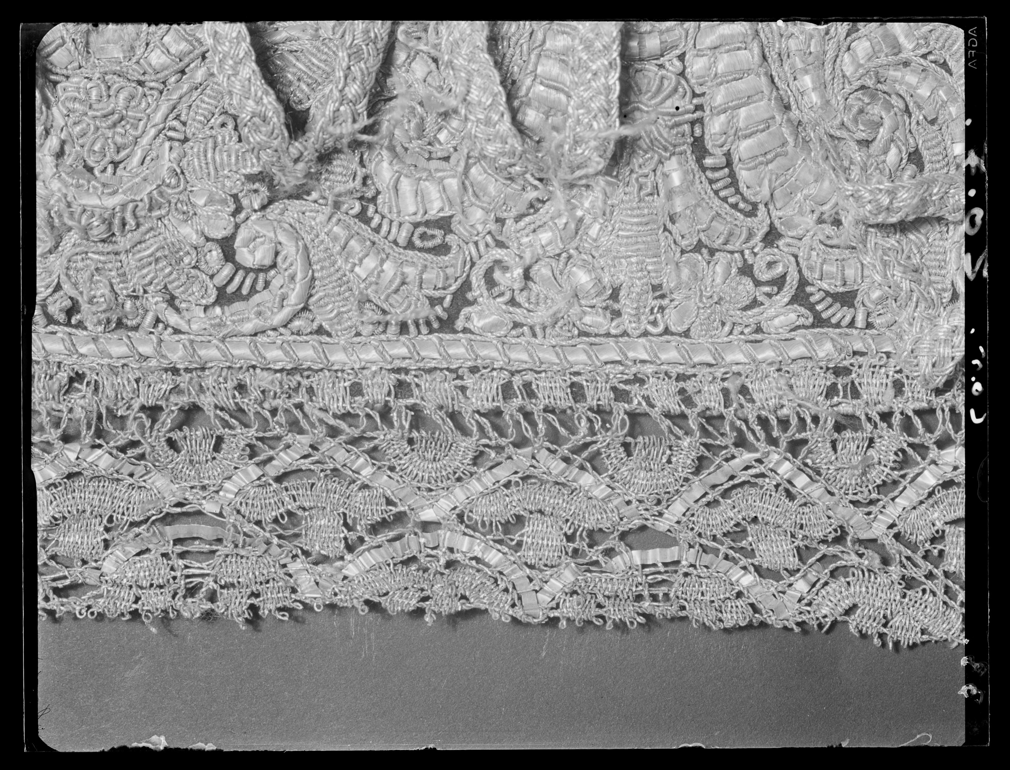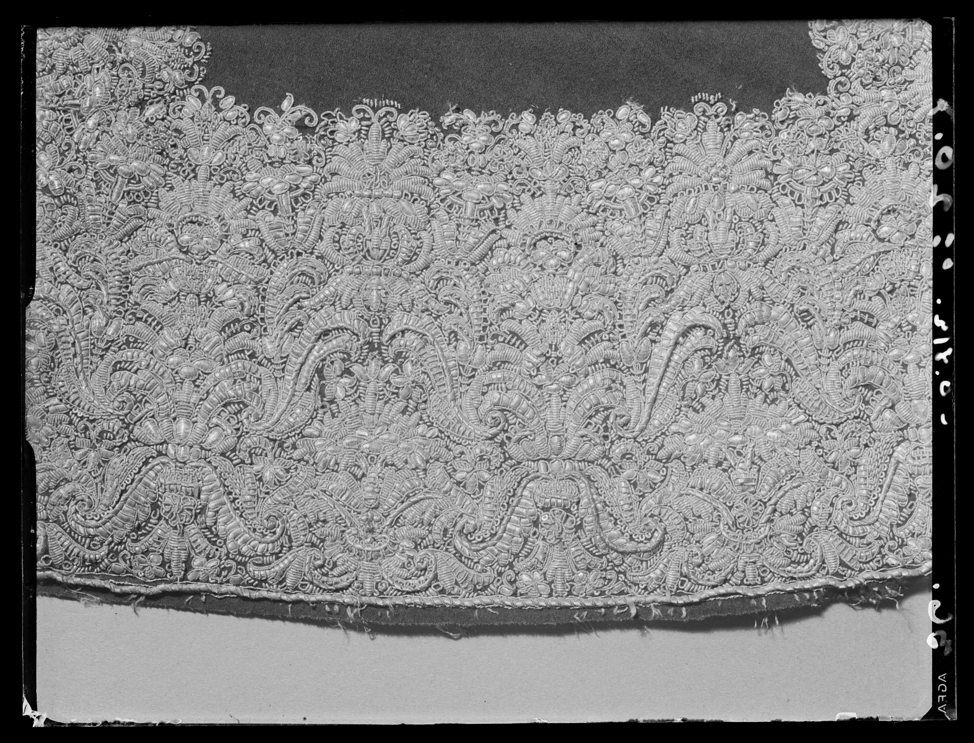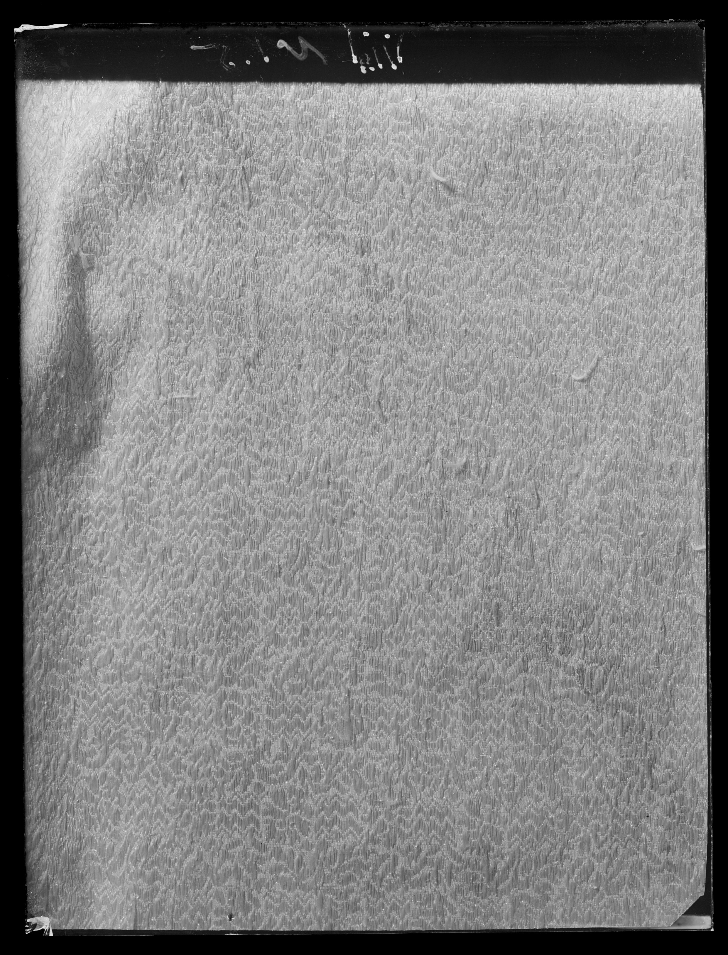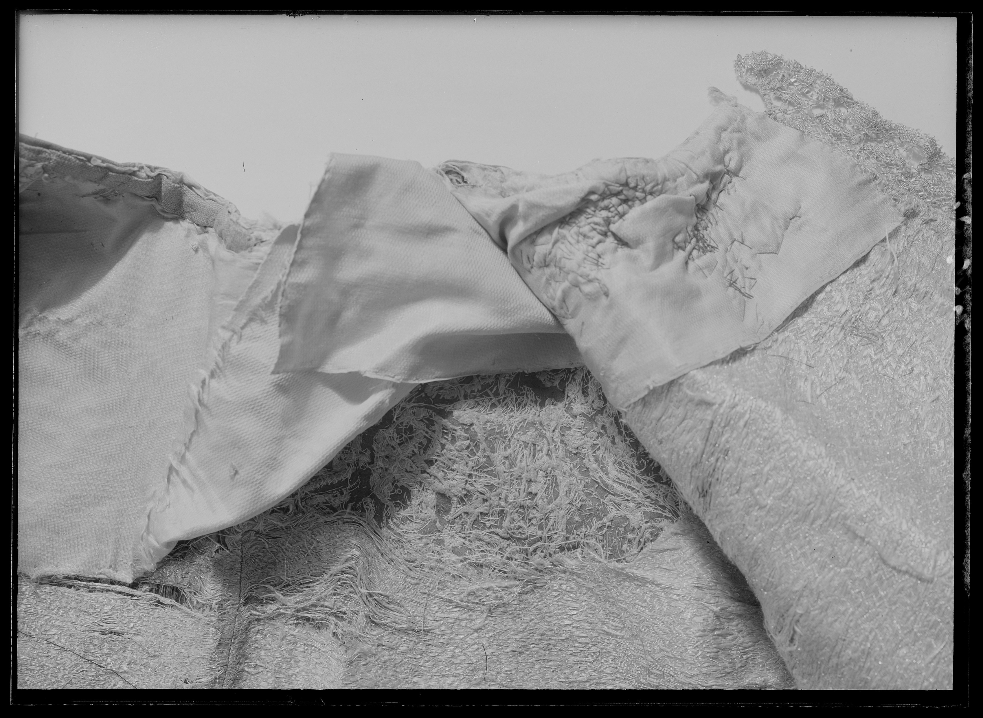 Tröja. Livplagg av innocenttyp. Skuren i 2 lika stora framstycken, vars framkanter följer staden, 1 helt bakstycke, 1 ståndkrage, 10 små skört samt 2 svängda stycken för varje ärm. Plagget är sytt av rik silverbrokad och har även foder av silverbrokad i annat mönster. Tröjan är försedd med mellanfoder av linnelärft (20x19 tr/cm2) och planschetter, triangelformade styvnader nedtill i de spetsiga framkanterna. Kragen är på insidan fodrad med vitt mönstrat siden av samma sort som återkommer i tröjan till dräkt nr 3401 och har mellanfoder av linnelärft (25x21 tr/cm2) med inlagd styvnad, troligen fiskben. Vänsterframstycke har 21 knapphål för de bevarade 21 knapparna i höger framstycke. Knapphålen är sydda med vitt högertvinnat silke, 8 stygn/cm över 1 tråd. Knapparna, d: 1,3 cm, är med silverlansomspunnet vitt, högertvinnat silke, trind kantilj och silverlan. Tre stycken likadana knappar sitter i kragen, men motsvarande tränsar saknas. Silverbrokaden som utgör tröjans övertyg benämnes rik silverduk. Den kan beskrivas på följande sätt: Vådbredd minst 50 cm (72x18 tr/cm2). Varp av tunt, vitt otvinnat silke. De grövre otvinnade vita inslagstrådarna bildar dels botten med silverlan i varje inslag, dels blommönster av flotterade trådar med högertvinnade silverlan i varje sådant inslag. Stad: 1 cm (10 gröna, 4 orange, 12 gröna, 1 vit tråd). Mönsterrapport: 8,8 x 8,8 cm. Mönstret är symmetriskt uppbyggt med halvnaturalistiska blommor sammanhållna i rosettlika arrangemang. Ärmarna är avsedda att ha den främre sömmen öppen. På de motsatta, bakre, sömmarna har ärmarna sprund nedtill vid handleden. Man har avsett att vika upp ärmensnederkant till uppslag. Förutom de 10 trapetsformade skörten sitta i midjan, på tröjansinsida 7 st stroppar (klädda med foderbrokaden) vardera med 2 hål för de 7 silverhakarna ibyxlinningen. 4 sitter på den vänstra sidan och 3 på den högra. Silverbrokaden som utgörtröjans foder benämnes också i de äldre inventarierna silverduk. Denna har en vådbredd av minst 51 cm (c:a 70 x 18 á 19 tr/cm2). Mycket tunn och tät varp avvita, otvinnade silkestrådar, där dessa bildar botteninslag ha de försetts med silverlan pårätan. De flotterande mönstertrådarna är däremot endast av vitt silke. (Ripsvävnad). Stad:0,8 cm (12 gröna, 4 gulorange, 10 gröna, 1 tjockare vit tråd - vävnad i tuskaft).Mönsterrapport: h 7,7 cm, b 6,6 cm. Det är ett halvnaturalistiskt blomstermönster med enkarakteristisk figur som erinrar om en fjäder. Samma silverbrokad återkommer som foder itröjan nr 3389. All garnering och dekor av spetsar har sprättats bort och tröjans foder harskadats upptill. Kragen har även brännskada vilket tyder på att den lämnats till"utbrännning". På kragens insida har man med bläck märkt plagget N 43, en åtgärd somstammar från 1789.