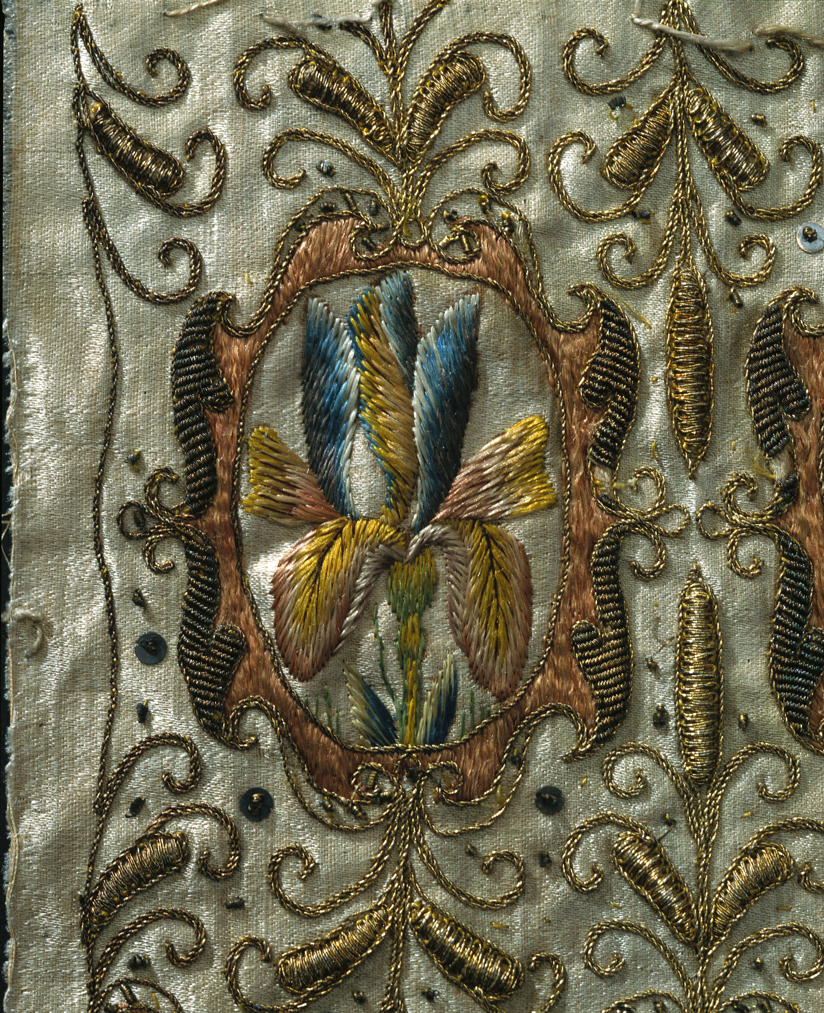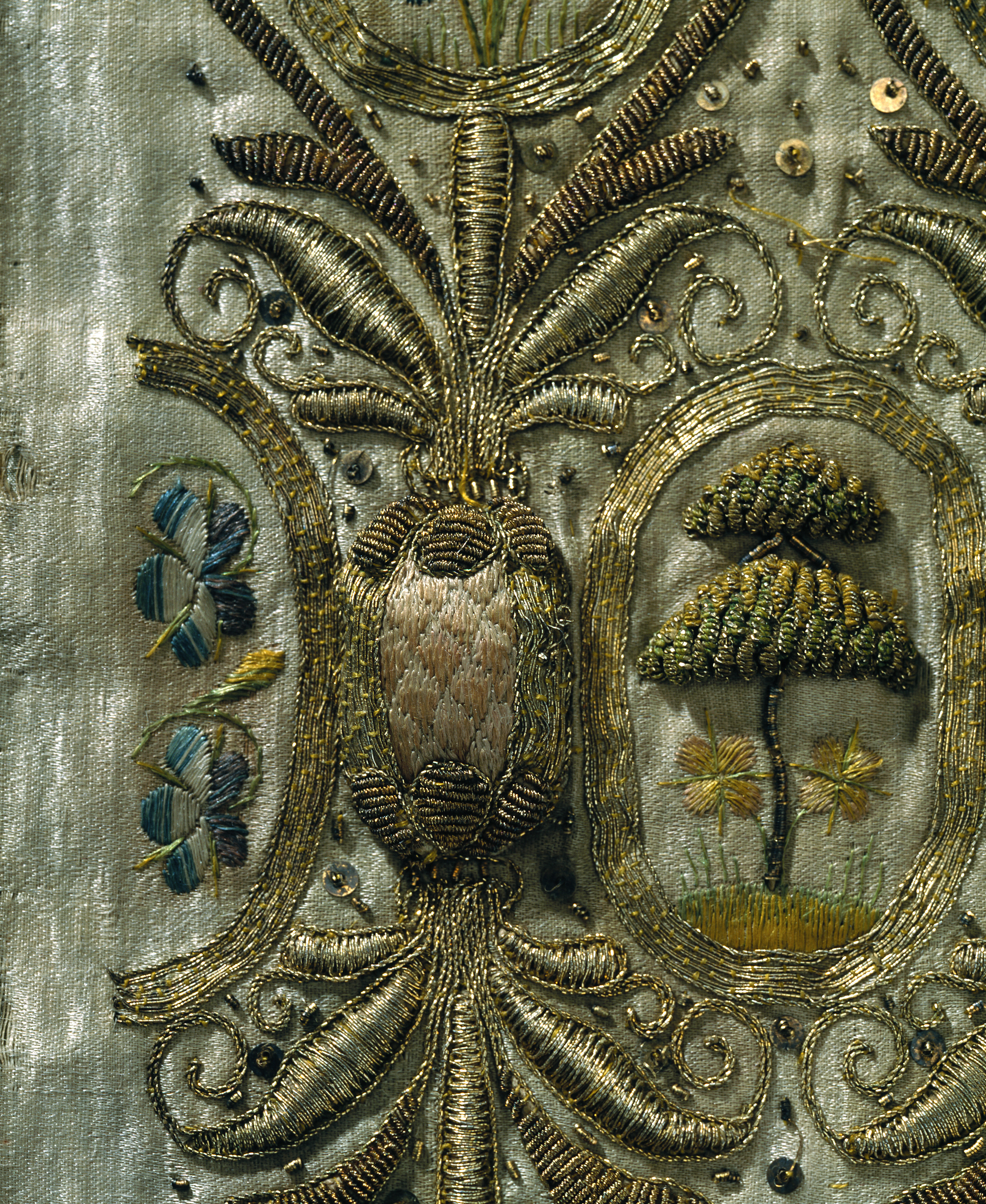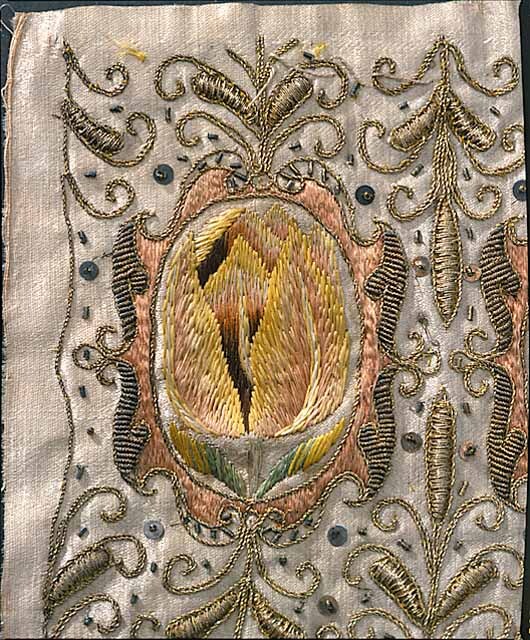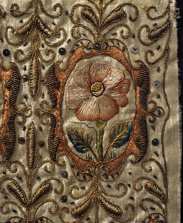 Möjligen tillverkad i England. Ovandel till muff, vilken ursprungligen varit fodrad med harskinn. Av vitt sidenatlas med guld, -silver- och silkebroderi. Motiv med blommor inskrivna i kartuscher omgivna av vegetativa bladornament i engelsk renässansstil. Två av de tre muffarna är lika (19850-19851) medan denna tredje (19852) avviker något. Kartuschernas dekor är lika för alla tre: tulpan, ros, nejlika, iris samt i mitten ett formklippt träd och på sidorna små penséer. Avvikande för denna är att även ett par kottar ingår i det broderade mönstret. Klädkammarens inventarium 1672: "3: St: harskinss Muffar af mahl fördärfwade -------15:-"
