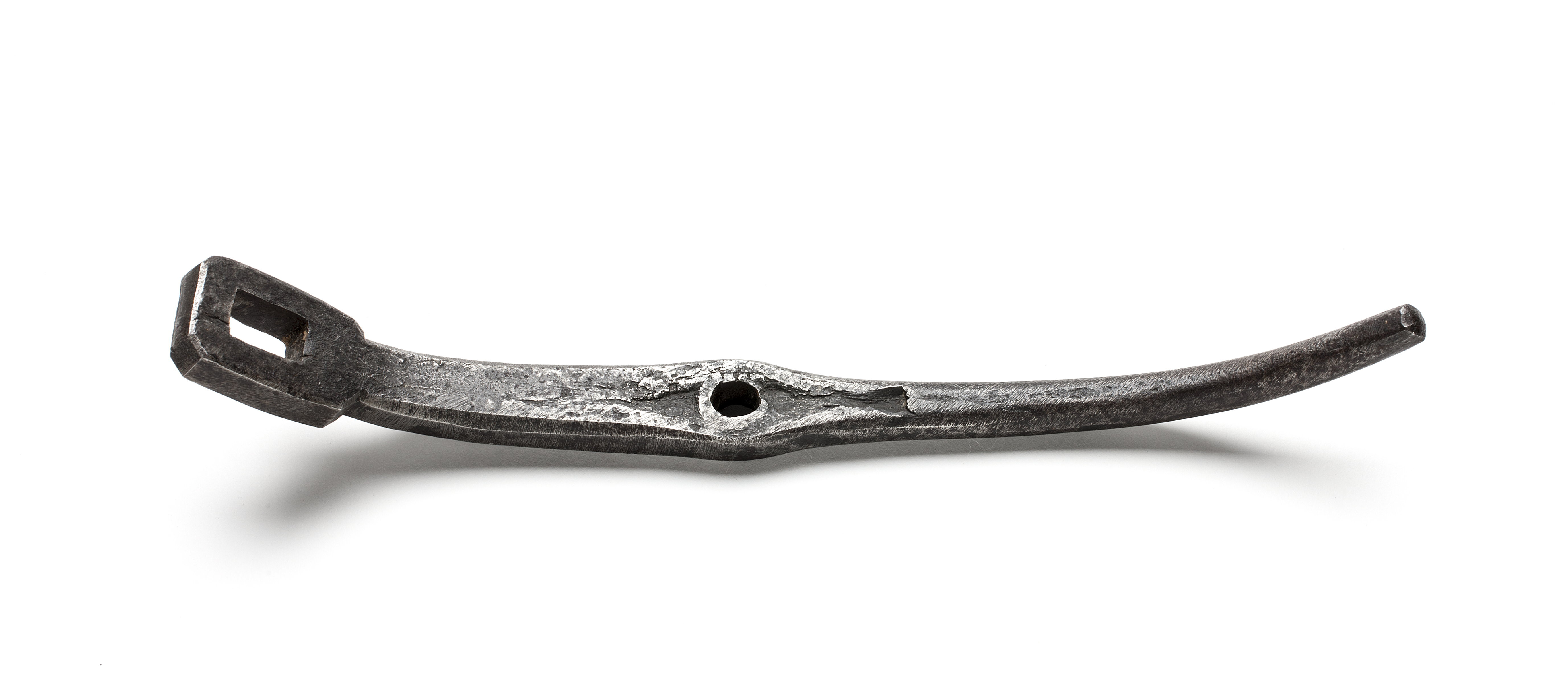 Skruvnyckel (?) av stål, böjd.