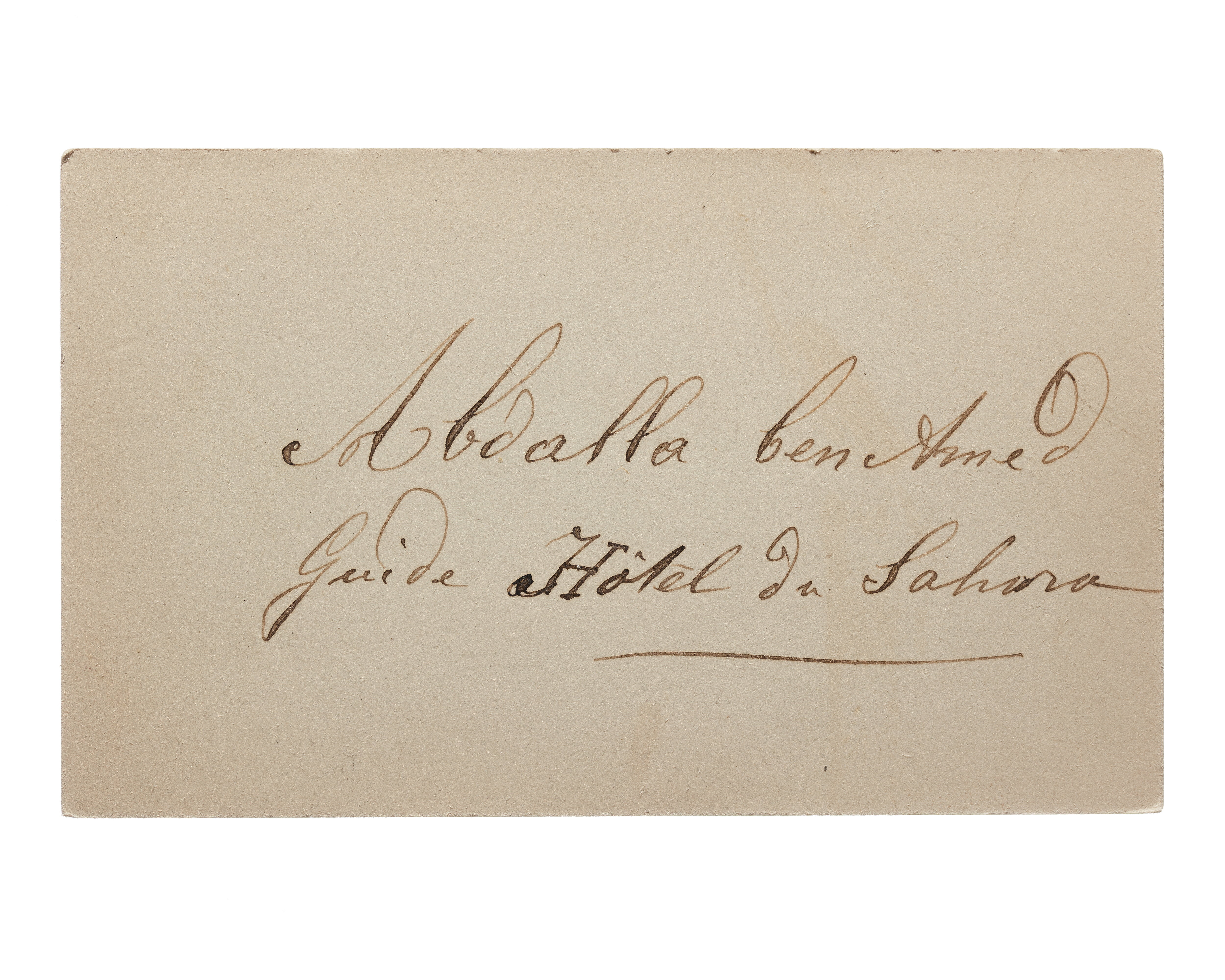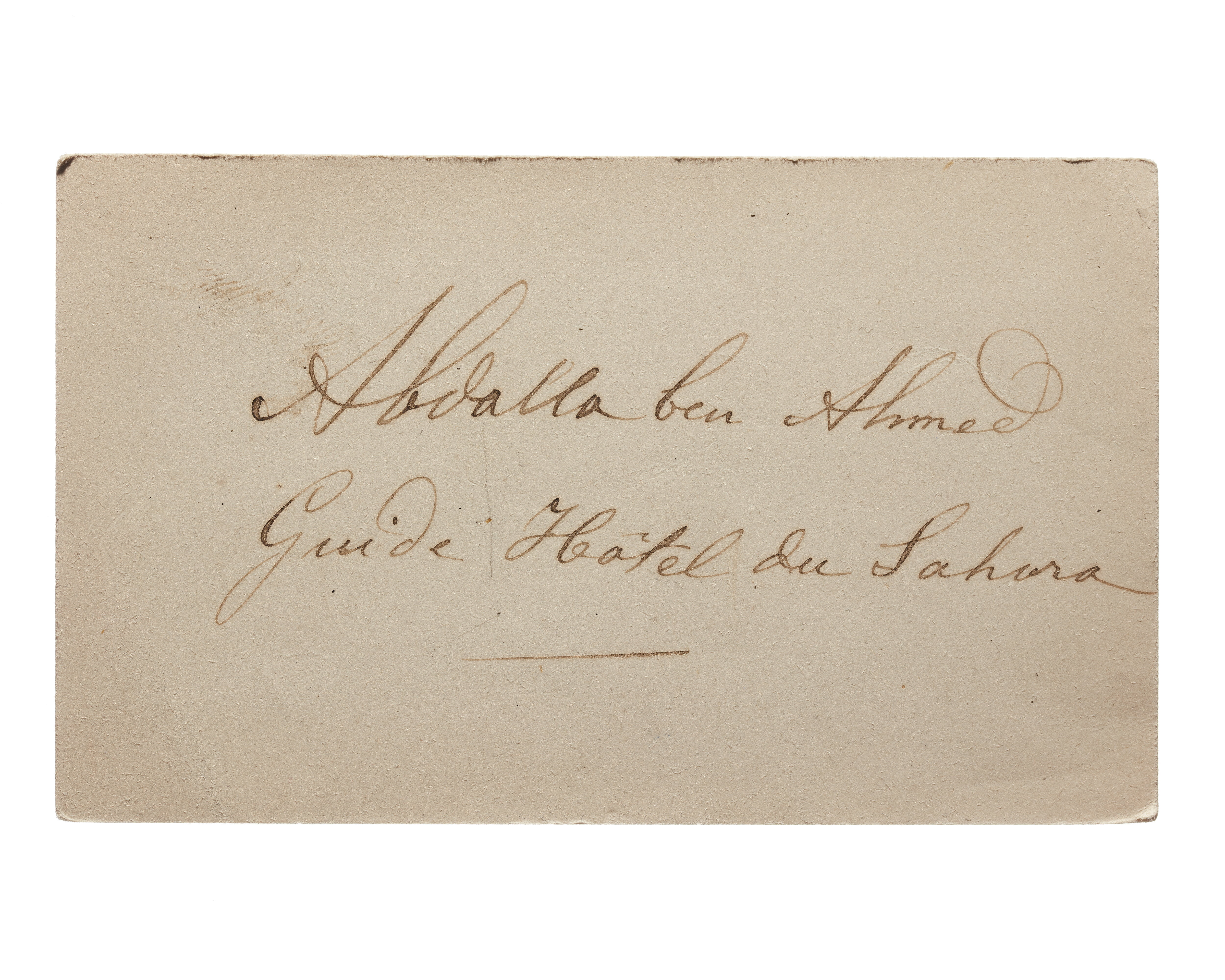 Två visitkort från Abdalla ben Ahmed, guide, Hotel du Sahra. Båda daterat 1900 eller 1901.