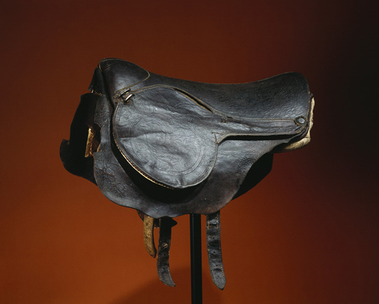 Säte, kåpor och sadeltäcke av svinläder. Säte med konturlinjer av ljusa läderpassepoiler. Kåpor med ljusa sömmar och pressat palmettmönster. Vid bakvalvet två järntännikor. Vid främre valvet vid övergången mellan sätet och kåporna på var sida två järnöglor för fästande av pistolhölster. Sadeltäcke med pressad randad kantbård. Ofodrat. Stomme av trä klädd med ljust skinn på insidan och med näver på utsidan. Bossor med på insidan klädda med brunt läder i vilket stommen stuckits fast i fickor på utsidan oblekt blaggarnslärft. Faststoppade med ull och tagel. Bossorna fastnitade utmed bakvalvet. På stommens vardera sida två läderstroppar och en stålkrampa för sadelgjordens resp. stigbyglarnas fastspännande. Dubbel sadelgjord. Remögla för ryggstycket.