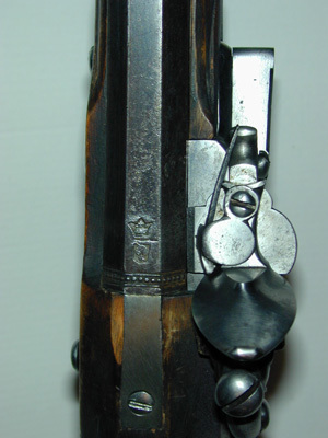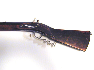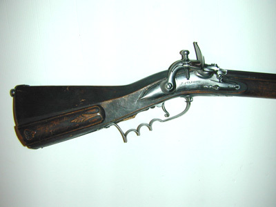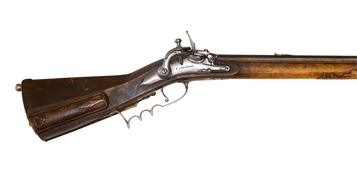 Åttsidig, blånerat, tolvräfflad pipa med blankt, svagt böjt, baktill tvärt avskuret svansskruvblad. På de tre övre faserna vid pipbasen inslaget en pärlstavsbård, vid mynningen en sicksackbård. På överfasen vid pipbasen stämplar: sjöblad och öppen krona (LRK vägl. 1921:209-210, Per Sjöblad). Riktmedel: Inlaxat ståndsikte av blånerat stål med lång, framåtriktad platta, avslutad med treflikigt blad. Infälld kopparskiva med siktskåra. Inlaxat stolpkorn av mässing. Fästning: Tre häften. Pipan fäst med krysskruv ovanifrån samt tre pipstift av stål. Flintsnapplås, springlås med välvt låsbleck, graverade, dubbla kantlinjer samt markering runt hanen. Punsad-graverad signering framför hanen: "S: STRANDBERG". Böjd, rundad hane med tvärt avskurna käkar, överkäken inlaxad i underkäken, käkskruv med päronformigt huvud. Kraftig, rundad fängpanna med bred fals. Batteri med ovalt omvändningseldstål, vulst upptill, triangulär ås nertill, fjäder-studel med 8-formig studelplatta på fängpannelocket. Invändig nöt med hel- och halvspännshak och studel, slagfjäder samt stång och stångfjäder. Fästning: Två låsskruvar. Avtryckare med upprullad ände. Rektangulärt avtryckarbleck av stål med avslutning baktill i form av treflikigt blad. Helstock av mörkt brunbetsad björk(?). Triangulär kolv med antydan till vinge, liten snidad volut vid framänden, plan över- och undersida på kolven. Snidat blad vid spetsrörkan. Kolvlåda med lock av stockens trä med kantlist samt snidat blad vid framänden, musselformigt grepp baktill. Beslag av stål. Slät bakpåt med kort, tvärt avskuren flik på kolvryggen, fyra fästskruvar, stödkula, graverat rustkammarnummer: "N:2". S-formigt svängt, välvt sidbleck med oval mittplatta. En + två profilerade rörkor, spetsrörka med lång, slät, konturerad spets. Slätt näsband. Varbygel med tre fingerlägen, främre armen 8-formig, välvd och avslutad med treflikigt, åsat blad, vid bakre fästskruven ett mindre, liknande blad. Tillbehör: Laddstock av annat träslag (alm?), framtill skodd med horn, l: 25 mm, baktill med ett invändigt gängat stålrör, l: 147 mm.