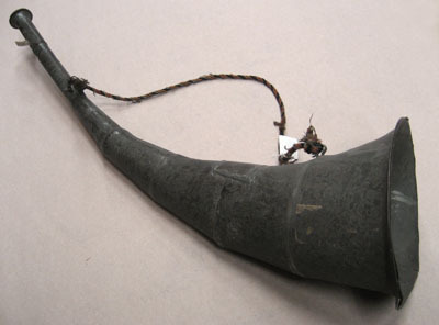 Böjt horn av plåt med stor klocka som mäter i diameter: 185 mm. Hornet är ihoplött upptill samt runt om av sju delar av vilka den främsta består i sin tur av två delar. Trapetsformad lagning upptill mitt på, bredd: 75 mm och 50 mm, höjd: 55 mm. Munstycke som mäter 38 mm i diameter. Metallring runt om klockans kant, som kanten är virad om, samt kopparring runt munstyckets kant. Snöre av svart, orangefärgat och grått, virat yllegarn, fäst i två öglor av plåt på hornets ovansida. I ena änden finns även rester efter beigefärgad, svart och röd linnekypert.