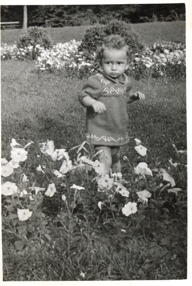 Svartvit bild på Luisa som barn, stående i ett blomsterfält