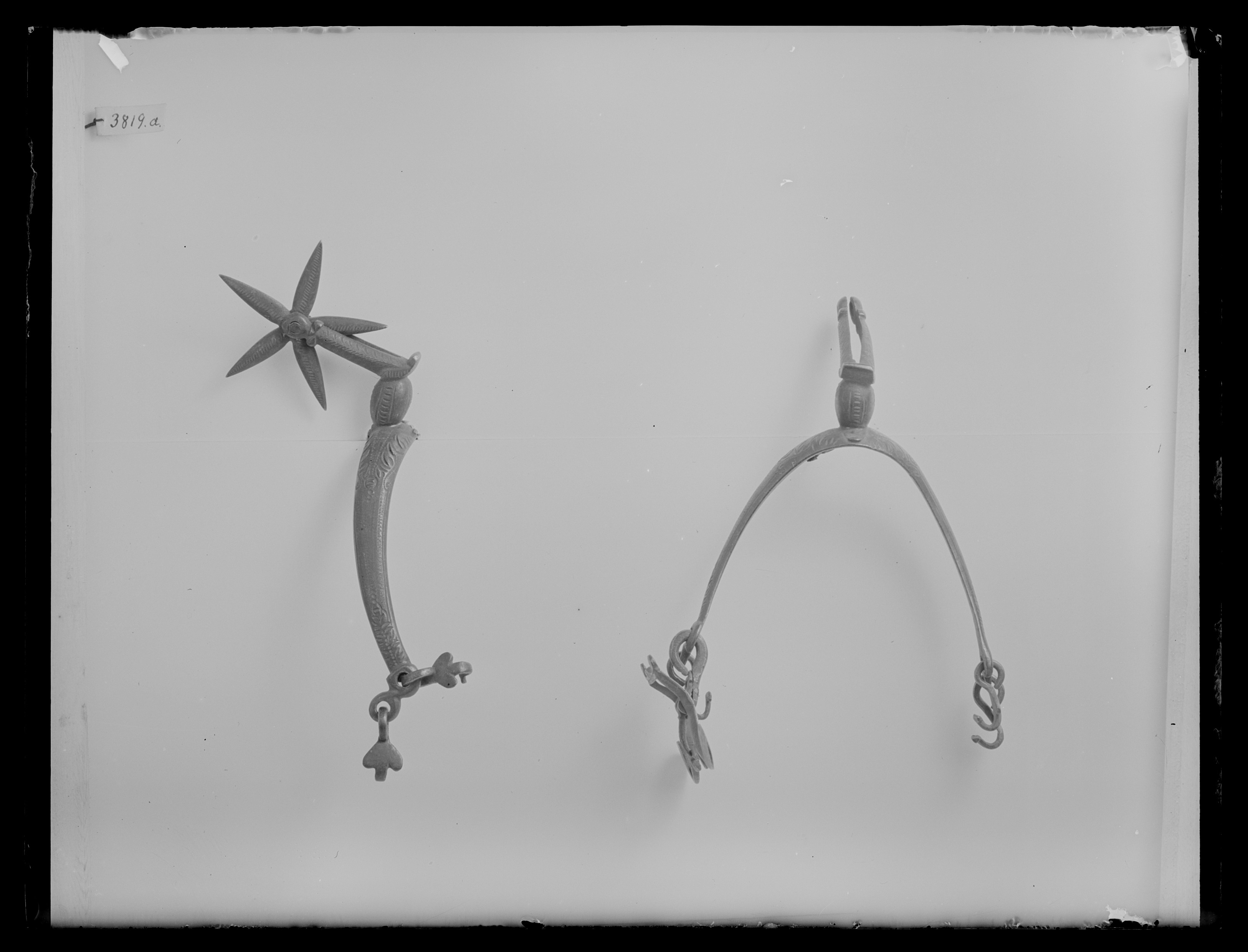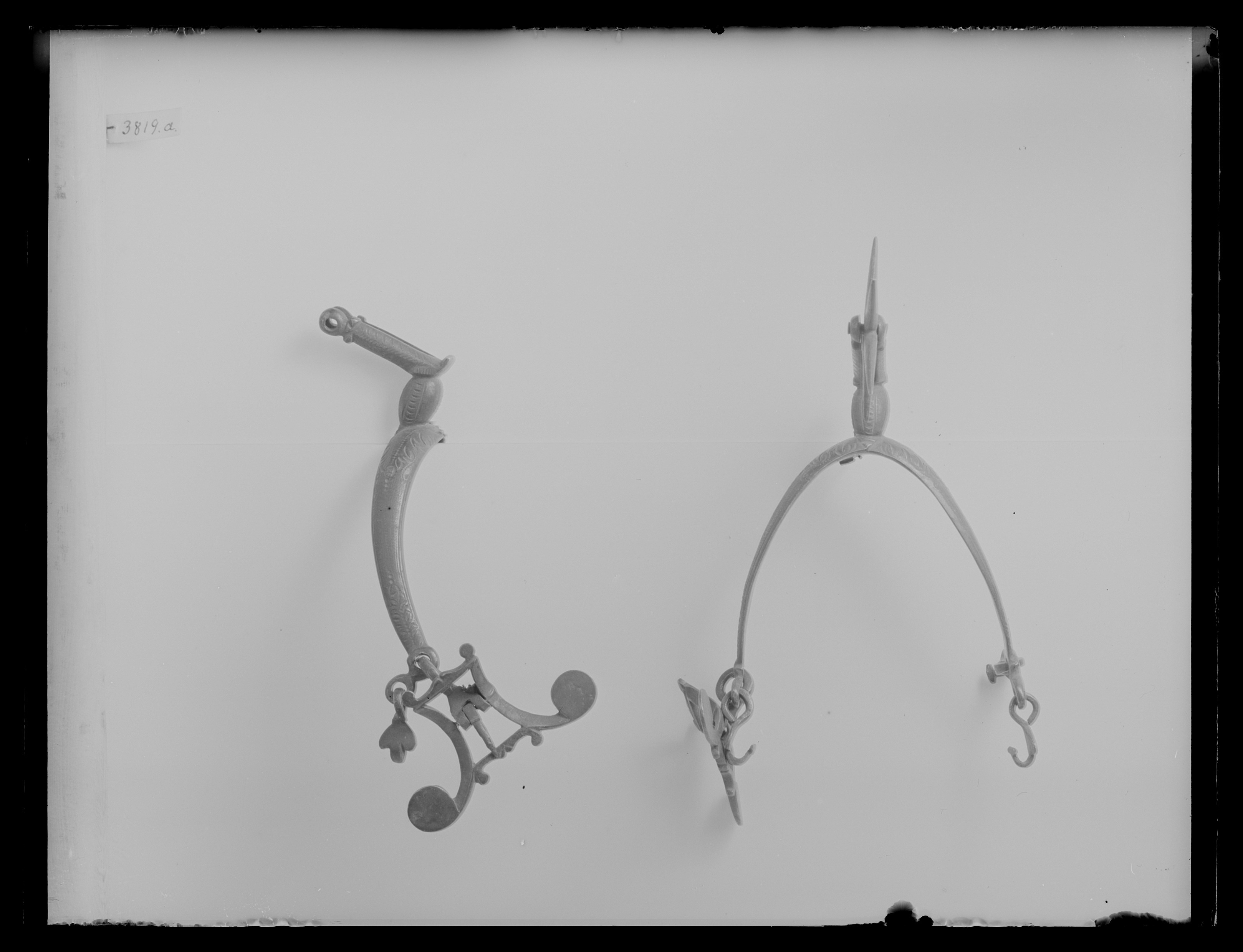 Sporre av stål med spår av försilvring och yttäckande punsad ornering. U-formade skänklarmed i ändarna två ringformiga hållare i ena, två hjärtformiga hakar i den andra nedre enhake, i den övre rektangulär, konkav remsölja med kraftigt utdragna hörn. Halsvinkelformigt nedåtböjd, delen närmast skänklarna äggformad. Klinga stor, femuddig.