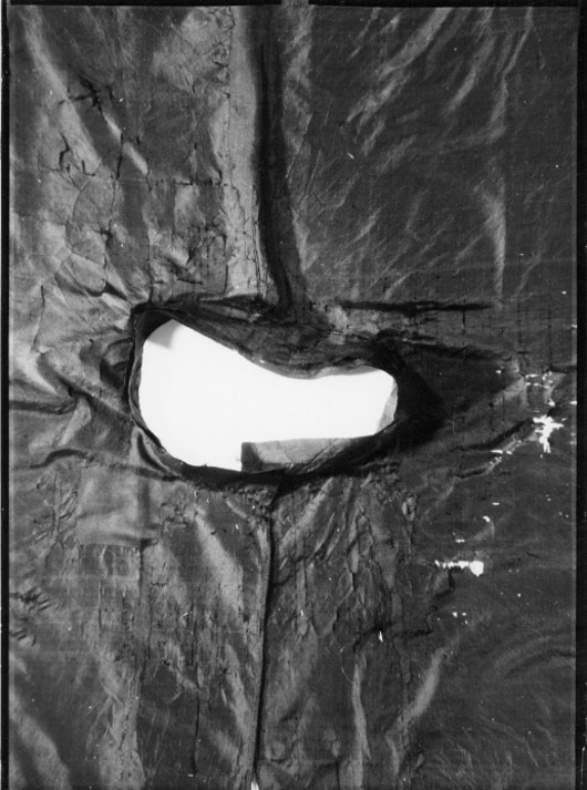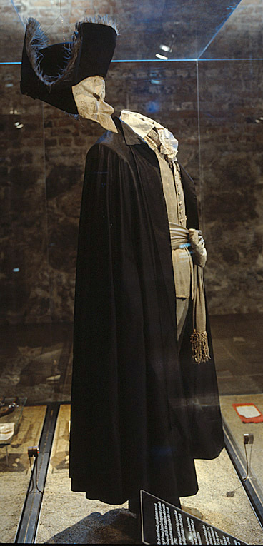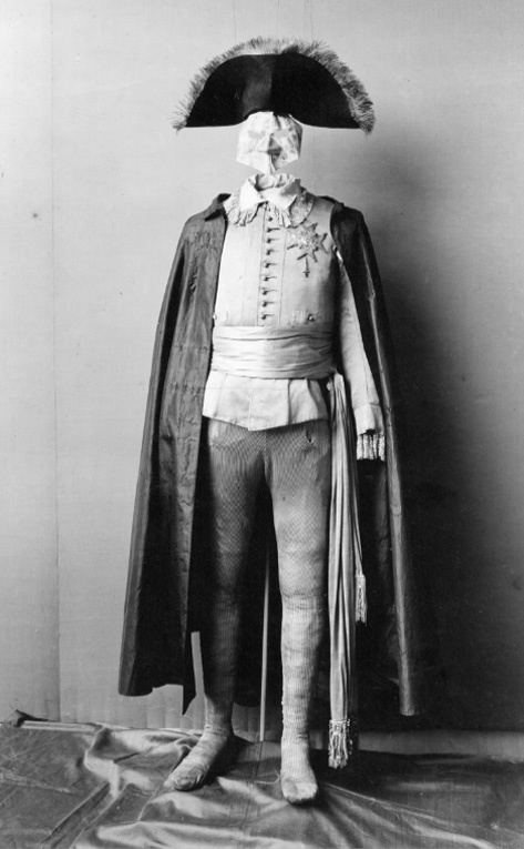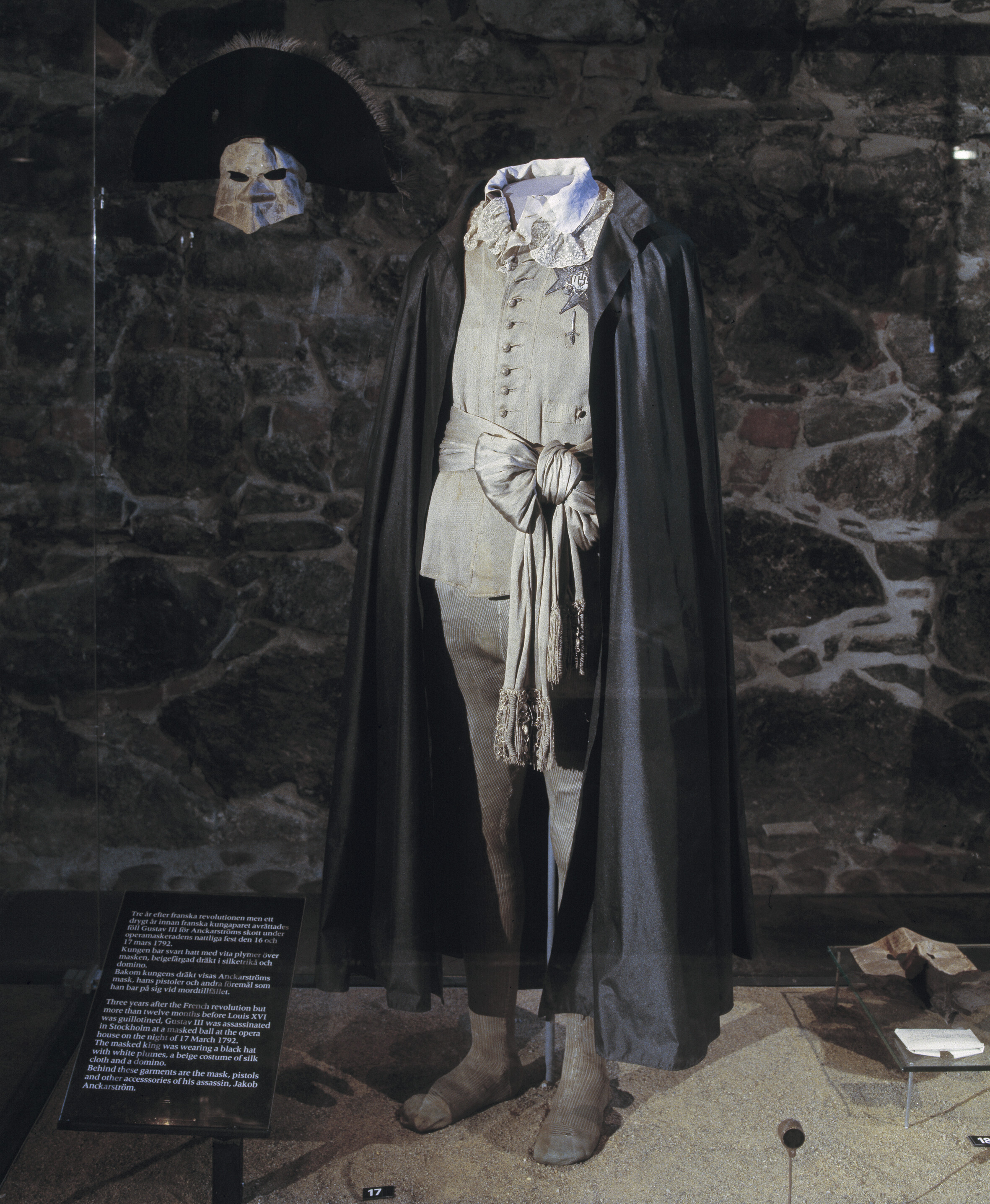 Kon. Gustaf III. Klädningen bars då konungen blef skjuten på maskeraden i operahuset natten emellan den 16 och 17 Mars 1792.