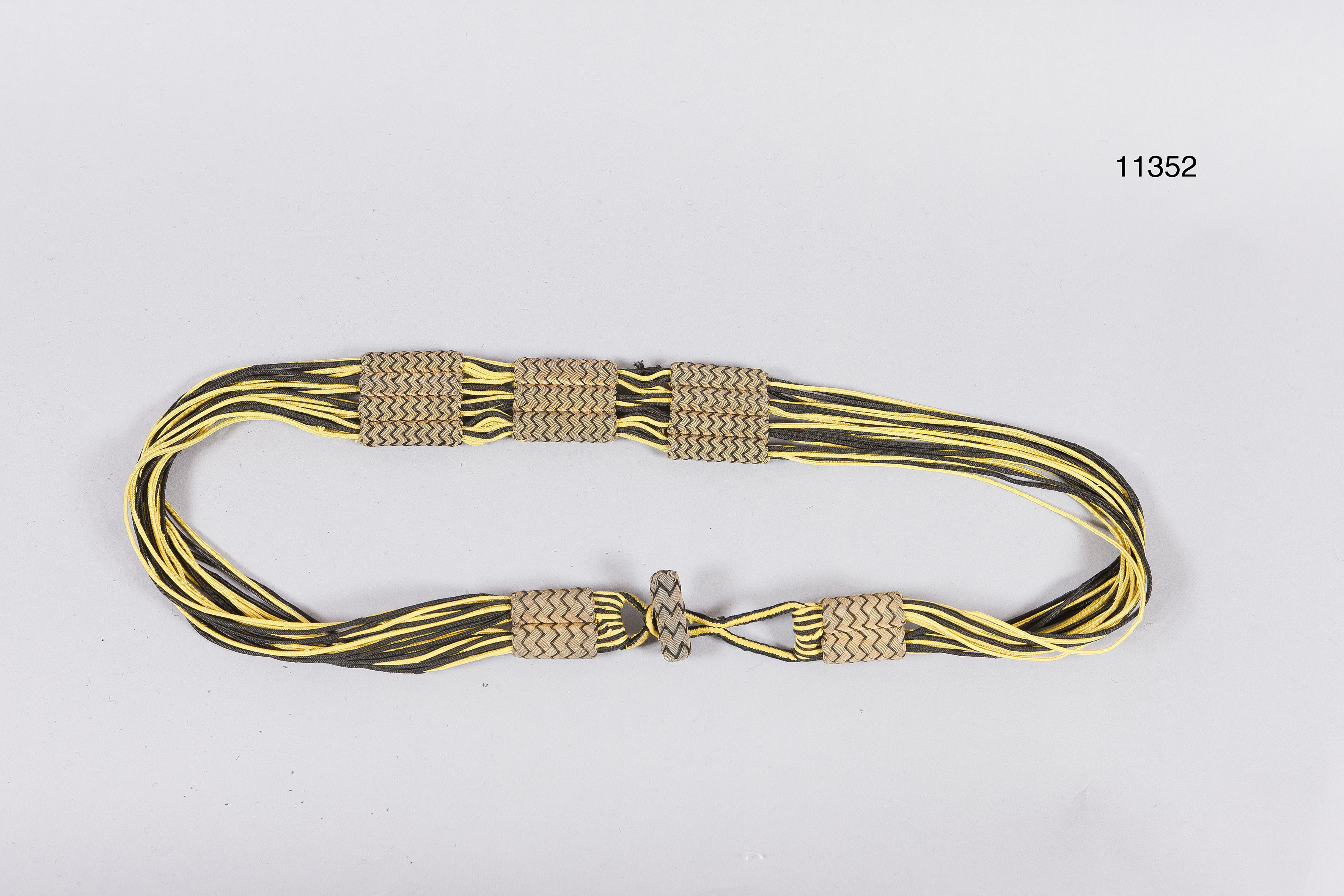 Skärp av svarta och gula silketrådar i fyra grupper med sju snoddar i varje. På tre ställen rektangulära plattor, på utsidan i form av fyra rör av guldtråd och svart silke, på insidan fodrade med gult skinn. Knäppning med spolformig knapp och ögla, på var sida om denna rektangulär platta av lika utförande som de övriga, dock med två rör.