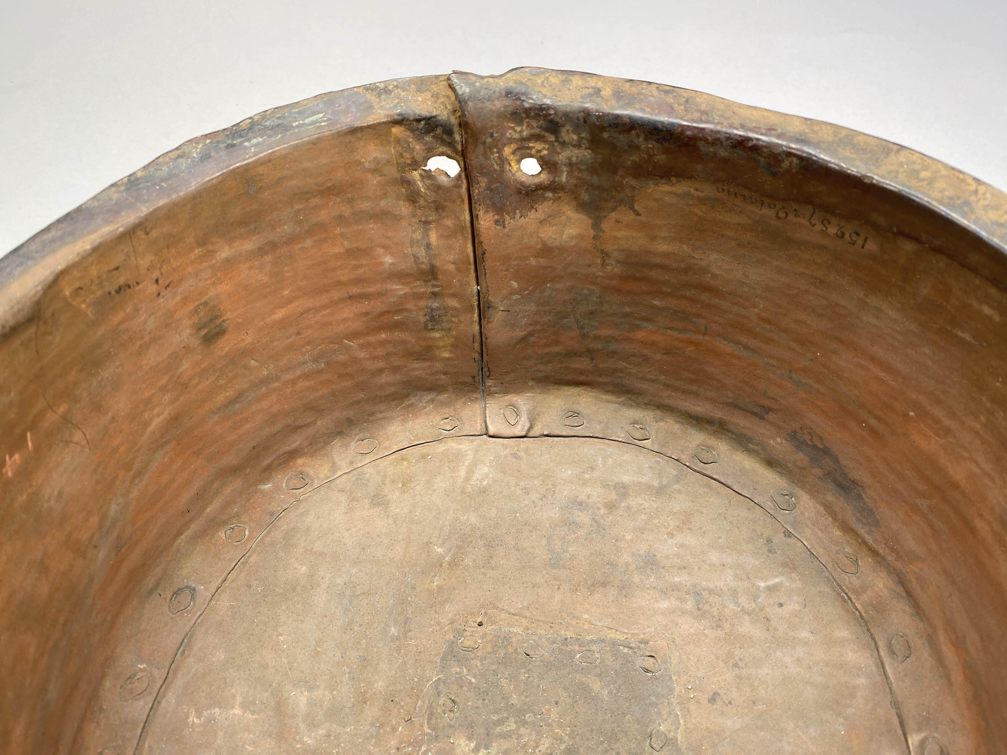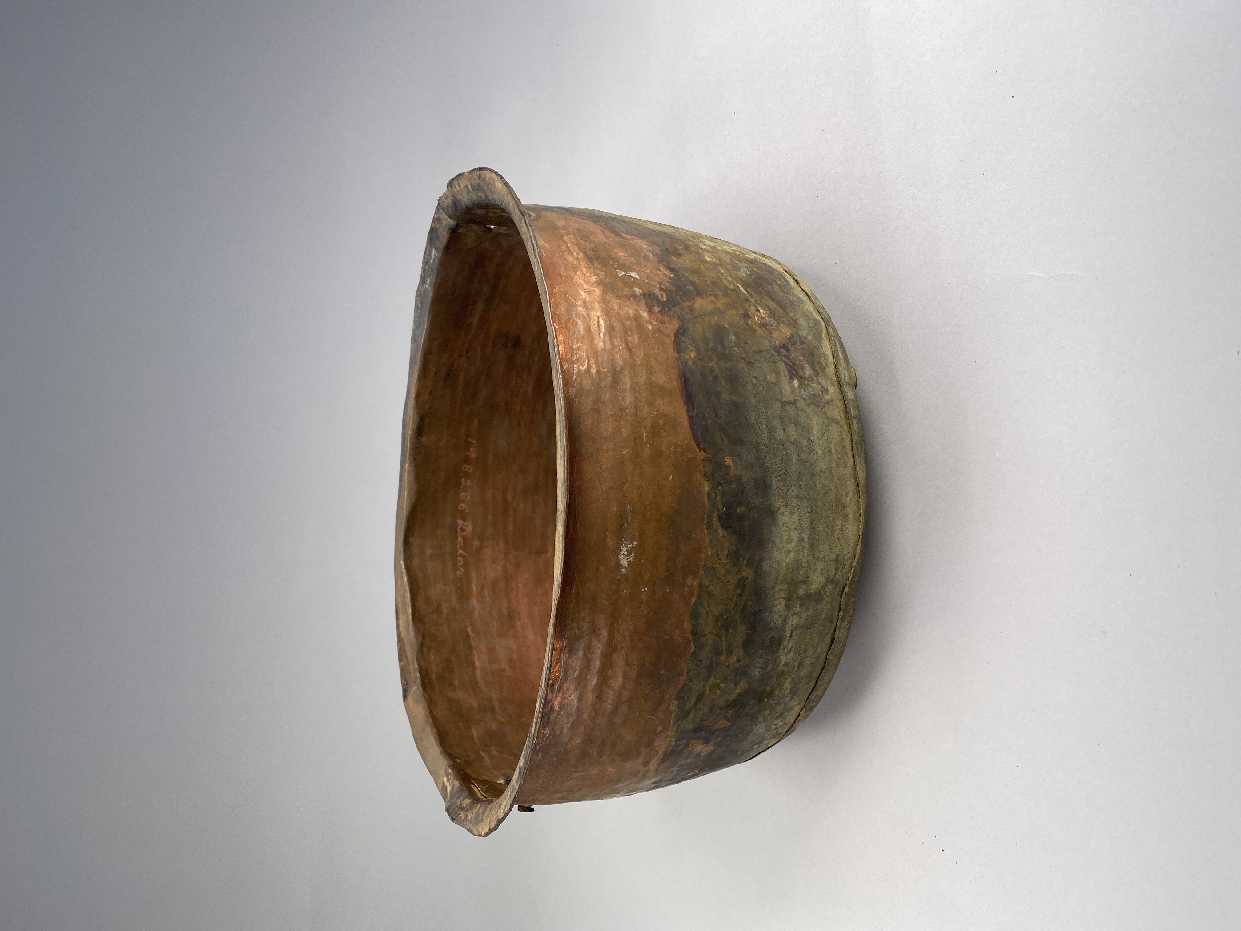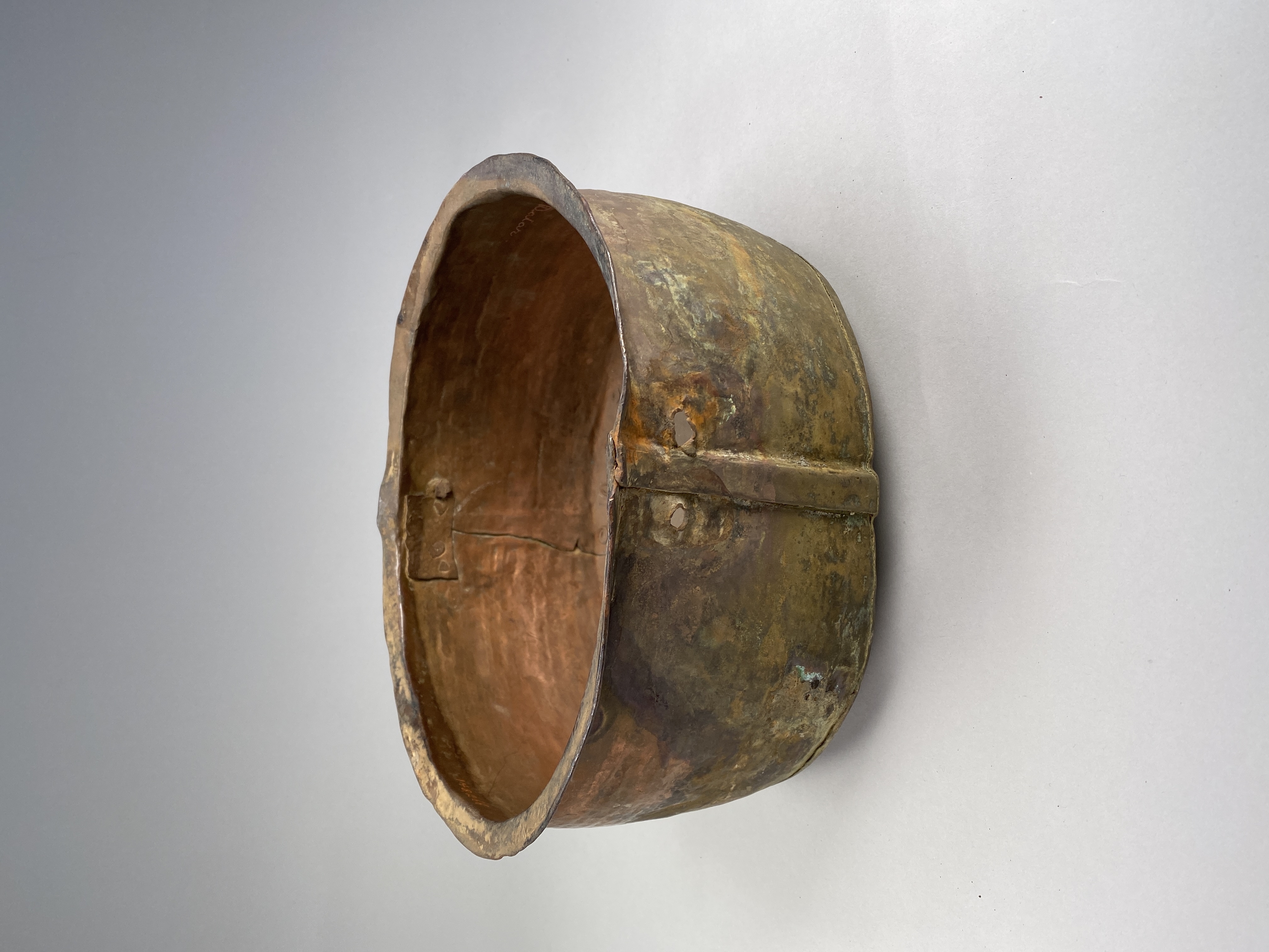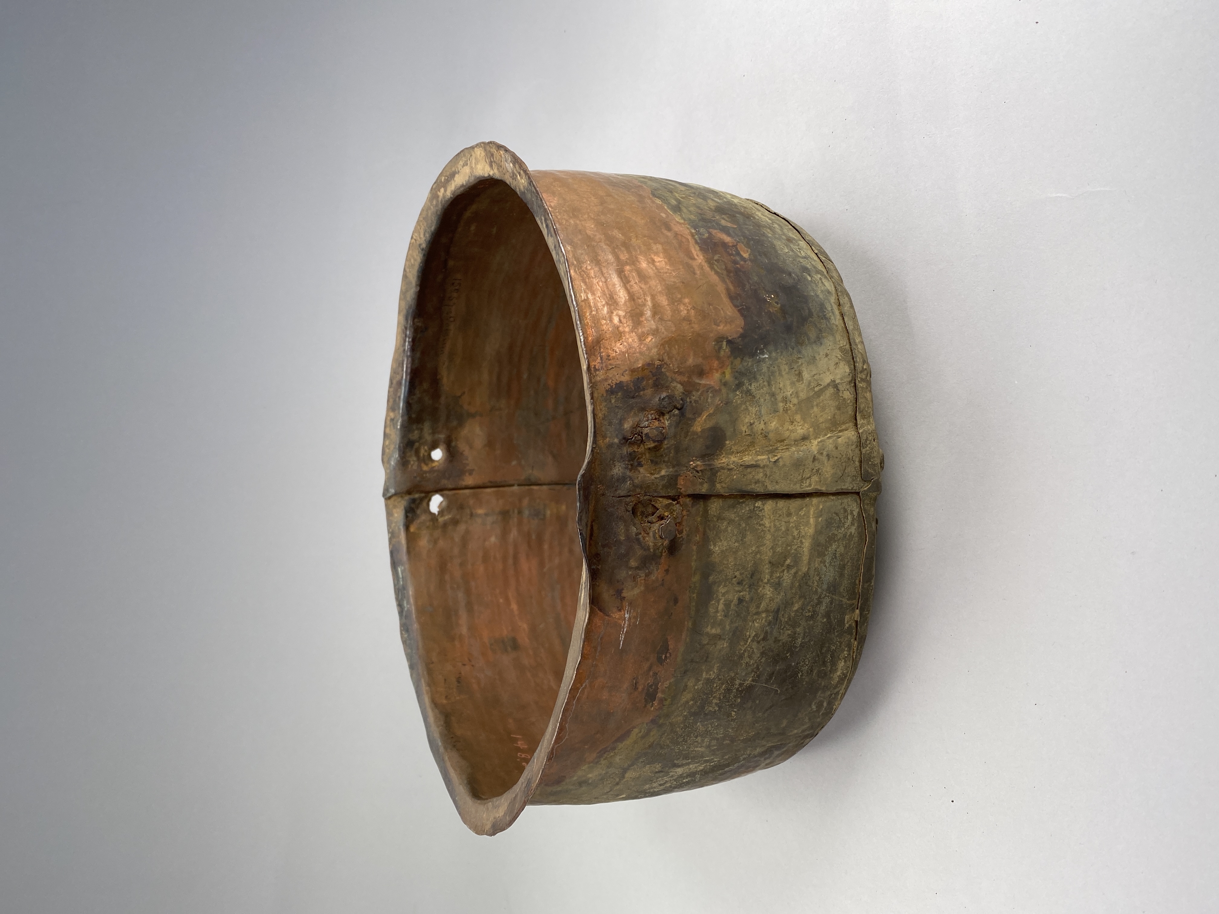 Ämbar av koppar med två märken efter hankfästen. Ämbaret är nitat av tre plåtar.