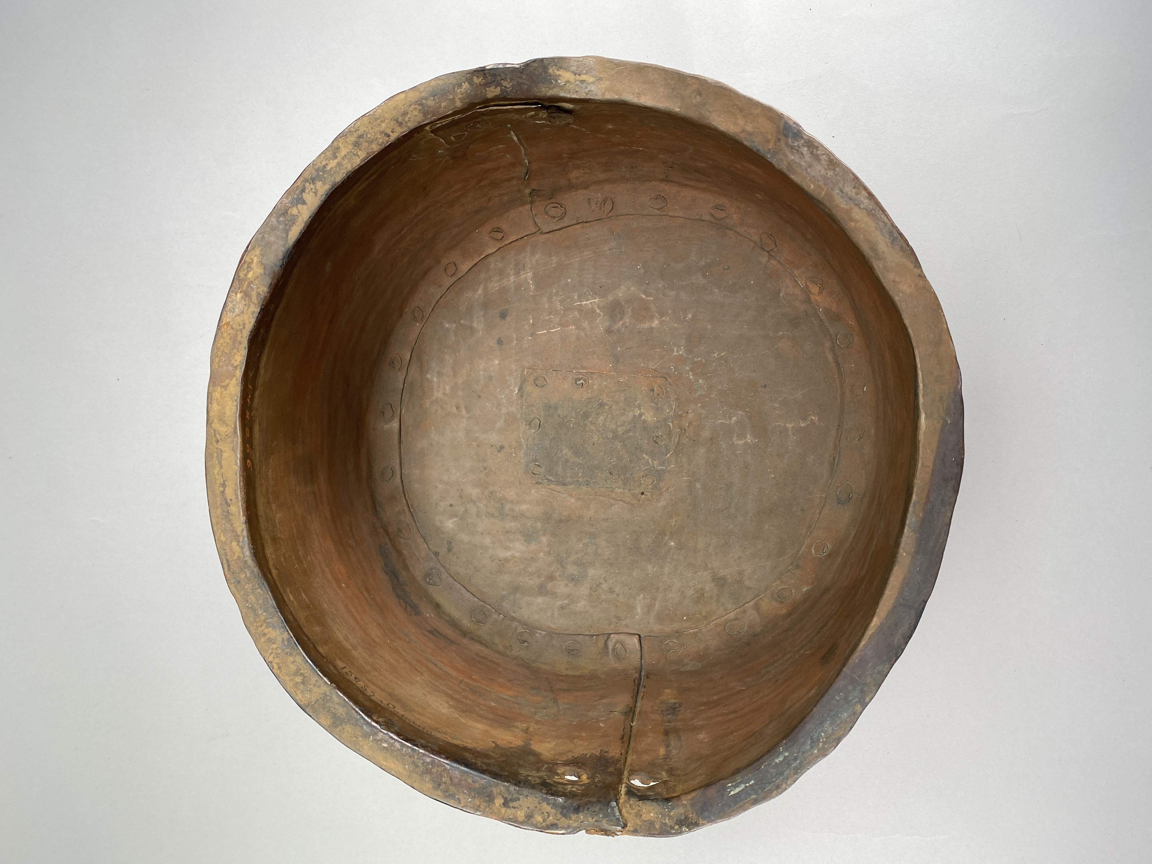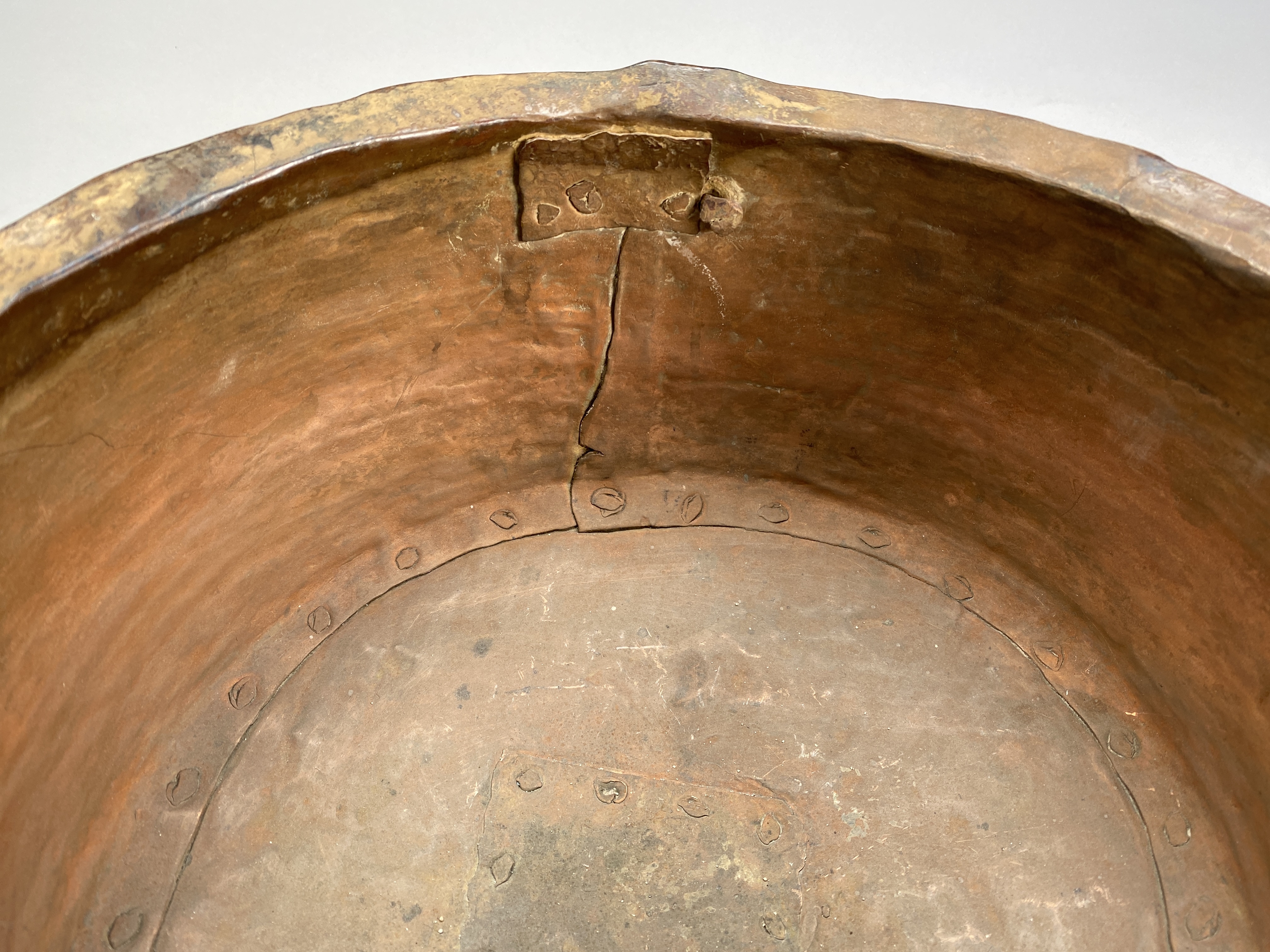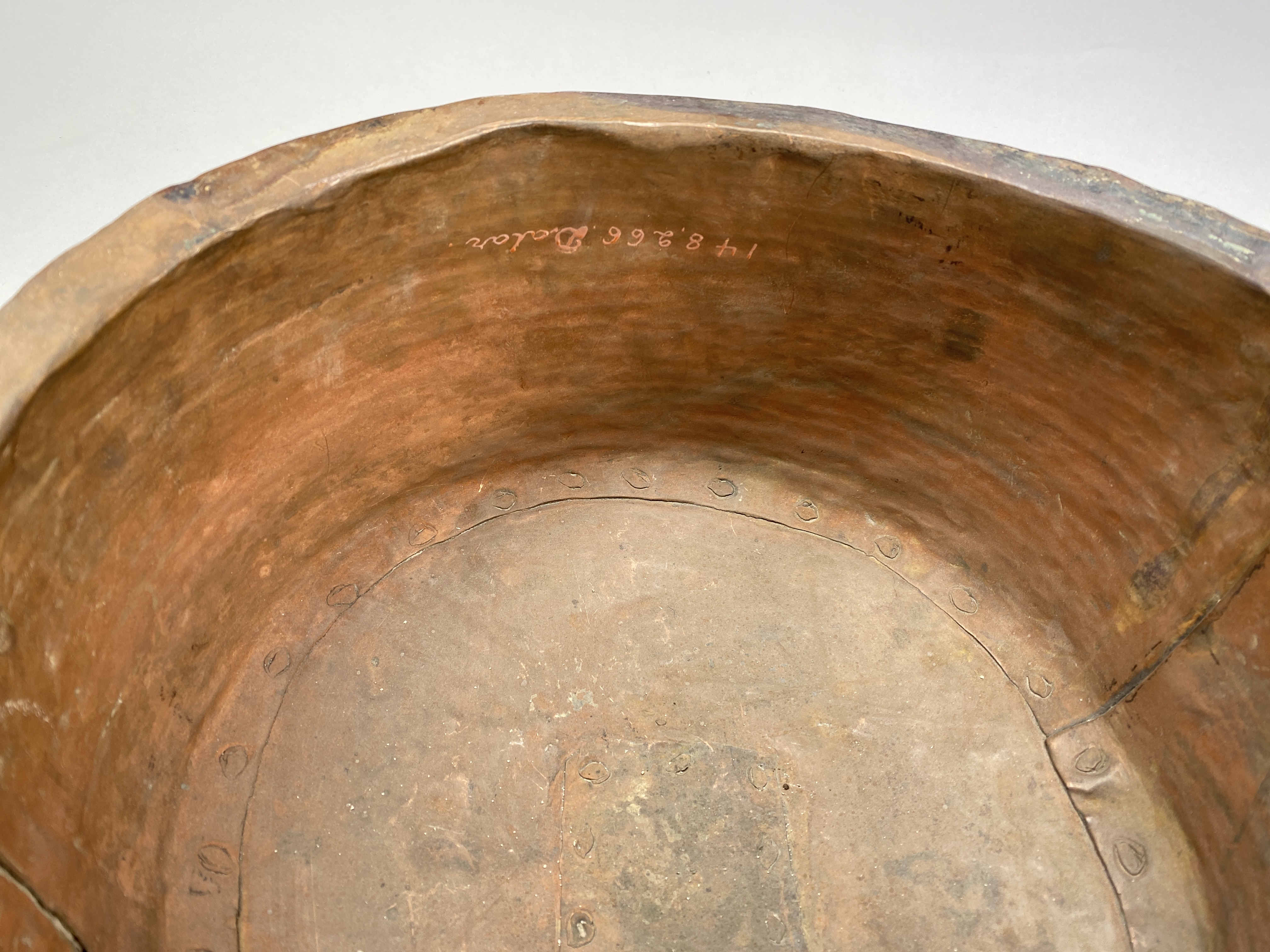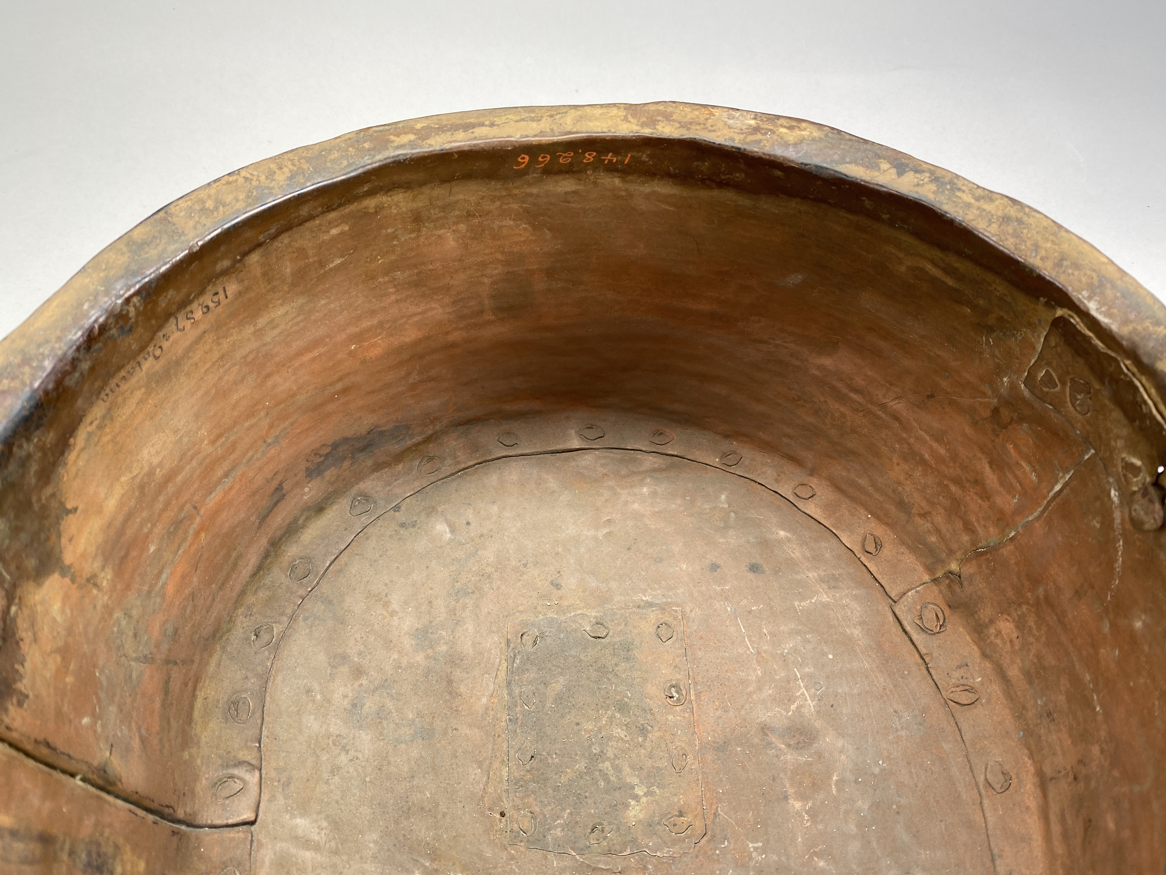 Ämbar av koppar med två märken efter hankfästen. Ämbaret är nitat av tre plåtar.