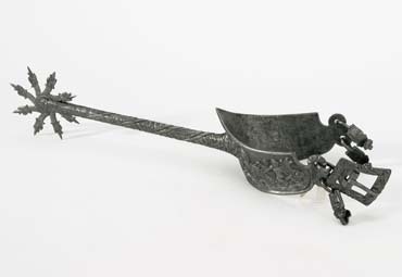 U-formade breda, 35-55 mm, plana skänklar vidare uppåt. Något böjdauppåt mitt bak slutande i en spets uppåt. I skänklarnas ändar utskott med två hål, i enaänden med två maskaronformade hakar, i andra med en likadan hake i nedre hålet och i övreen närmast rektangulär sölja, med ciselerad bladdekor. Skänklarnas utsida dekorerad i stålsnitt, scener med vattenväsen, kvinnor, småbarn, delfin, tritoner. Lång, rak hals med spiralvridna lister mellan listerna svårtydd inskrift i relief med gotiska bokstäver på tyska och latin. Åttauddig klinga, med uddar i form avdrakhuvuden.