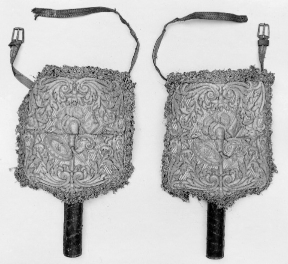 Frankrike 1600-t mitt. Ingående som nr 5 i den franska gåvan till Karl XI 1673, för hästen "Le Crusque". Sadelhölster av rött läder. Stora rektangulära hölsterkappor med ficka och yttäckande reliefbroderi av guldtråd med inslag av silvertråd. Mönster i form av akantusrankor, stiliserade franska liljor och på mitten en trofégrupp. Kappan fodrad med rött läder. Hölsterrem av rött läder ca 20 mm bred, rektangulär sölja av förtent stål. Hölstret invändigt fodrad med rött ylle.