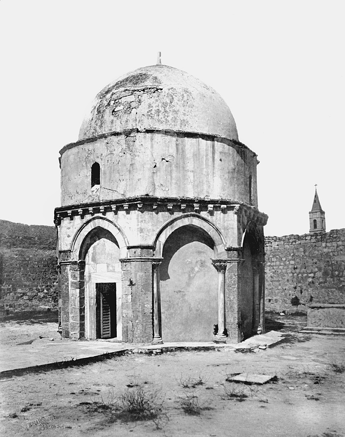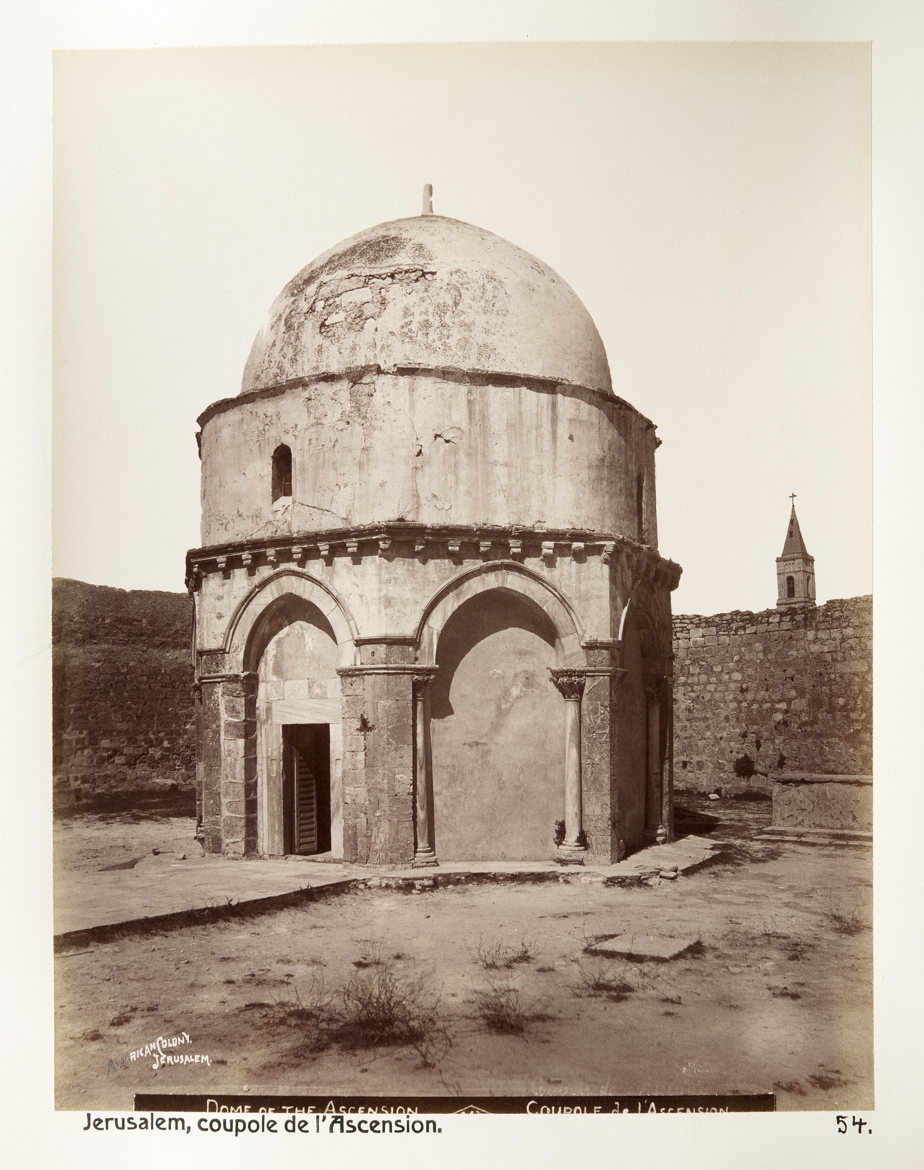 Text på originalet: "Dome of the Ascension/Coupole de l'Ascension". Jerusalem. Fotografierna LXVI:N.01.-180. kommer från resan till Palestina och Syrien som Wilhelmina och Walther von Hallwyl gjorde den 30 mars-27 april 1901. De lämnade Sverige den 5 november 1900 för Egypten, där de stannade till den 28 mars 1901, då de fortsatte till Palestina. Med på resan var Wilhelminas sällskapsdam, fröken Ida Uhse. Den 27 april fortsatte de till Turkiet och Mindre Asien. De mindre fotografierna (utom de från Samos) LXVI:N.90.-100. är tagna av Wilhelmina själv, under en resa till häst från Jerusalem till Damaskus 8-20 april 1901. Övriga fotografier är inköpta av Wilhelmina i Jerusalem, Damaskus och Beirut. Alla uppgifter kommer från Ida Uhses reseanteckningar.