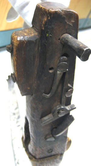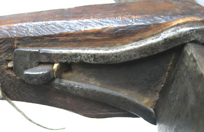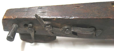 Båge av mörkt stål, fäst i en urtagning i stocken med på var sida en krampa, baktill fäst runt en genomgående stålten och framtill med en stålhake. Ändarna smidda till utåt svängda fästen för strängen, som sakans. Långsmal kolv av björk med fyrkantigt tvärsnitt och fasade kanter. Framtill mot bågen bredare, sedan inåt avsmalnande med lätt insvängd undersida, handgrepp?, kraftigare omkring nötläget och avsmalnande avslut med på undersidan klack av trä fäst med två träpluggar. Nötläge och nöt av vitt ben / horn, fäst med lindat snöre genom borrade hål i stockens sidor. På undersidan urtagning. Baktill på höger sida utanpåliggande avfyringsmekanism av tre nitade rörliga delar och svängd avtryckare. Bakom dessa ett borrat hål och en genomgående ten med utstickande ändar.