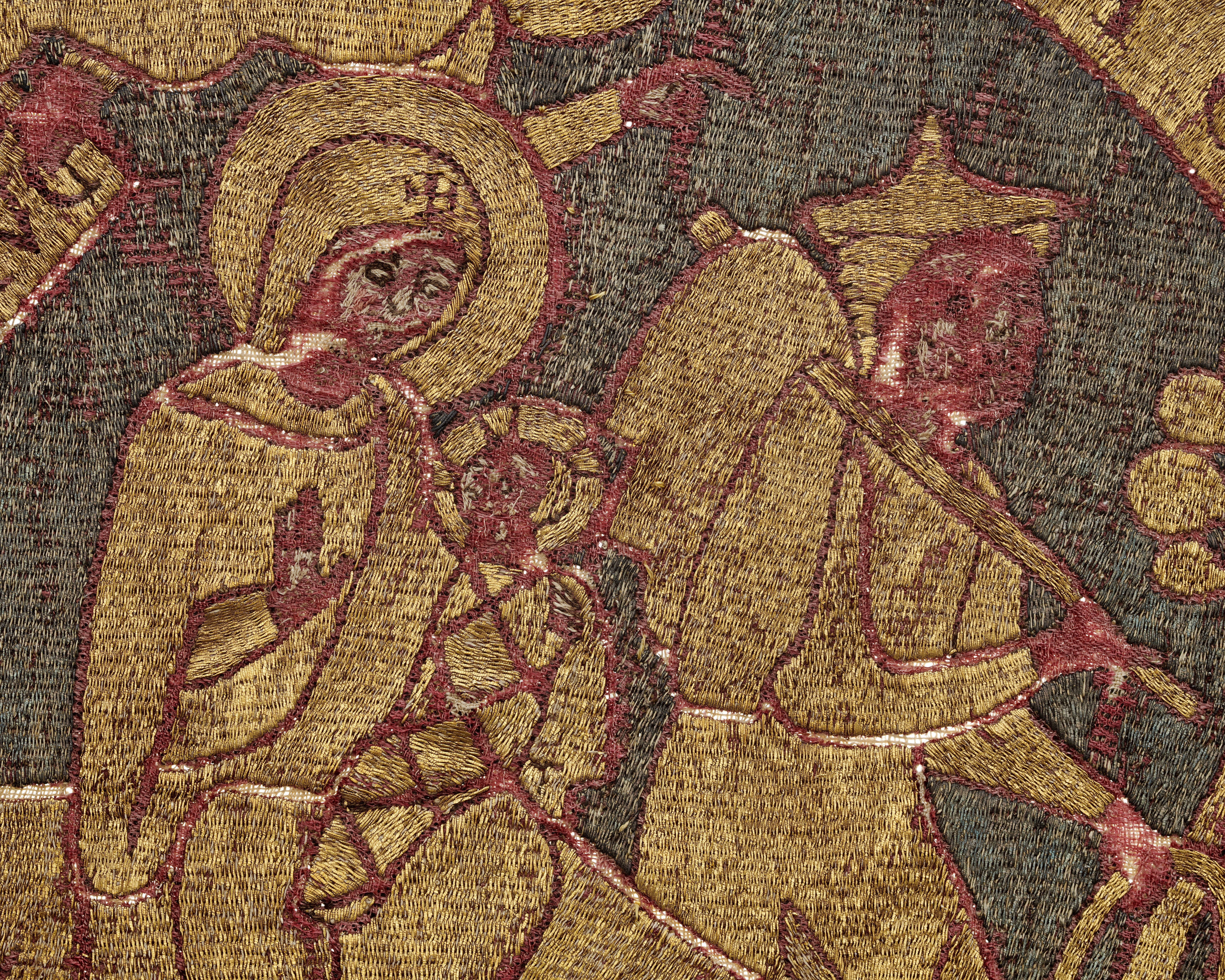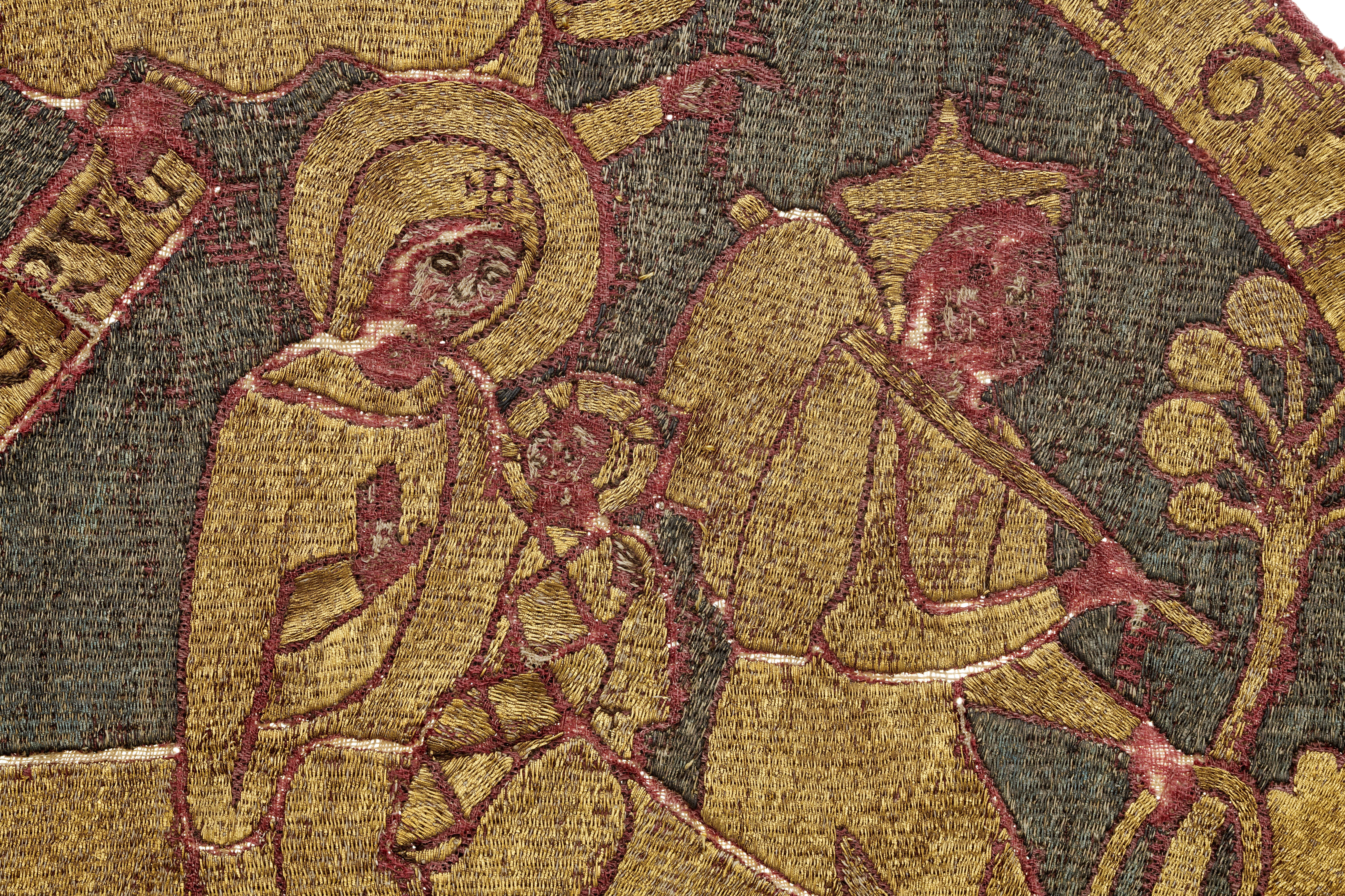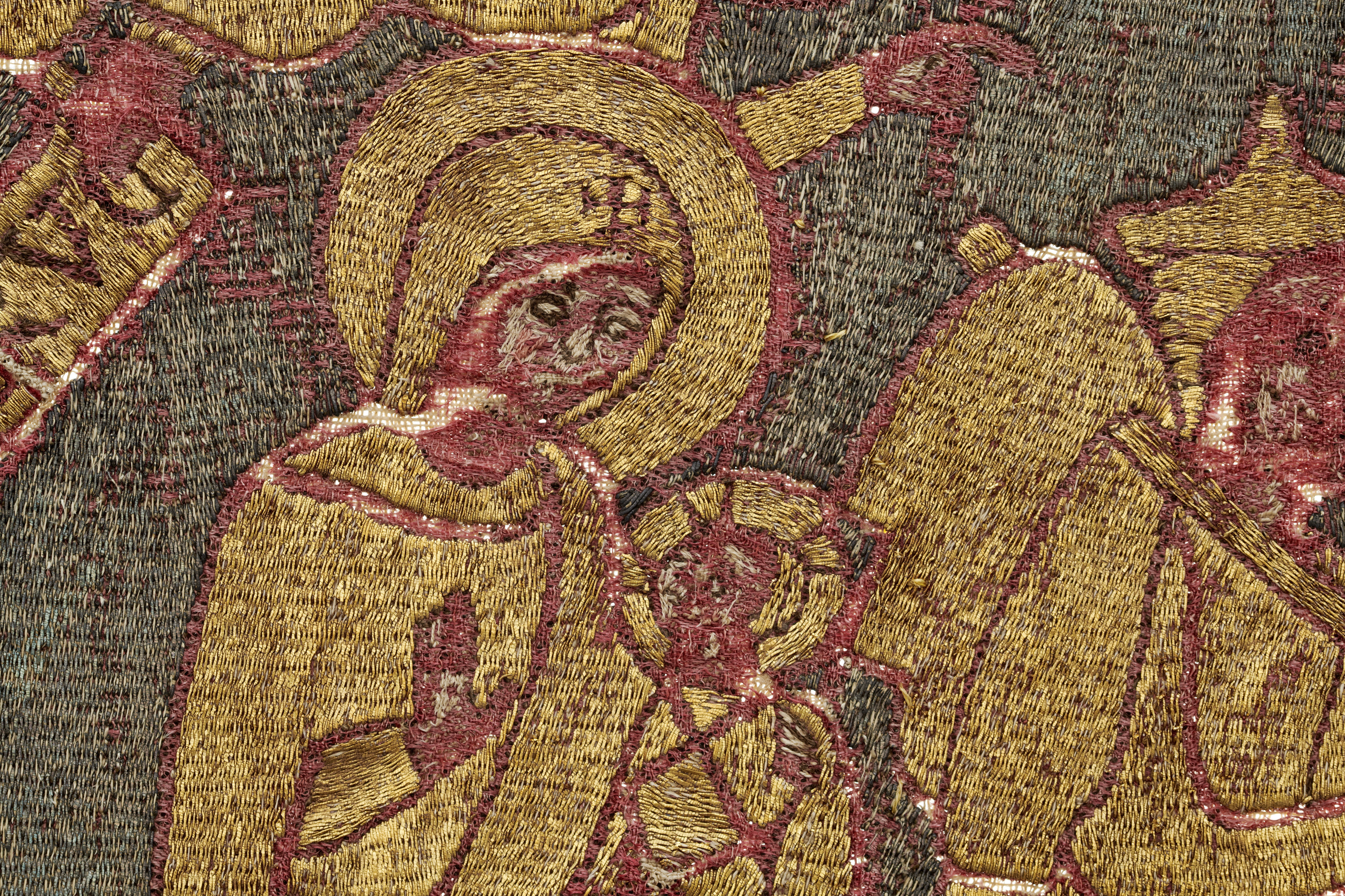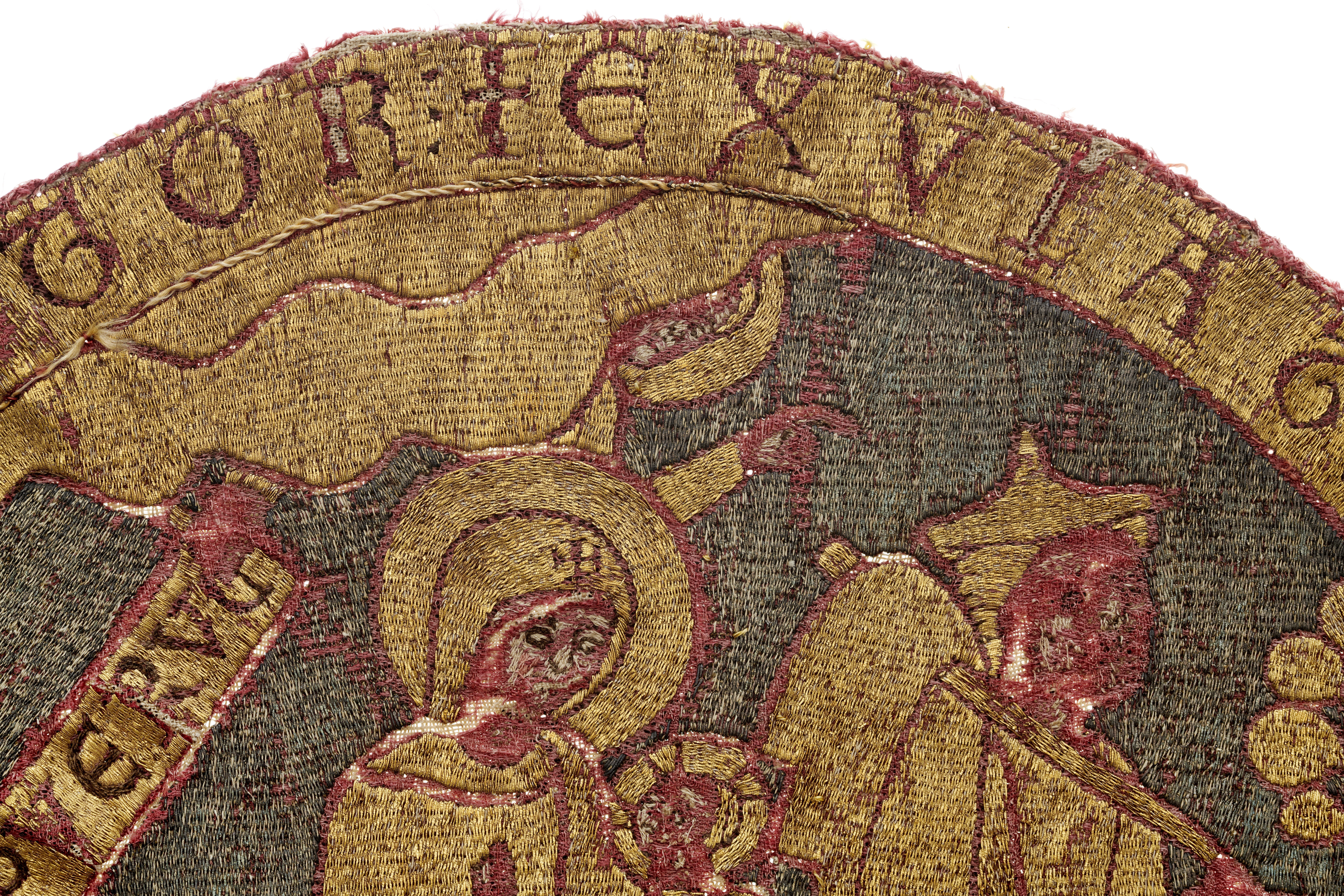 Guld-, silver- och silkebroderad rundel på röd samitum med framställning av Kristi liv. Broderiet utfört i neddragen läggsöm och klyvsöm. Troligen franskt arbete, sent 1100-tal.
