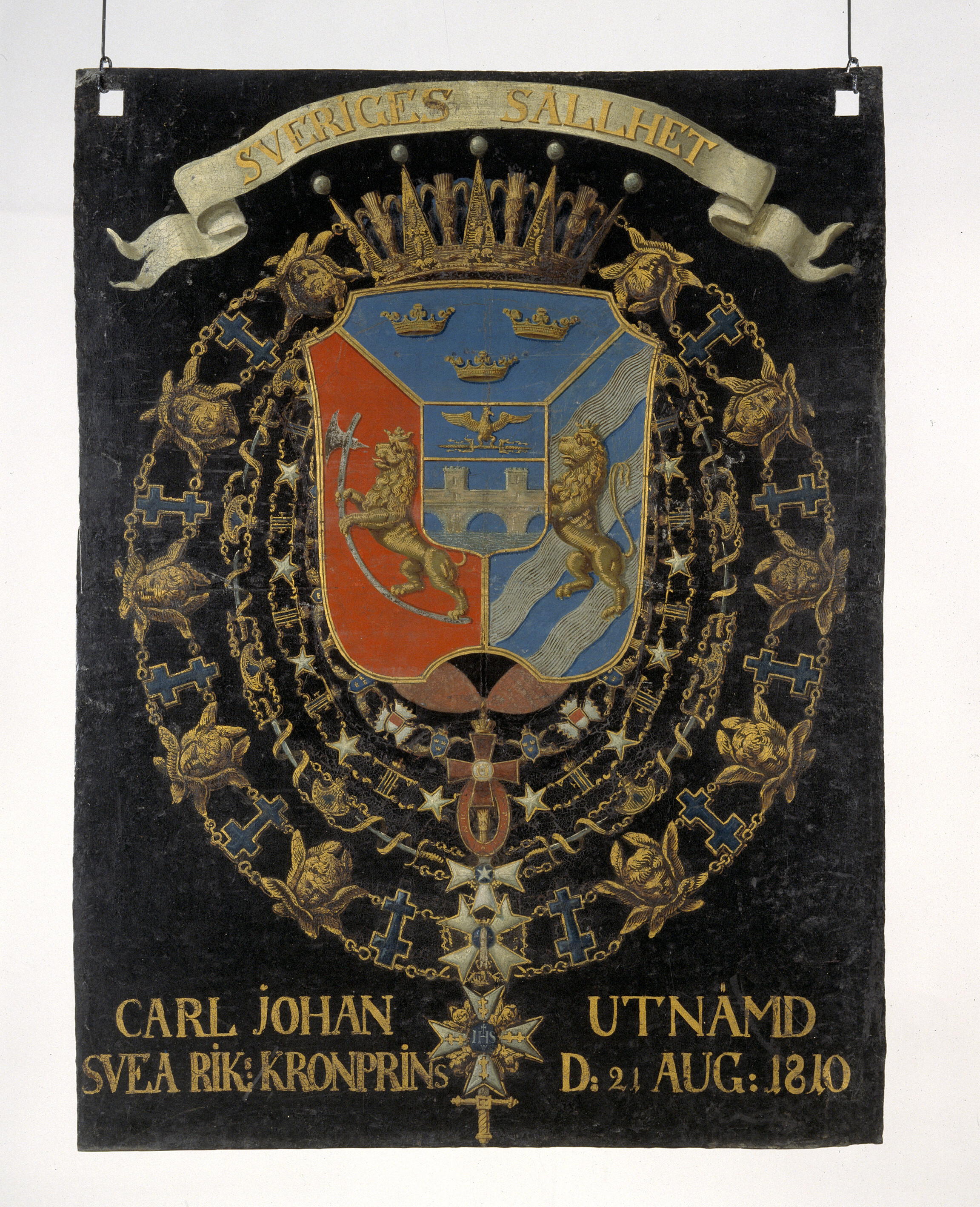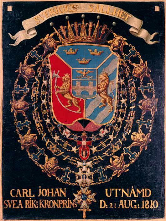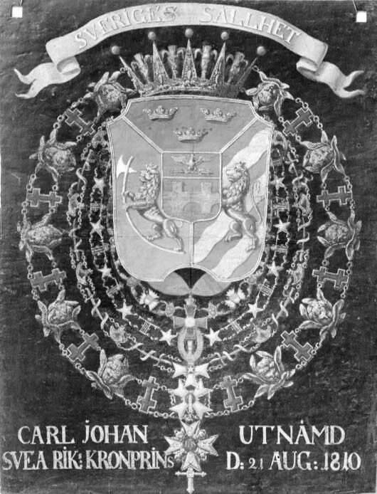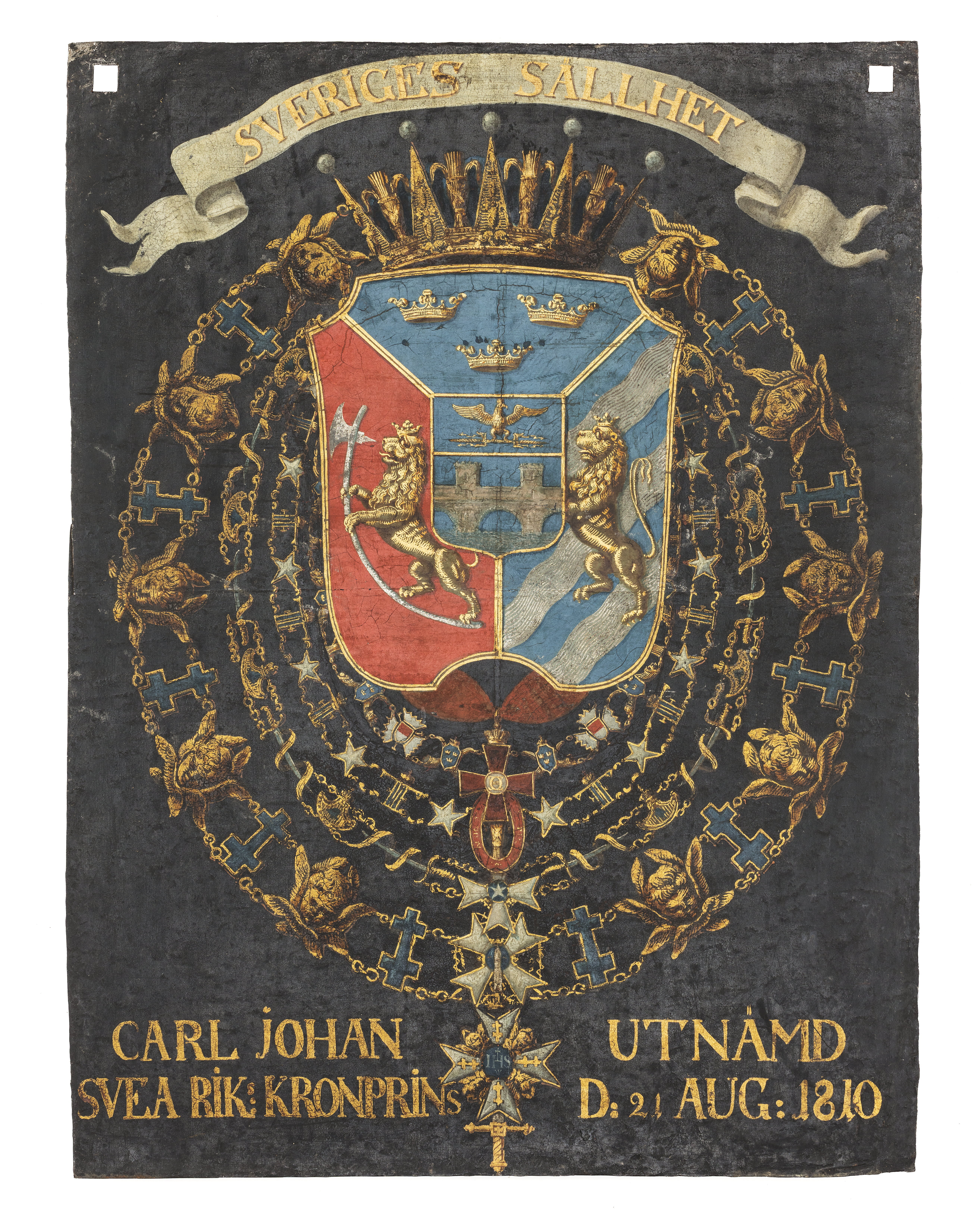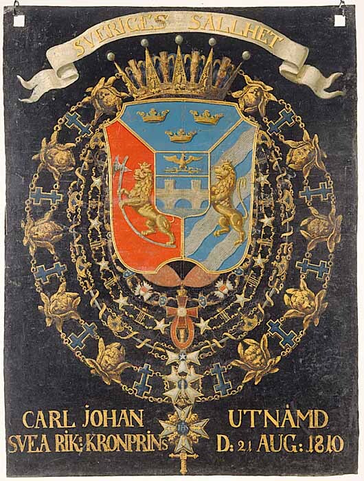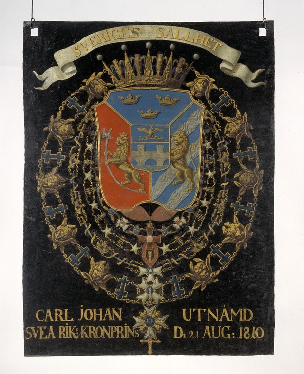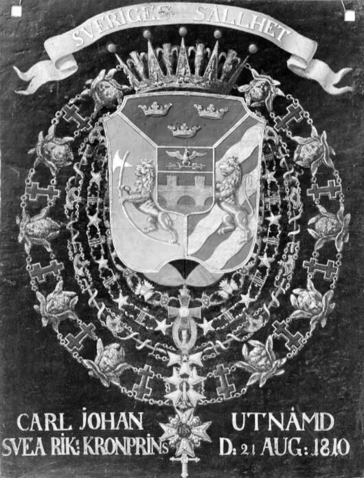 Serafimersköld för konung Karl XIV Johan av Sverige som kronprins av Sverige-Norge 1810-1818, urspr.upphängd i Riddarholmskyrkan, Stockholm.