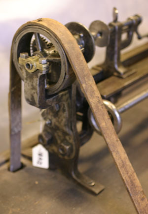 Drivanordning bestående av brunmålat trähjul, diam 510, b 60 mm, tillverkat av sågad stock. Axel av inåt i änden vinklad stålstång, diam 18 mm. Stången fäst med stålbeslag i arbetsbänkens tväslåar. Runt hjulet och genom två hål i bänkens skiva ett ljusbrunt läderband, b 23 mm. Bandet löper även upptill runt svarvens drivhjul.