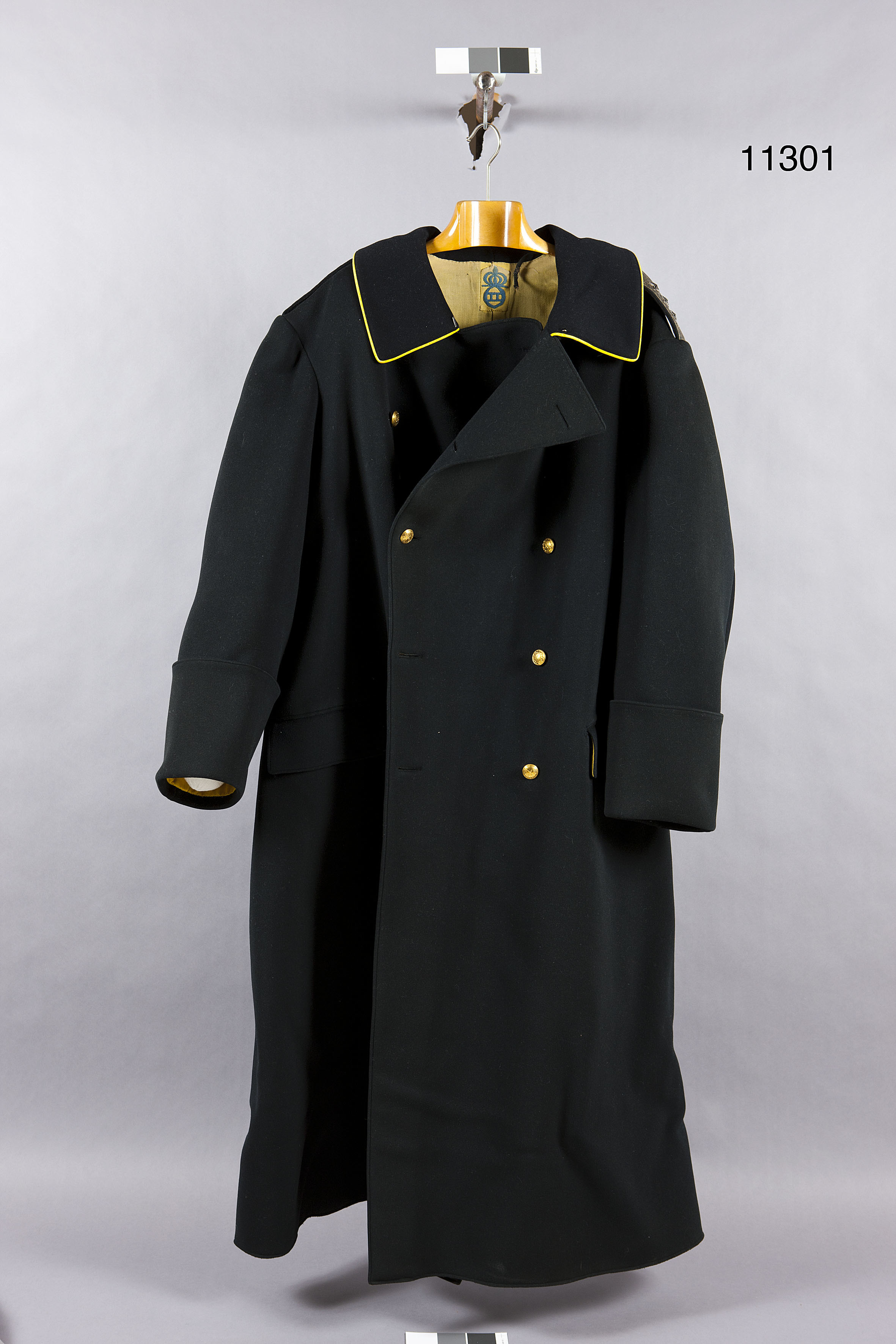 Kappa av mörkgrått kläde tvåradig med fällkrage. Rakskuren. Fem knappar i varje rad för generalitet, d: 22 mm med firmanamn på insidan: "SPORRONG & CO, STOCKHOLM". På en av knapparna: "C. SPORRONG, STOCKHOLM". Axelklaffar med generalsgalon samt tre broderade silverstjärnor. 160 mm breda uppslag. Två ytterfickor med rakskurna ficklock, den vänstra med hål för sabelrem. Runt kragen gul passpoal. I ryggen sprund med dold knäppning med sex sidenklädda knappar d: 13 mm. Ovanför sprundet, slejf knäppt med två vertikalt placerade knappar. Foder av gult linne med två innerfickor. I mitten nedanför kragen, fastsydd rektangulär tyglapp med applikation i form av Oscar II:s monogram nedanför kunglig krona.