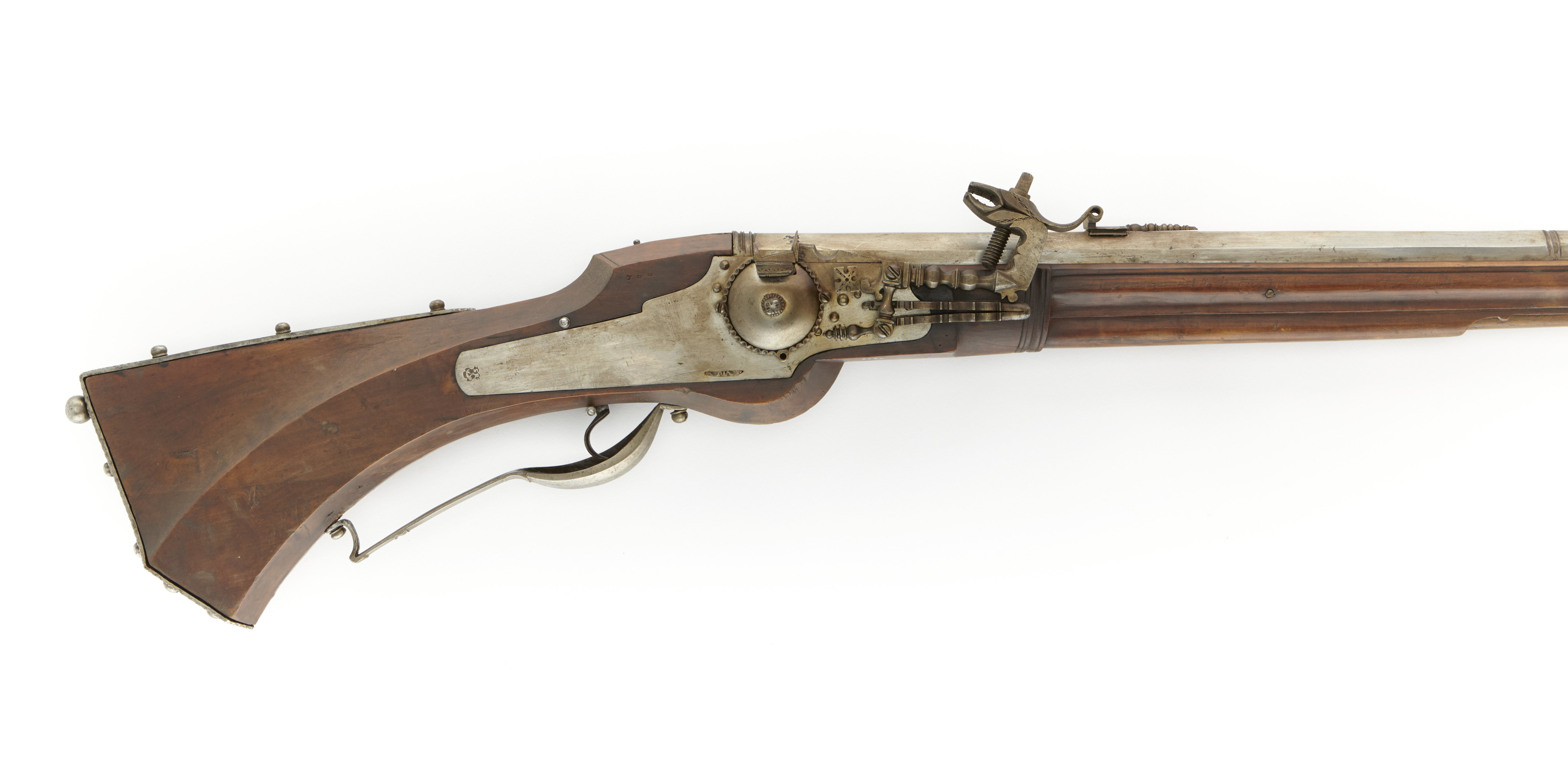 1710 års inventarium p. 4, rum I "51-700-1 Stoor Hagelbyssa med Hiulåås brett anslag". Rund, över kammaren åttkantig, slätborrad pipa. På kammaren 2 ggr stämpel med SR över jakthorn (Stöckel nr 4532). Ståndsikte av stål, med framförliggande profilerad tapp. Knoppkorn av mässing. Hjullås. Låsbleck av tysk typ - bakåt avsmalnande genom två fall. På låsbleckets bakre del stämpel med SR över jakthorn (Stöckel 4532). Hög, kullrig hjulkapsel, fastskruvad medelst tandad ring, kl.3,6,9.Låg, rundad krutskärm. Fyrklöverliknande tryckknapp. Hane med lös överkäke. Hankropp och hanfjäder starkt profilerade. Hel stock av brunt trä. Karbinkolv, utsvängd för hjulet (låsblecket dock ej utsvängt). Bakplåt av stål, vilken fortsätter upp över hela kolvryggen. Stödkula av stål. Två låsskruvar med hornbrickor. Tre pipstift av trä. Framstocken med längsgående räfflor. Näsband samt en + en rörka av stål. Karbinvarbygel, utsvängd och breddad vid avtryckaren. Muskötavtryckare, halvmånformigt fingergrepp. Tillbehör: Laddstock med doppsko av stål. Märkt: 700, ovanför låsblecket, stanstyp 5376. 9, på anslaget, med bläck.