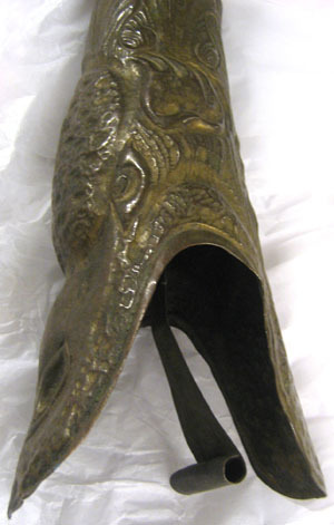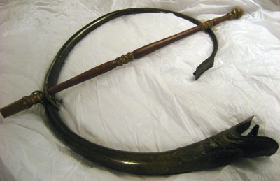 Böjt horn av mässing. Ihopsatt av två delar. Klockstycke i form av drakhuvud med öppen mun med en halvt upprullad tunga av metall i gapet. Upphöjd ornering. Munstycke saknas. Rektangelformad platta i anblåsänden längsgående, fäst med lödning ovanpå, med avfasade hörn. Fyra hål längra ena långsidan, fem längs andra. Plattan mäter i längd: 104 mm, bredd: 54 mm. Mitt över hornet är en rak, svarvad trästav fäst runt tonröret med metallband i gulmetall, som löper genom trät och är nerböjda på andra sidan. Staven är målad i gult och rött, avslutas med en knopp upptill, och har en rak avslutning nedtill. I båda ändar ett litet hål i mitten. Snöre runt nedre fästet, flätat i grönt och beigefärgat garn. Stavens längd: 995 mm.
