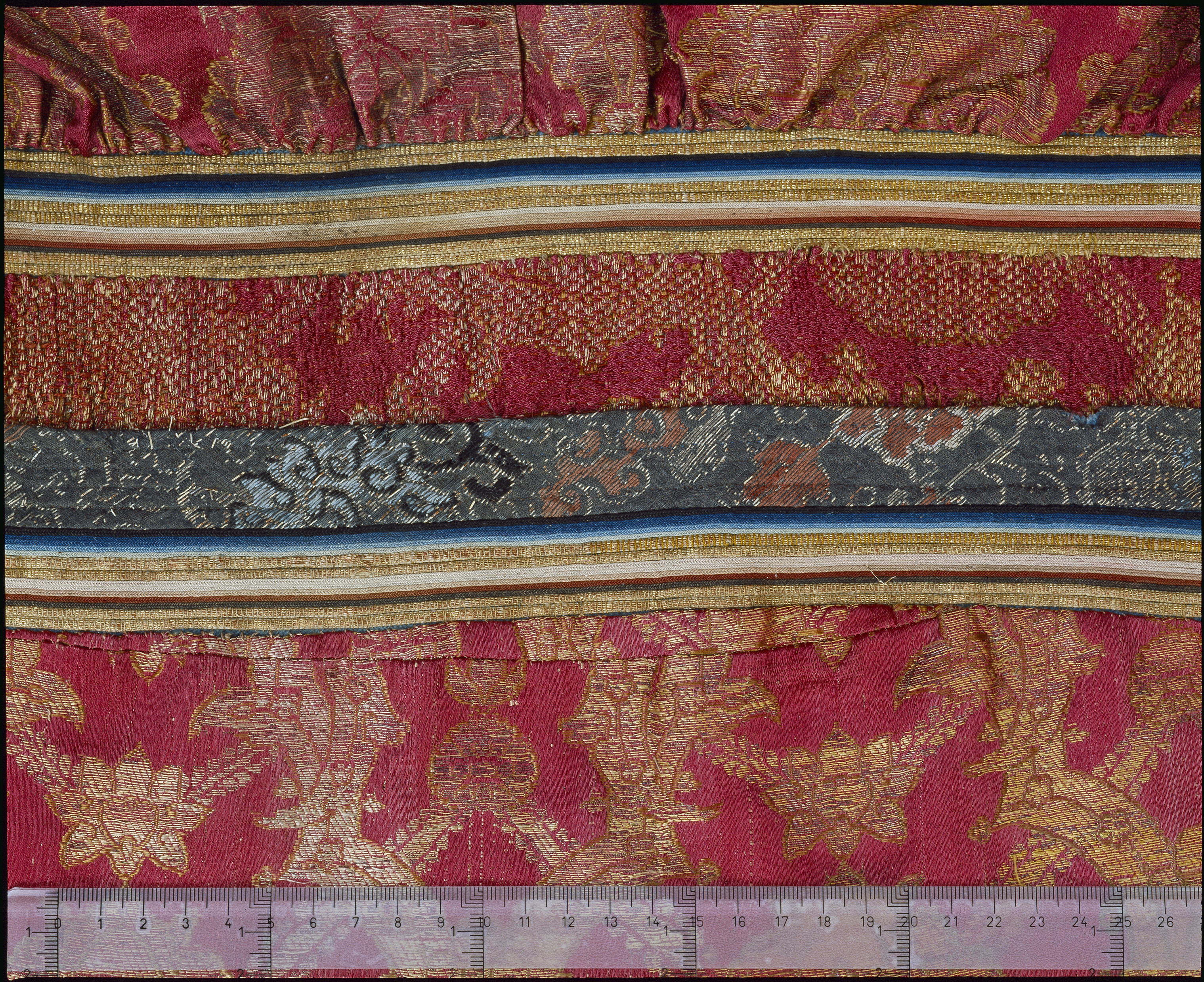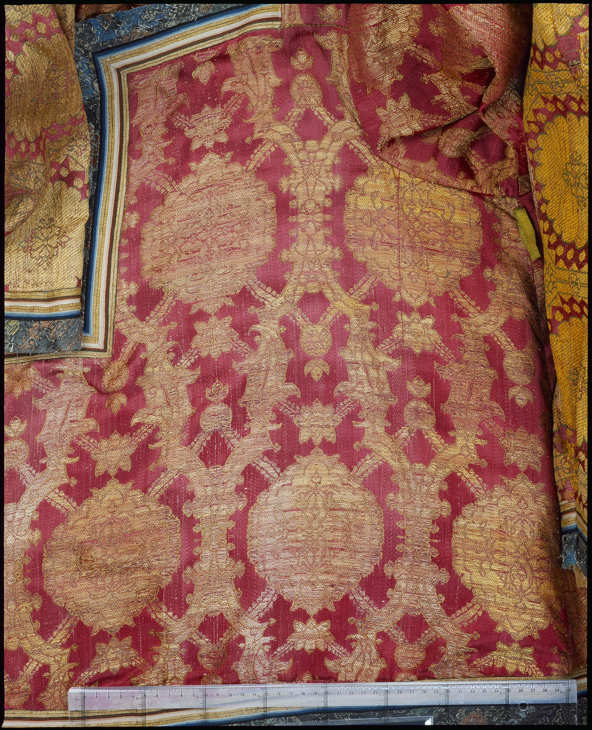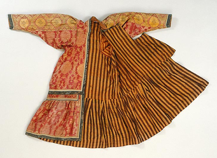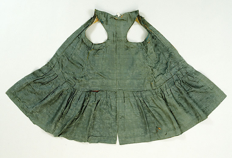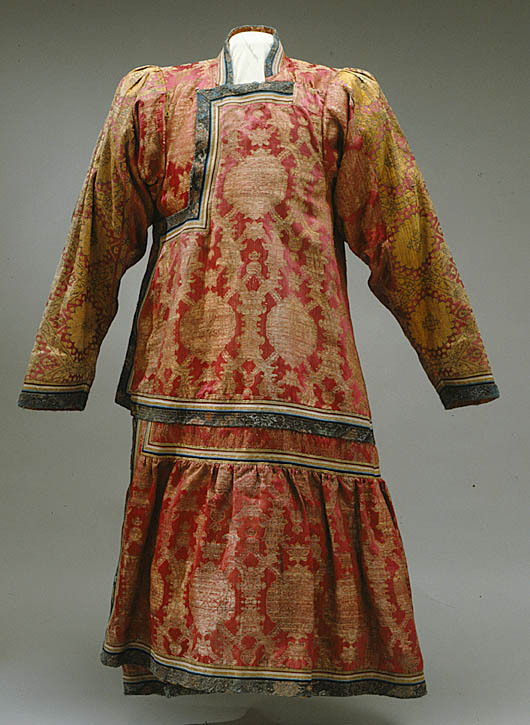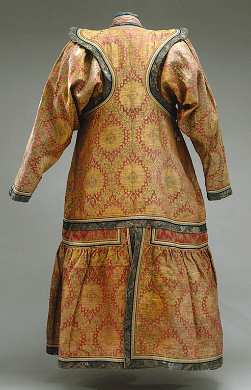 Dräkten hemfördes av Johan Gustaf Renat och hans hustru Birgitta Scherzenfeldt efter långvarig fångenskap hos kalmuckerna i Djungariet, Centralasien. Kaftan, så kallad deel, långärmad med stånd-krage, avskuren med rynkad kappa nedtill. Knäppes på höger axel och sida med tränsar och silverkul-knappar. Yttertyget liknar rockens, men har större varptäthet, botteninslag av silke, mönsterinslag broscherade av guldtråd. Foder randigt i rödgult och rödbrunt av tre sidentyger. Båda dräktdelarna kantade med brokigt kinesiskt siden, garnerade med guldränder och snoddar. Guldränderna består av guldpapper virat kring gult silke, fastsydda med gult silke, c 1 stygn/mm. Snoddarna är av kulört silke med olika tvinning och snodd nersydda mot blått underlag.
