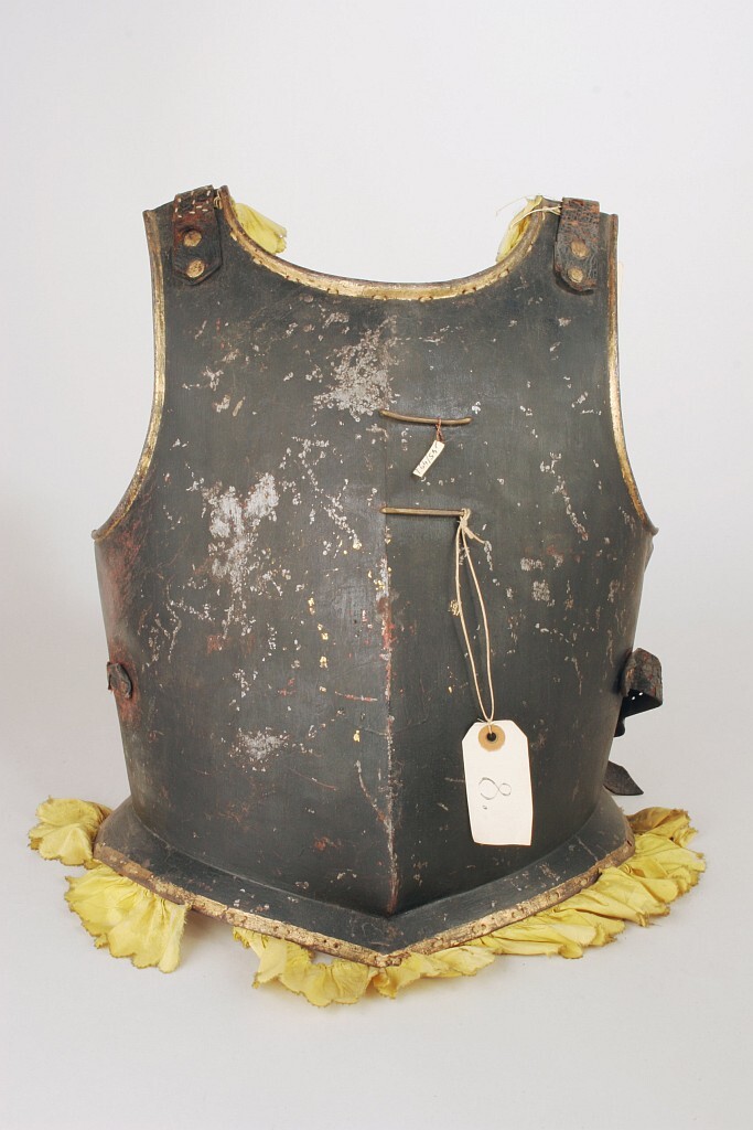 Av järnplåt. Svartmålad med förgyllda kanter. Ursprungligen dekorerat med friherrliga ätten de Geers vapensköld: fem rutor. På bröstet två tunna, 50 mm långa mässings krampor. Nertill kantat med gult rynkat siden. Invändigt fodrat med gult ylletyg. Har brukats tillsammans med hjälm 29256 av friherre Anton de Geer på Adolf Fredriks torg 1777. Senare använd av greve Gustaf Löwenhielm på Drottningholm 1799 och 1800 - då med hjälm 29250 samt hjälmprydnad 29251.