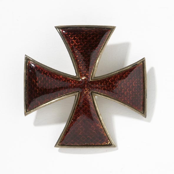 Mantuakors av förgyllt silver, på framsidan karminröd, genomsynlig emalj över fiskfjällsdekorerad botten. På baksidan ristat 2 ggr: G. Säkerhetsnål.