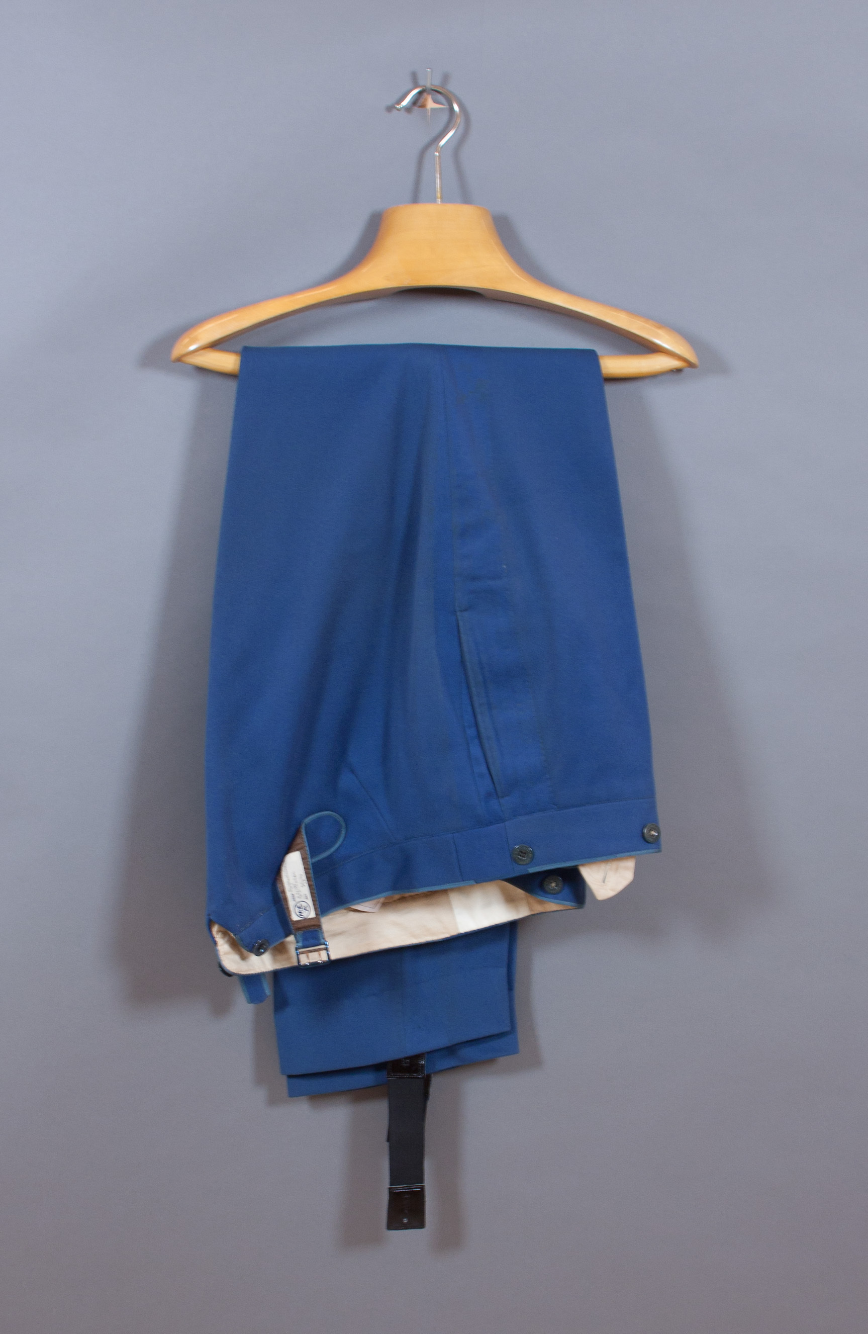 Långbyxor av mellanblått kläde knäppta med gylf med fem blå knappar, d: 14 mm, med firmanamn: "MILITÄRBOLAGET". Linningen med sju knappar, d: 17 mm, med firmanamn: "MILITÄR EKIPERINGS A.B.", v-format sprund baktill med spänntampar, på insidan av den ena etikett med firmamärke: "MEA // HERR hofstallmästare C.G. Platen // DAT. 24. 1. 1911." En bakficka. Fickor i sidsömmarna, utmed dessa märken efter breda galoner (numera bortsprättade). Nedtill hällor av svart resår, 32 mm breda, kantade med lackskinn, knäppes på byxbenens insidor med små blå knappar. Foder i linningen av gulvit bomull. Fickor av grå bomull.