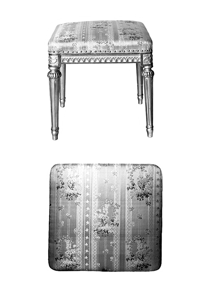 TABURETT, svenskt arbete från 1780-90-talet. En av två st inköpta av Wilhelmina von Hallwyl 1897 hos antikhandlare Sigrid Sundberg, Stockholm, för 20 kr. H 42 L 42,5 B 40. Svarvad, snidad av förgylld björk. Klädd med sidentyg, s.k. drogett, tillverkad på beställning hos firma G & R Hamot, Paris. Del av möbeluppsats VI:II:A.a.14. bestående av två taburetter, en s k puderstol och två stolar.