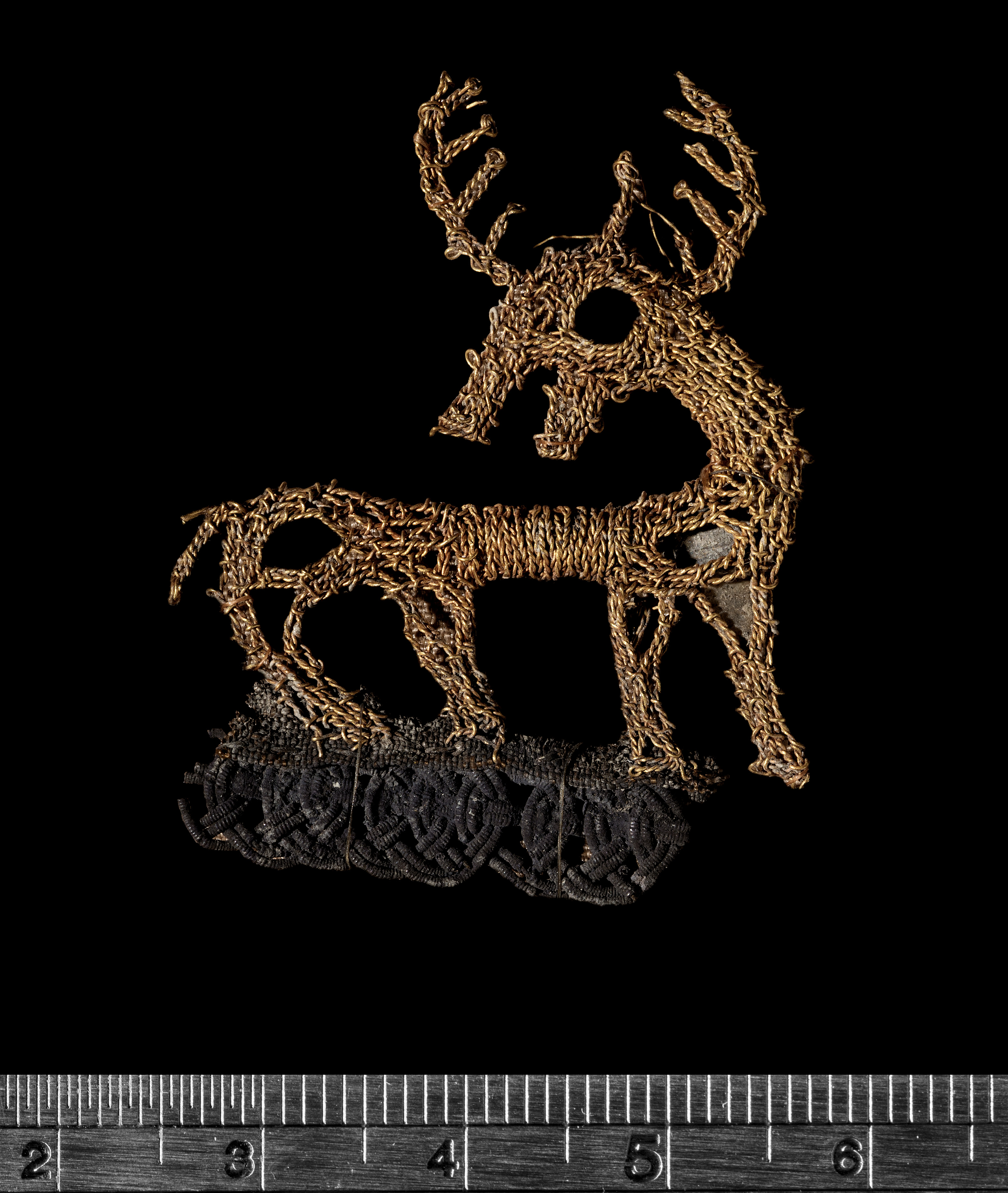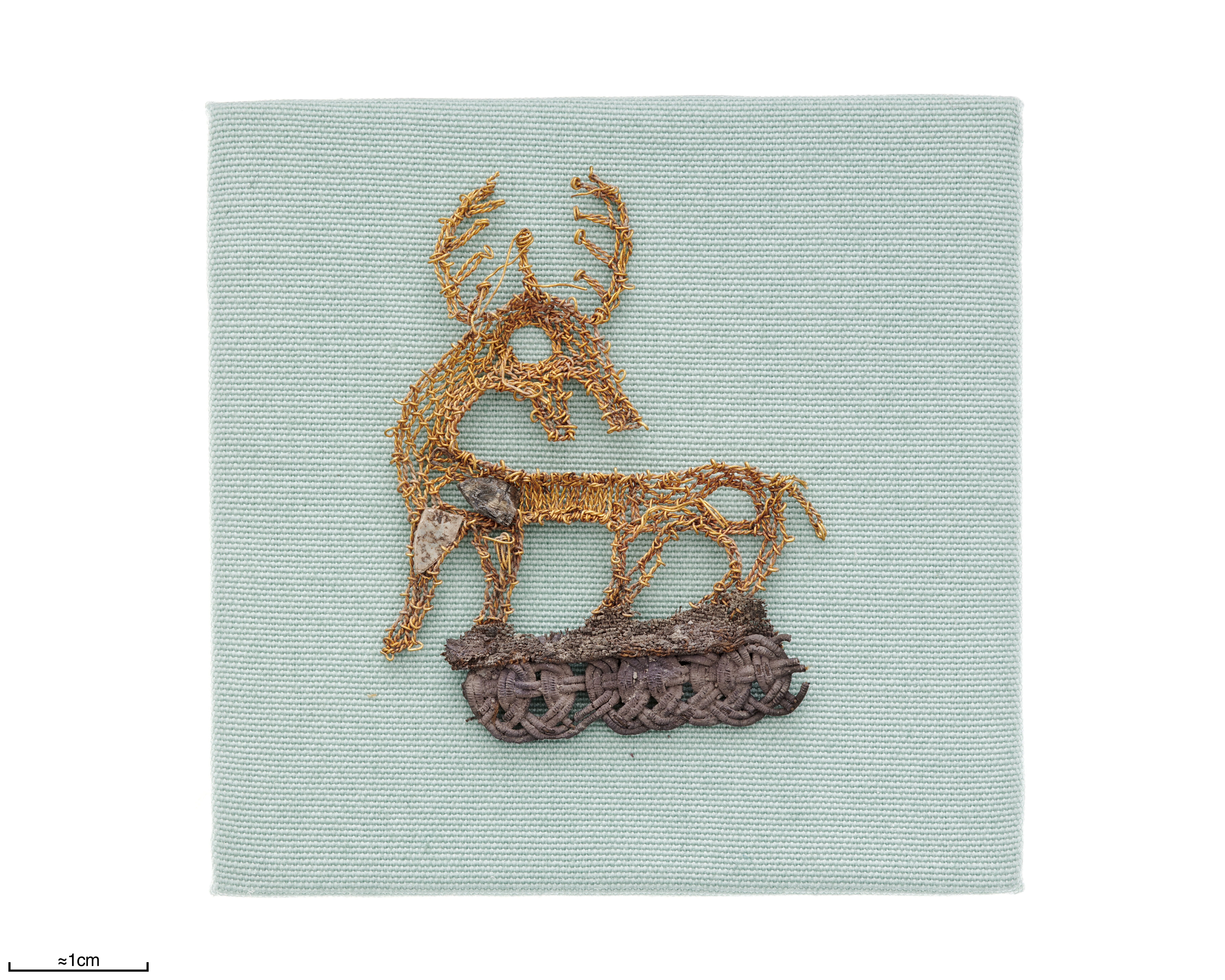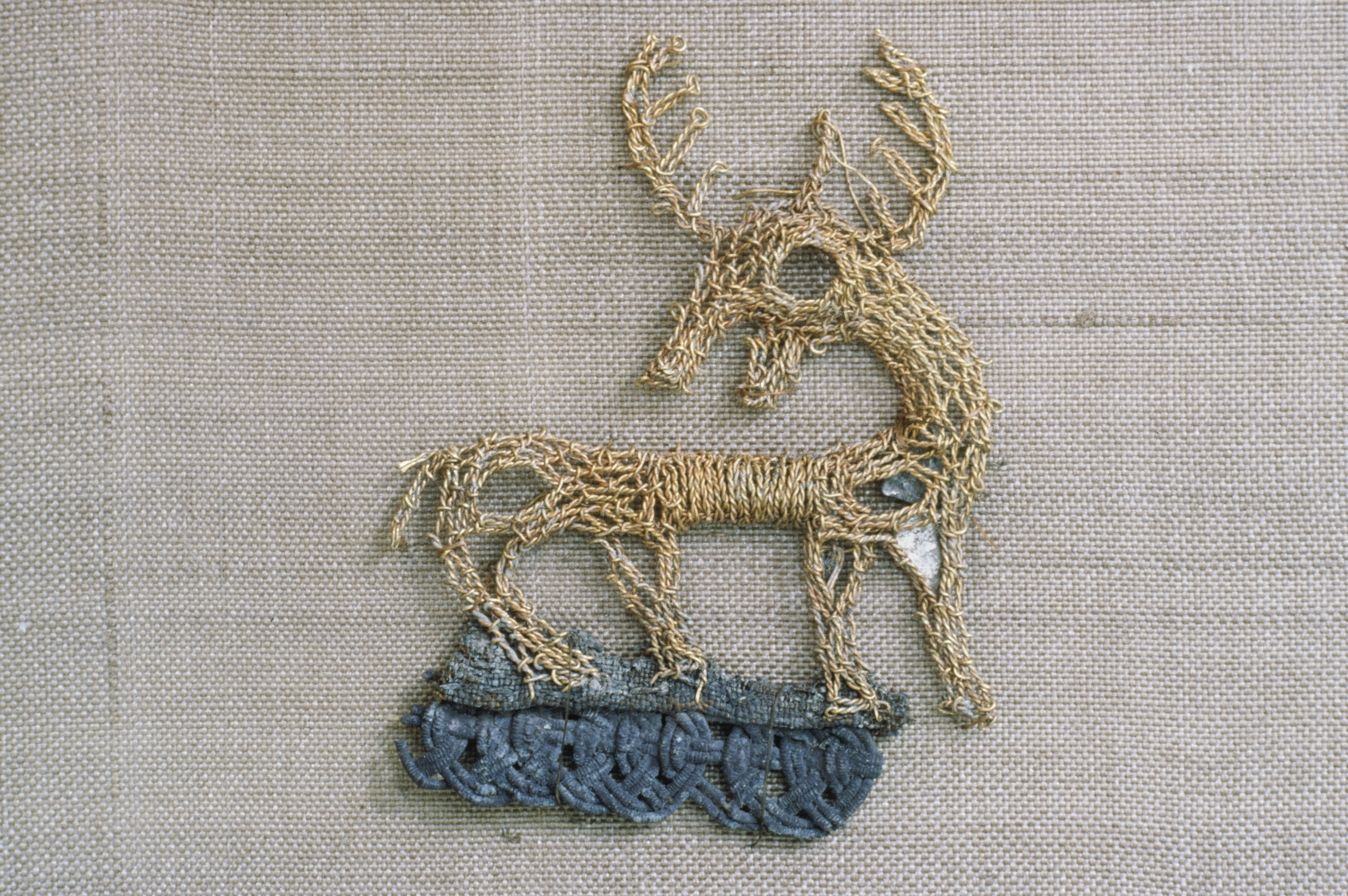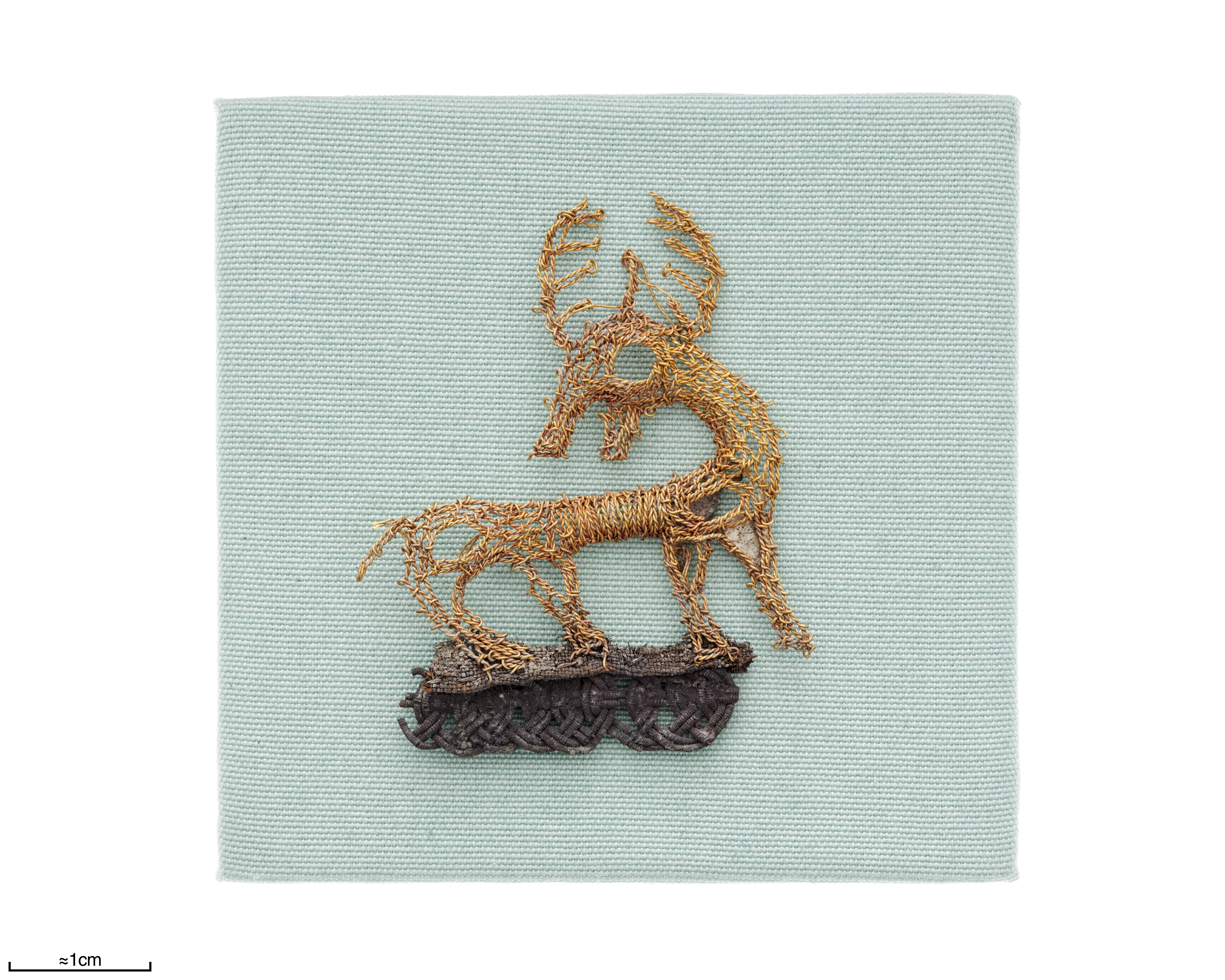 ”Guldhjorten”. Broderi i slingstygn ["Stickerei in Schlingenstich"] (schema a och c) av guldtråd och med inlagda glimmerbitar på underlag av fin taftsilke (S 1), av vilket dock endast ett litet fragment finns kvar. Hjorten har en kraftig, bakåtböjd hals och ett stort huvud, som delvis kröns av ett horn med 5 till 6 grenar, delvis av en tagg som reser sig rakt upp från hjässan. Den första omgången stygn (som nu bildar öglor på undersidan) följde konturerna. Vid hornens spetsar måste man alltid göra två stygn i tyget för att fästa följetråden. För magen användes en annan metod. Med hjälp av två stygnrader vid varje kant fördes tvärtrådar med växlande tvinnningsriktning fram och tillbaka och spändes. Nålen gjorde två stygn varje gång. Både kroppen och huvudet och halsen är lite rundade, vilket tyder på att tyget har fyllts. Totalt finns det 7 ”hål” för glimmerskivor (ett på varje ben och öga samt två på kroppen), men endast två av dem finns kvar på sina ursprungliga platser. Arbetet med guldhjorten visar större skicklighet än med silverhjorten, St 17, även om tekniken är ungefär densamma. Användningssyftet var säkert detsamma som för silverhjorten. Silkesfragmentet som fanns kvar vid hjortens fot bevarades genom oxidation av en silverkant, P 12, som var insydd som kantdekoration mellan två tyglager. ”Ändstycket” bestod alltså av dubbelt silke.