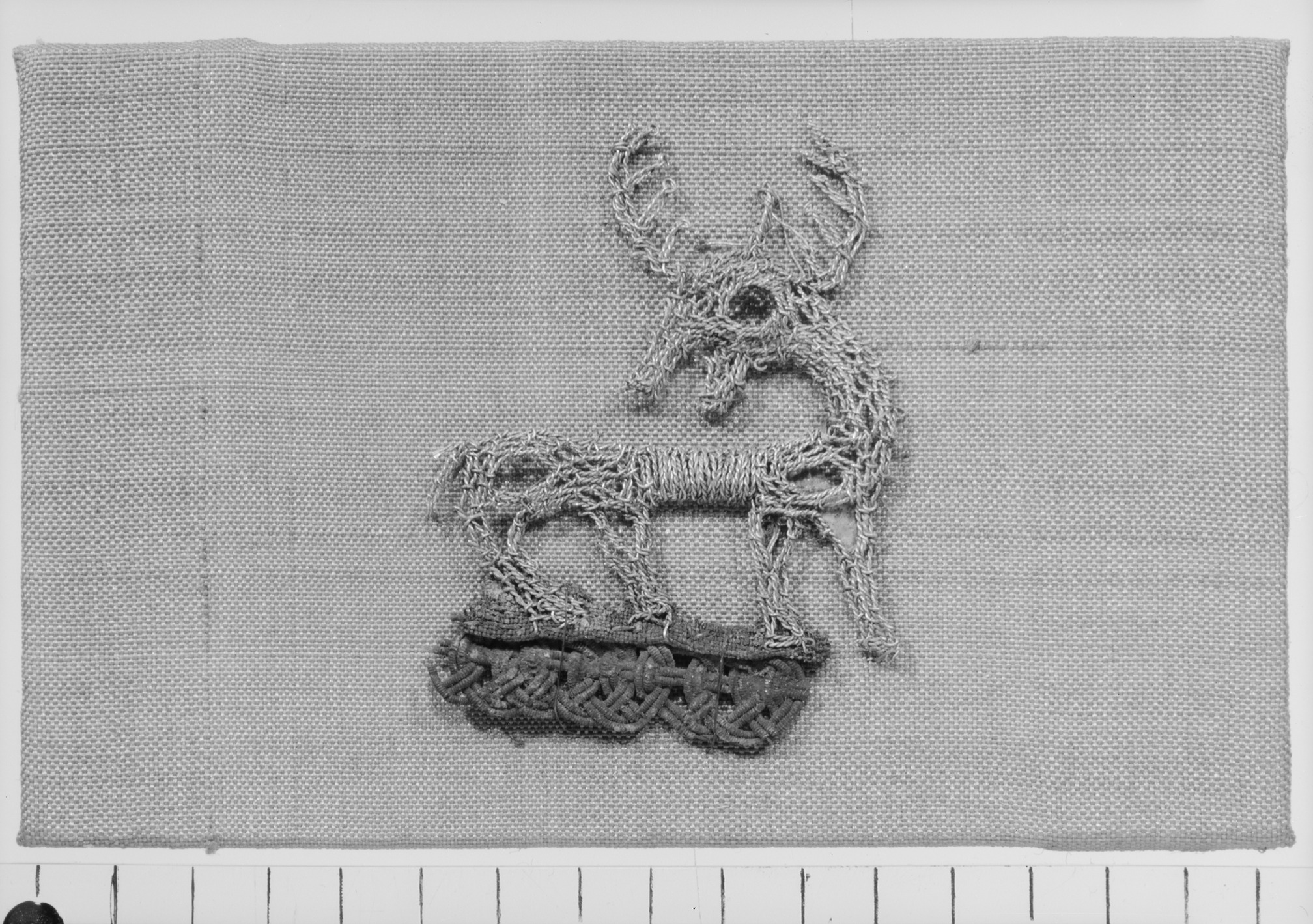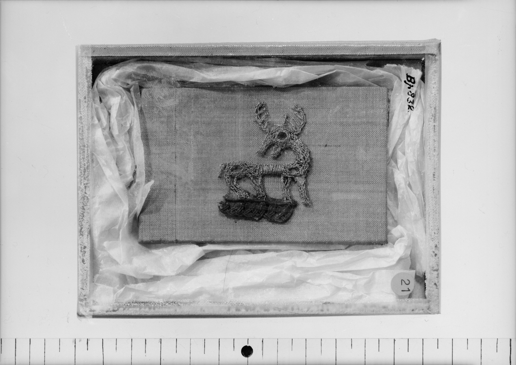 Broderad hjort i guldtråd samt passamentarbete i silver. Taf: 36:1-2