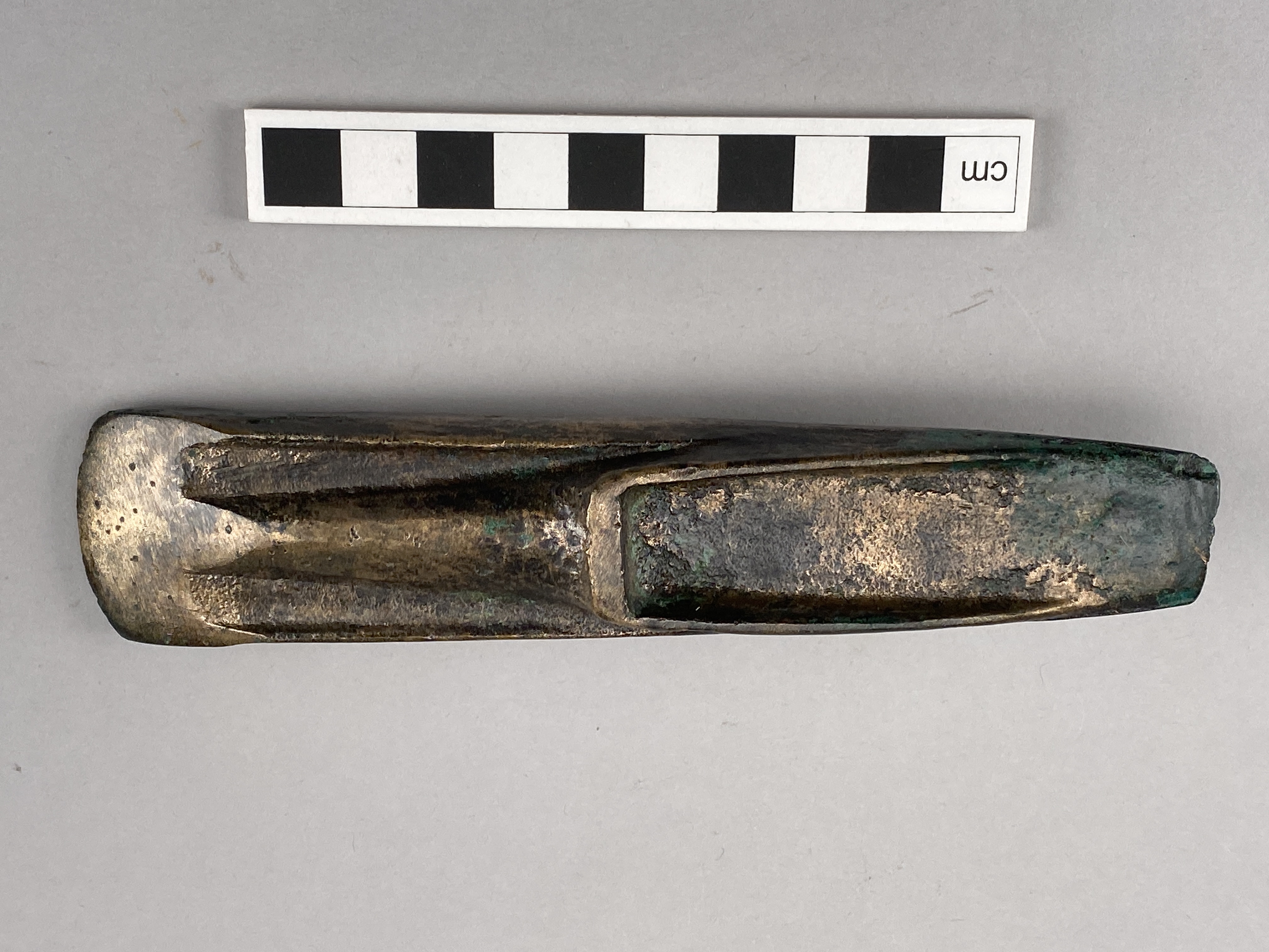 Avsatsyxa av brons med H-formig sektion på skaftfästet. På klingans bägge sidor finns en bred vertikal ås och fåror längs kanterna. Eggpartiet är svagt utsvängt.
