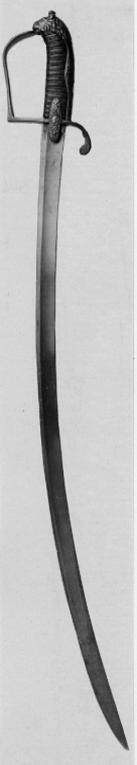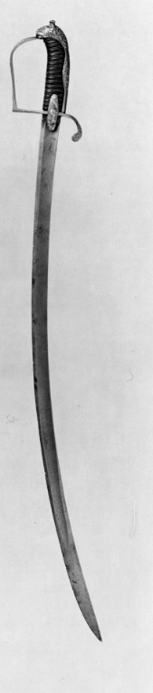 Fäste av reliefornerad, förgylld mässing. Kappa framåtböjd, formad som ett lejonhuvud med man, som direkt övergår i en konvex, vid mitten något utvidgad ryggskena; mitten med ett rokokoornament, som upptill övergår i en trofégrupp. Handbygel flat, övreänden intappad i kappans nederdel (lejonets gap) och bågformigt övergående i en rak del, som rätvinkligt ansluter till den raka, främre parerstången. På utsidan av handbygelns överdel ett långsträckt rokokoornament, på nederdelen mindre ornament, en rocaille, varöver ett bladornament. Bakre parerstång bågformigt nedåtböjd med rundat skivformig ytterände, på sidorna ornerade med graverade bladornament. Styrskenor av utdraget oval form, över- och nederdel av samma längd, båda med ett hela ytan täckande rokokoornament. Kavel klädd med svärtat skinn och lindad med tvinnade, tunna trådar av koppar (spår av förgyllning). Klinga böjd, eneggad och med bred, grund hålkäl. Utan ornering.